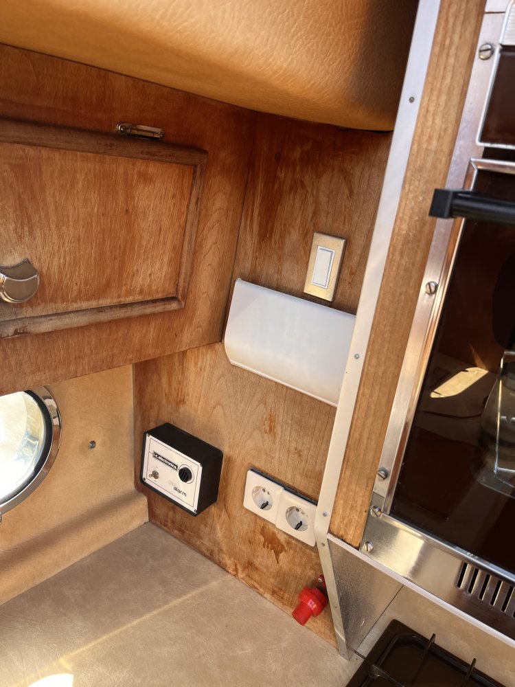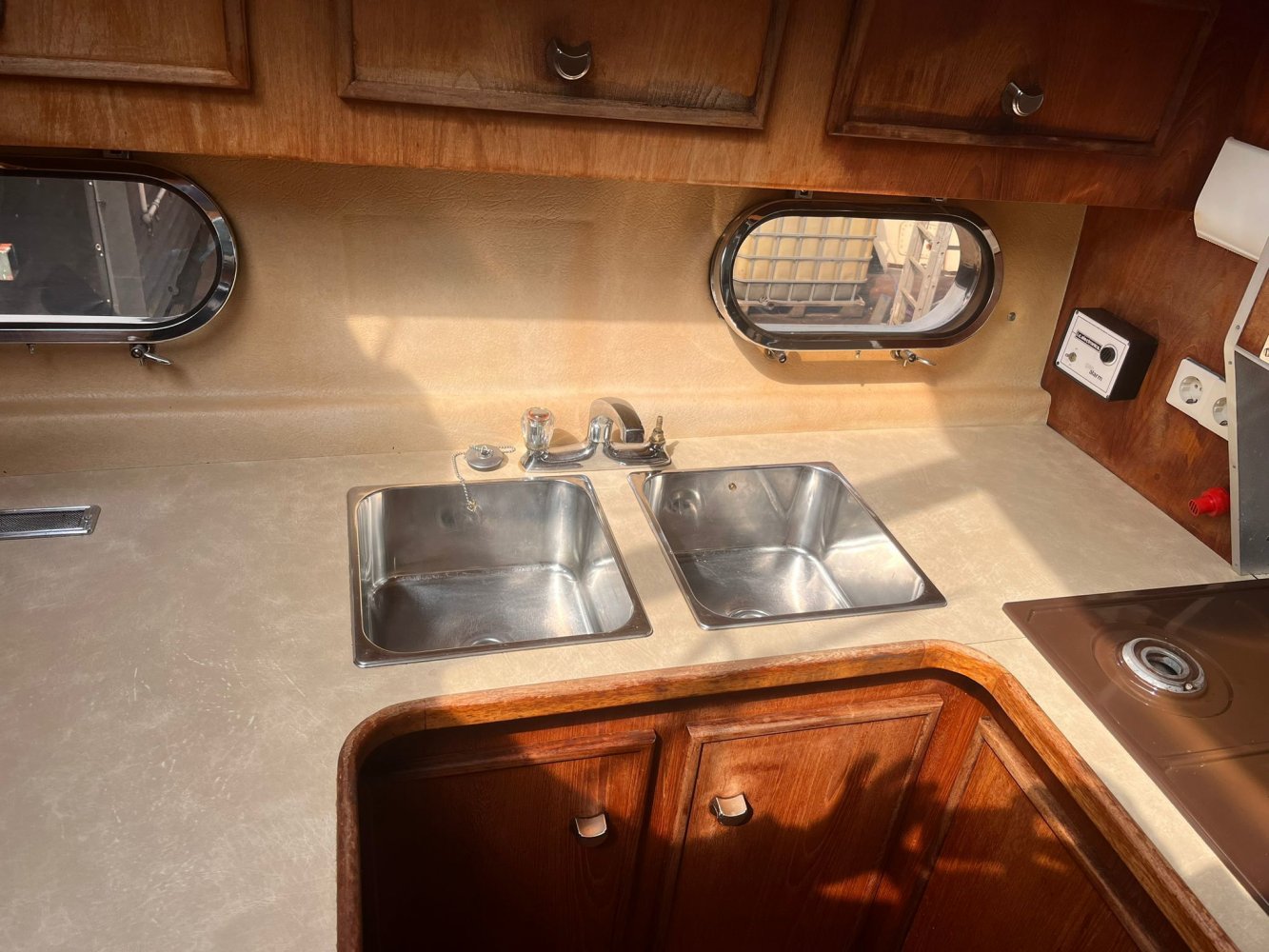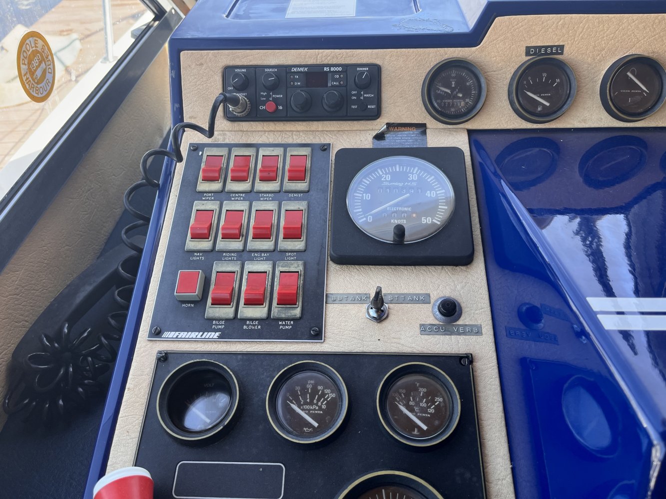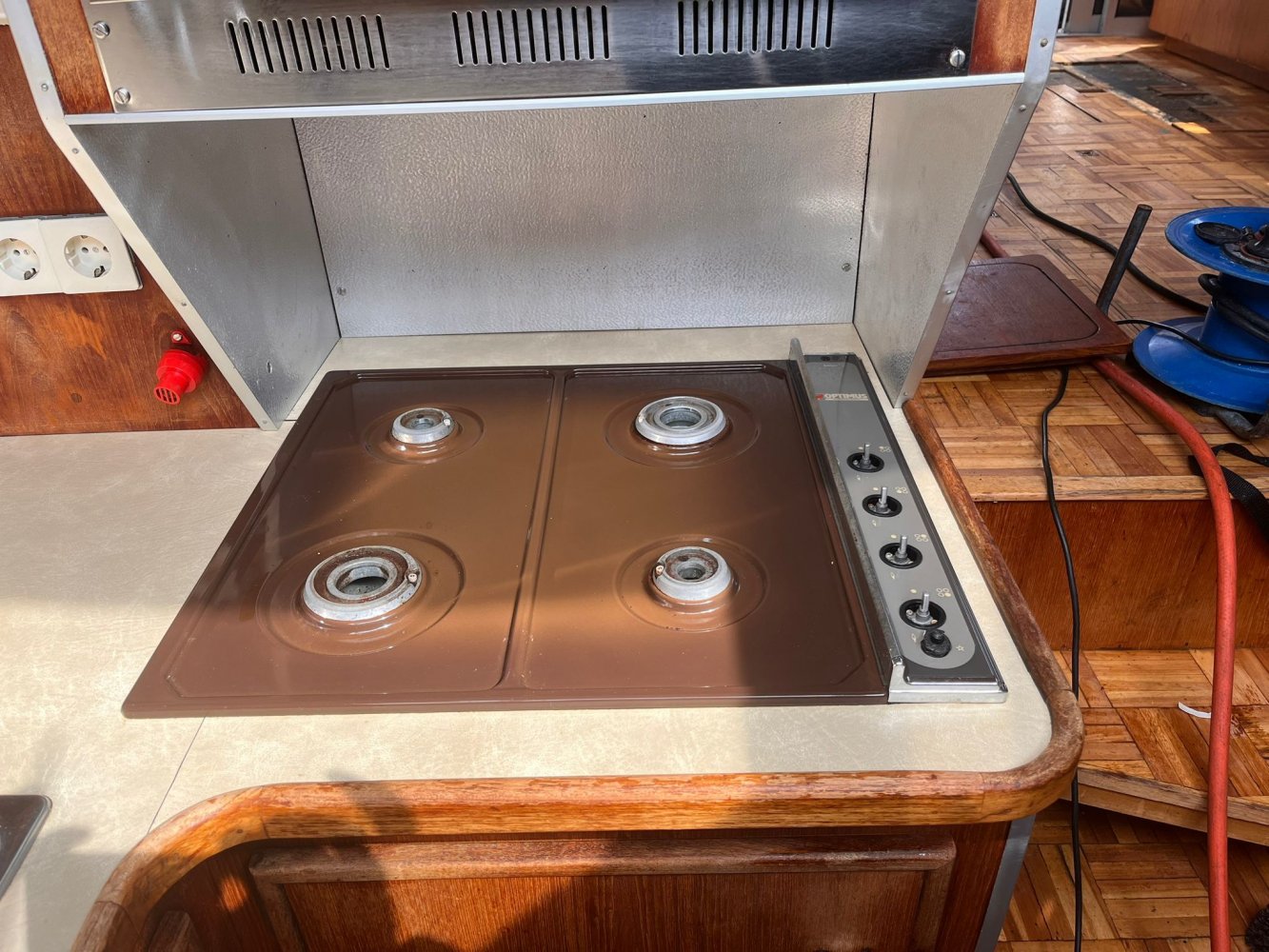 Een mooi groot uitgebreid en stoer dashboard geeft u rondom goed zicht in verband met alle ramen. Het mooie grote dashboard is geweldig: al die klokjes, meters en schakel knopjes. Meteen naast de stuurstand is handige keuken ingebouwd. Een mooie U-vormige keuken met allerlei extra’s. Veel bergruimtes en een mooi 4 pits kooktoestel. Dubbele RVS spoelbak met RVS kraan. Grote RVS bakoven is aanwezig, mede als extra afzuiging. Het schip heeft veel 220 volt stopcontacten, een gasalarm en extra verlichting in de keuken. 105 liter koelkast van Waeco.