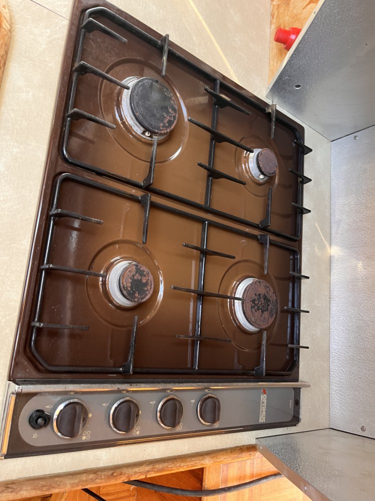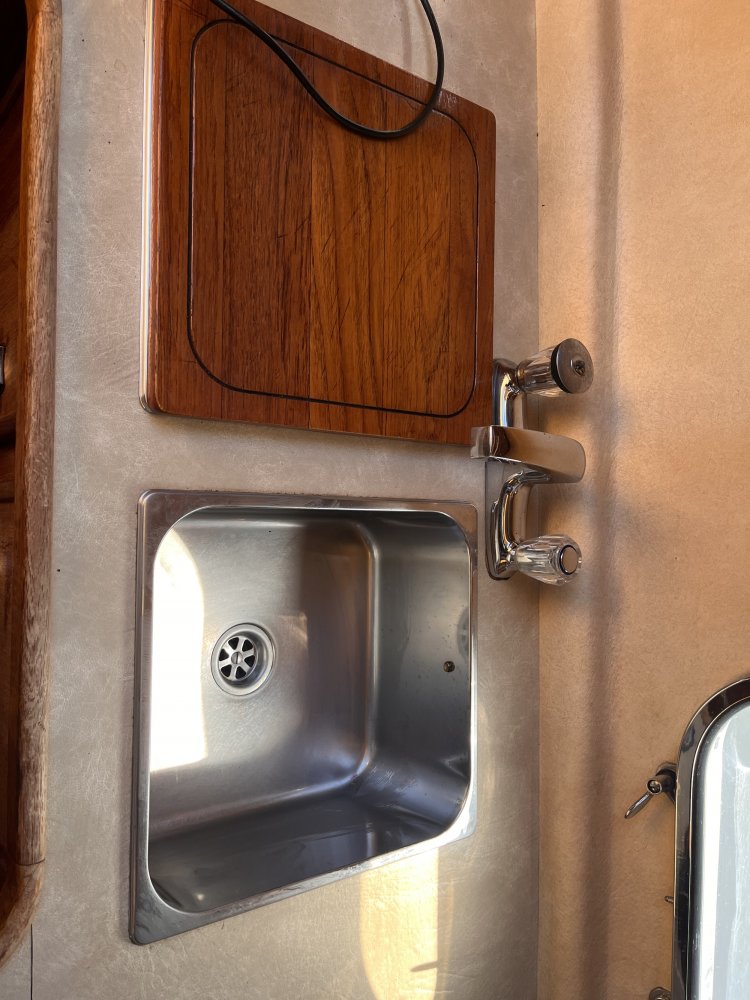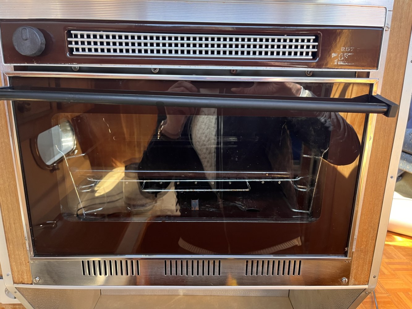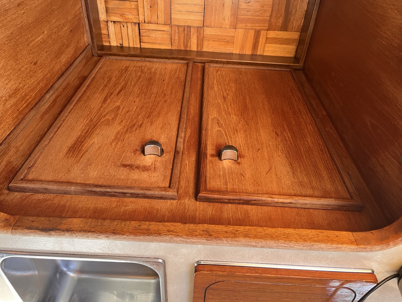 Een mooi groot uitgebreid en stoer dashboard geeft u rondom goed zicht in verband met alle ramen. Het mooie grote dashboard is geweldig: al die klokjes, meters en schakel knopjes. Meteen naast de stuurstand is handige keuken ingebouwd. Een mooie U-vormige keuken met allerlei extra’s. Veel bergruimtes en een mooi 4 pits kooktoestel. Dubbele RVS spoelbak met RVS kraan. Grote RVS bakoven is aanwezig, mede als extra afzuiging. Het schip heeft veel 220 volt stopcontacten, een gasalarm en extra verlichting in de keuken. 105 liter koelkast van Waeco.