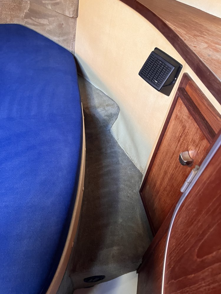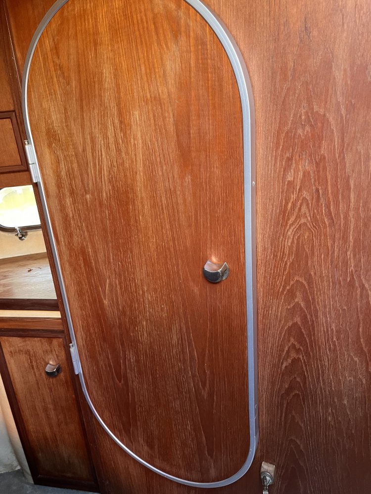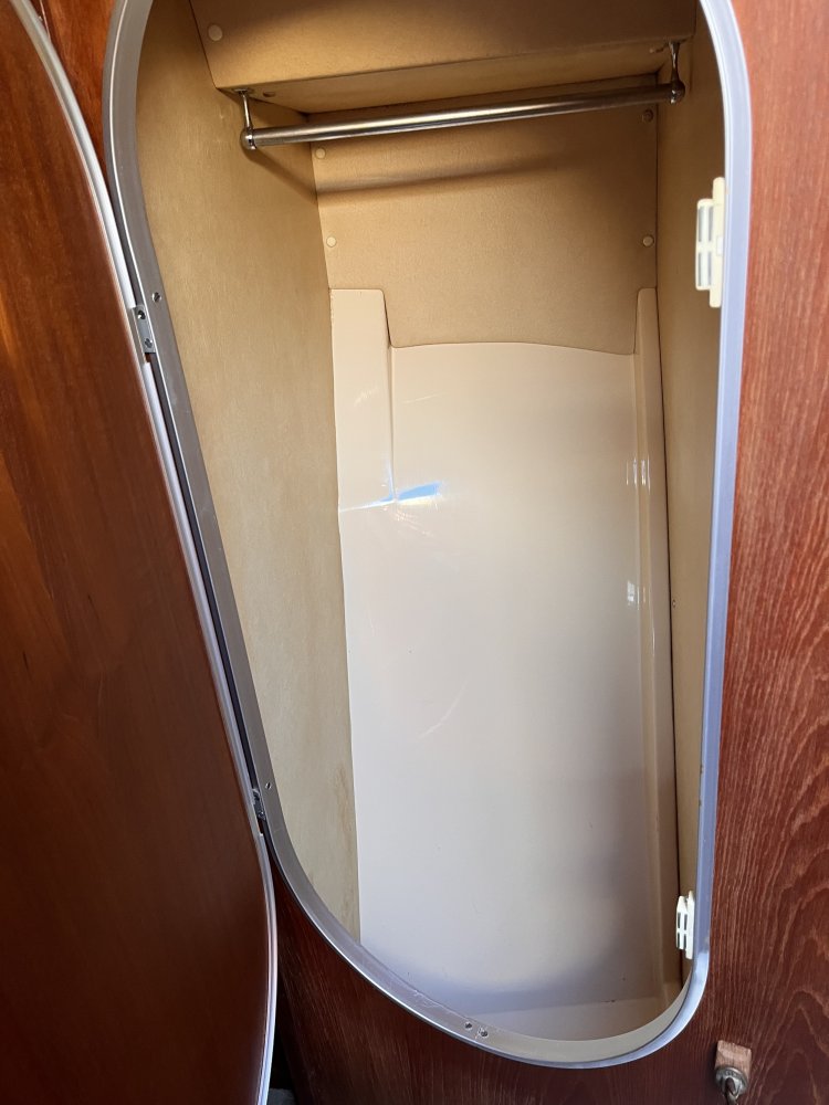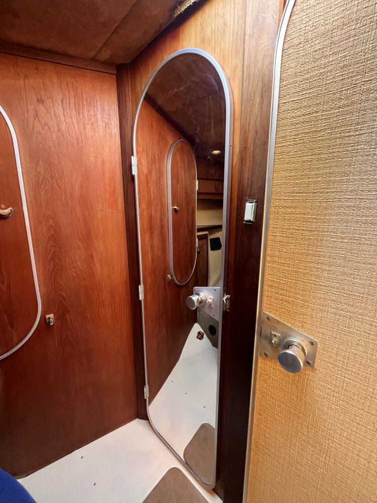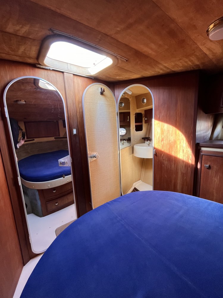 Veel schepen hebben geen hangkast maar ik heb al diverse hangkasten geteld. Toch handig voor kleding zoals overhemden en colbert’s, nette broeken en jurken en blouses. Naar voren lopend komen we in de eigenaars cabine. Een groot goed rondom te bereiken dubbel bed. Ook hier daglicht en veel ventilatie via het glazen lichtluik. Het lichtluik/ vluchtluik heeft geen waterschades. Luidspeakers, extra plafondkastjes, mooi hoofdbord/wandkussen voor het bed. Ook hier 2 hangkasten en de doorgang naar de toilet/ doucheruimte. De entreedeur van deze voorcabine is geheel van binnen met een spiegel bekleed.
