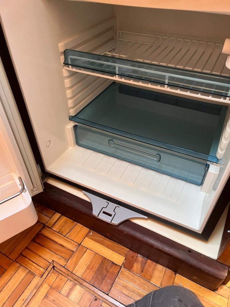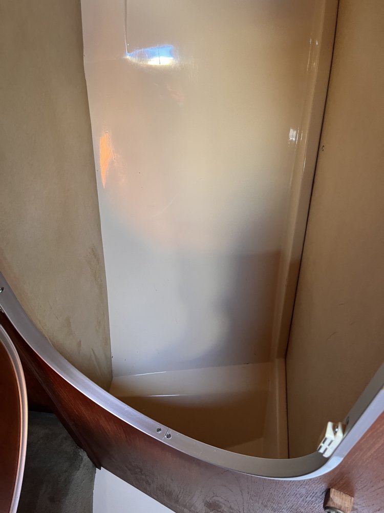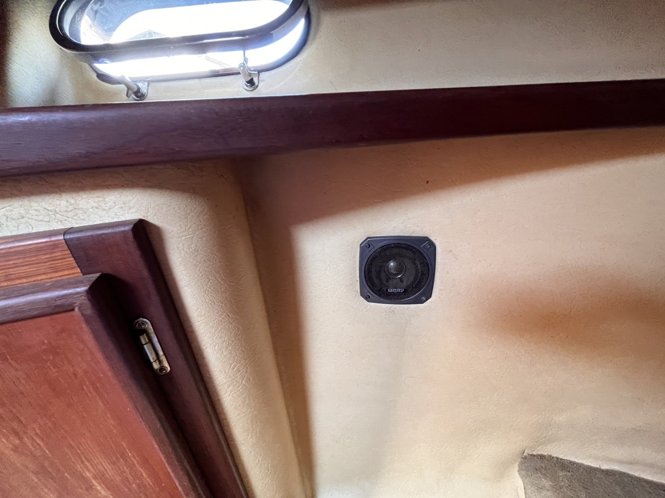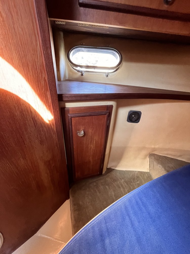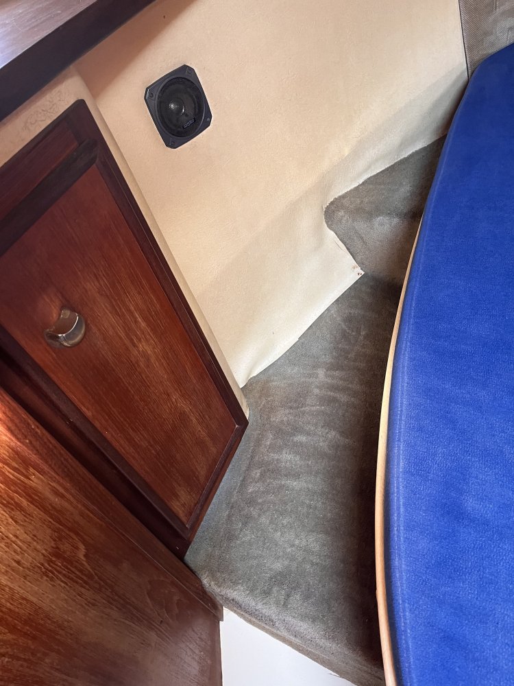 Veel schepen hebben geen hangkast maar ik heb al diverse hangkasten geteld. Toch handig voor kleding zoals overhemden en colbert’s, nette broeken en jurken en blouses. Naar voren lopend komen we in de eigenaars cabine. Een groot goed rondom te bereiken dubbel bed. Ook hier daglicht en veel ventilatie via het glazen lichtluik. Het lichtluik/ vluchtluik heeft geen waterschades. Luidspeakers, extra plafondkastjes, mooi hoofdbord/wandkussen voor het bed. Ook hier 2 hangkasten en de doorgang naar de toilet/ doucheruimte. De entreedeur van deze voorcabine is geheel van binnen met een spiegel bekleed.
