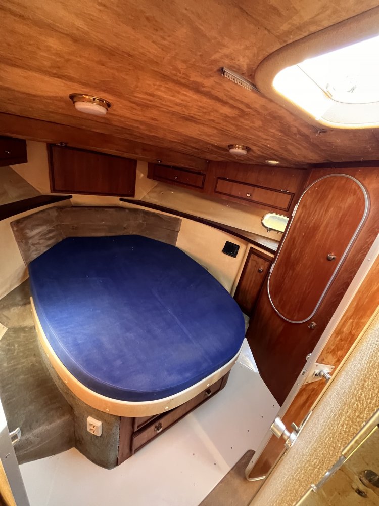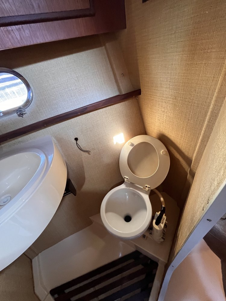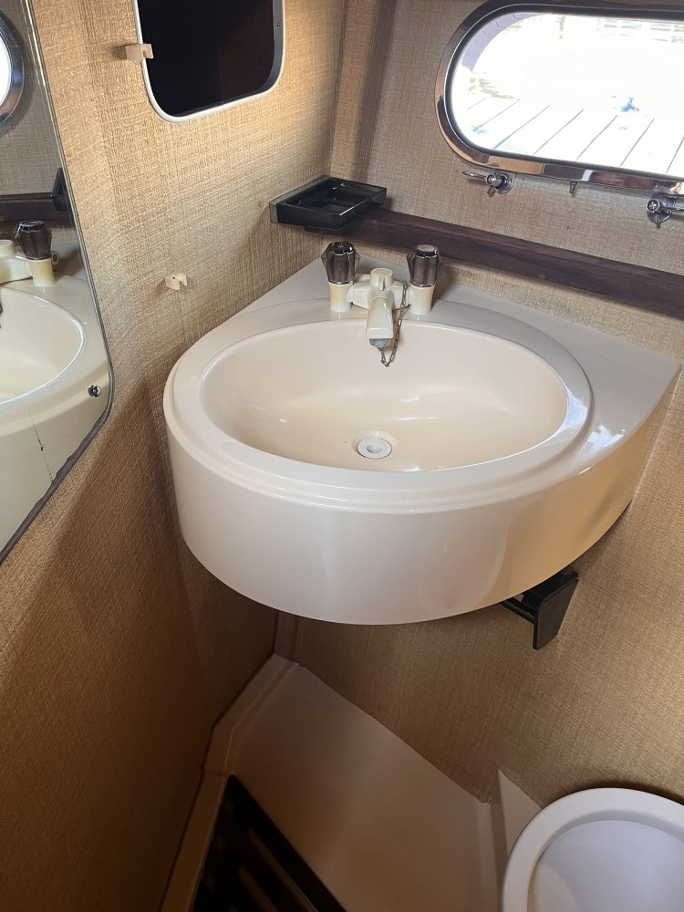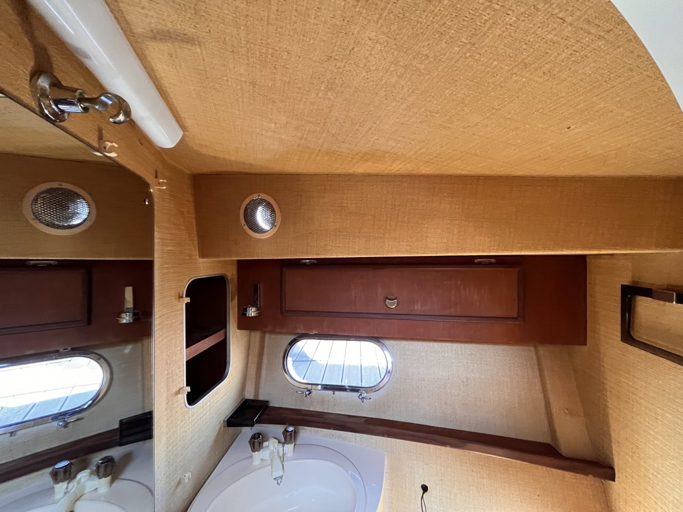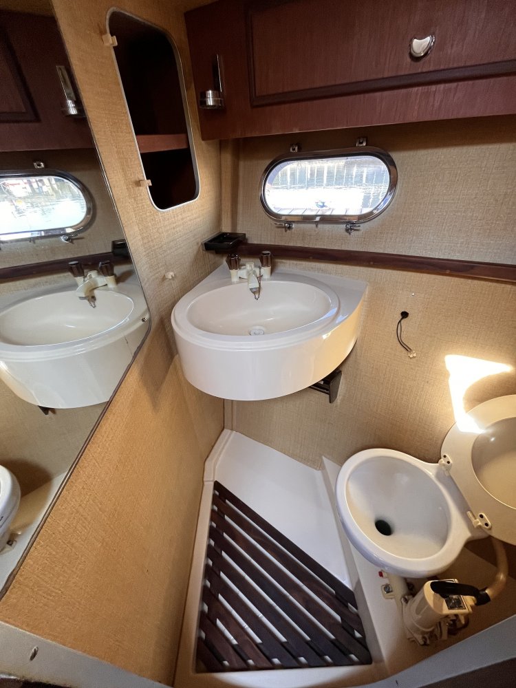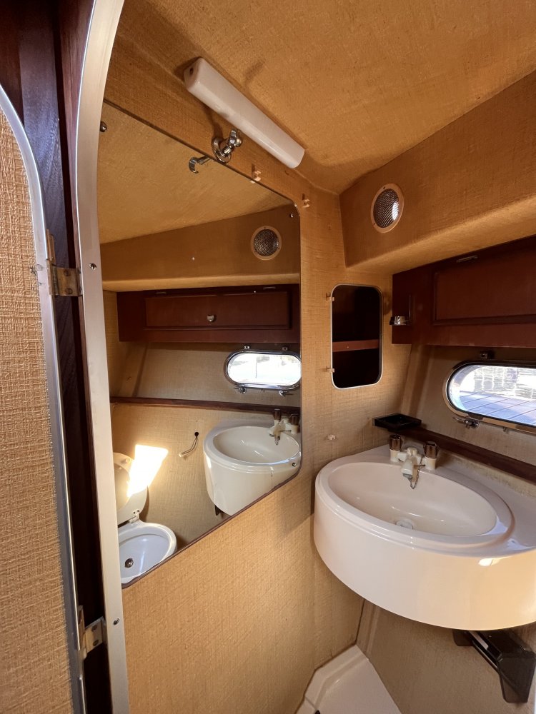 De logeerruimte is erg ruim  en biedt gelegenheid tot twee slaapplaatsen. De toiletruimte heeft een extra wastafel, RVS  patrijspoort, spiegel, hand geschakelde wc (geen lawaai in de nacht). Het duurste van een douche is de opvangbak, en deze is dus hier prachtig aanwezig. Zowel in de voor cabine als in deze toiletcabine en douchecabine zijn diverse ventilaties aanwezig.