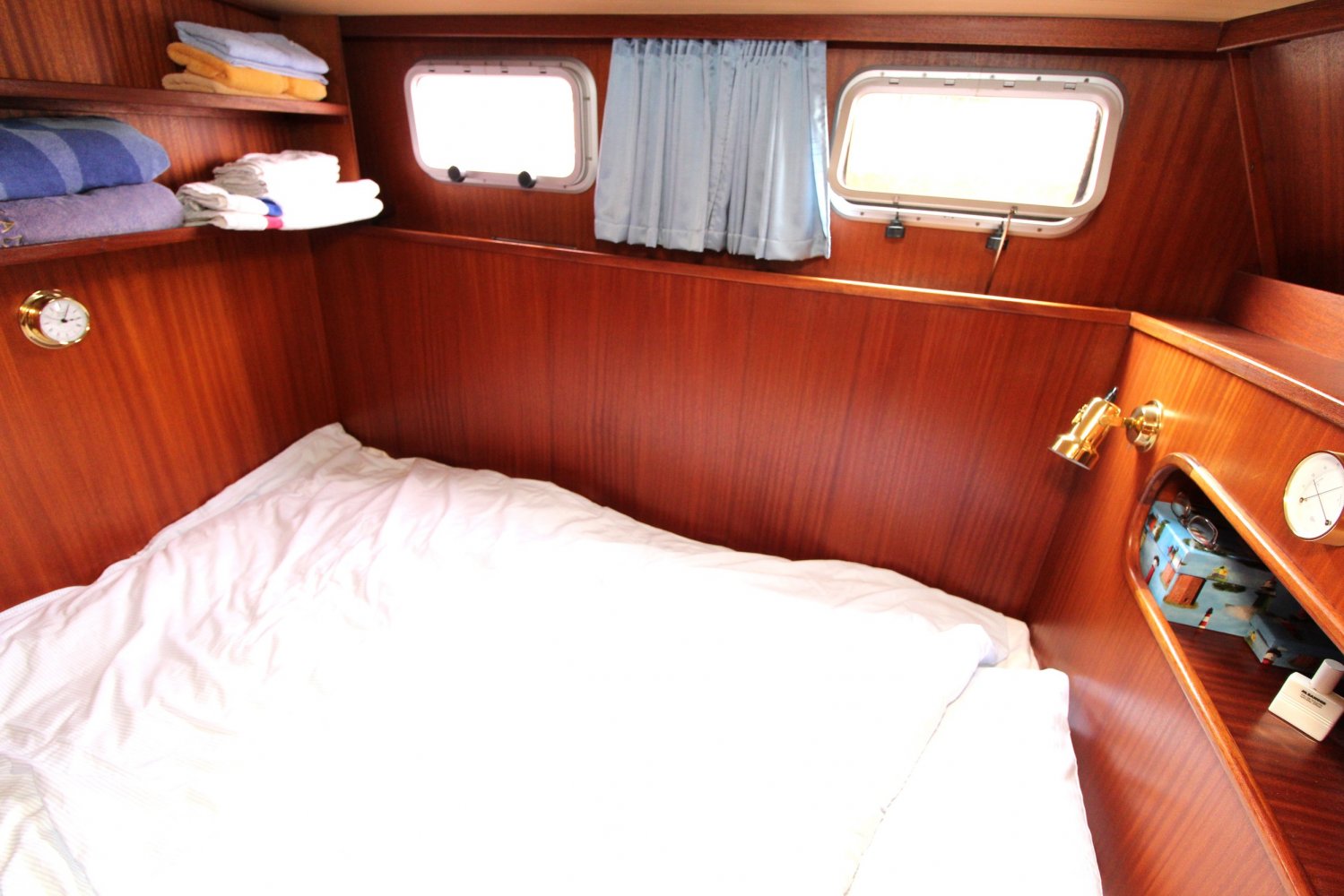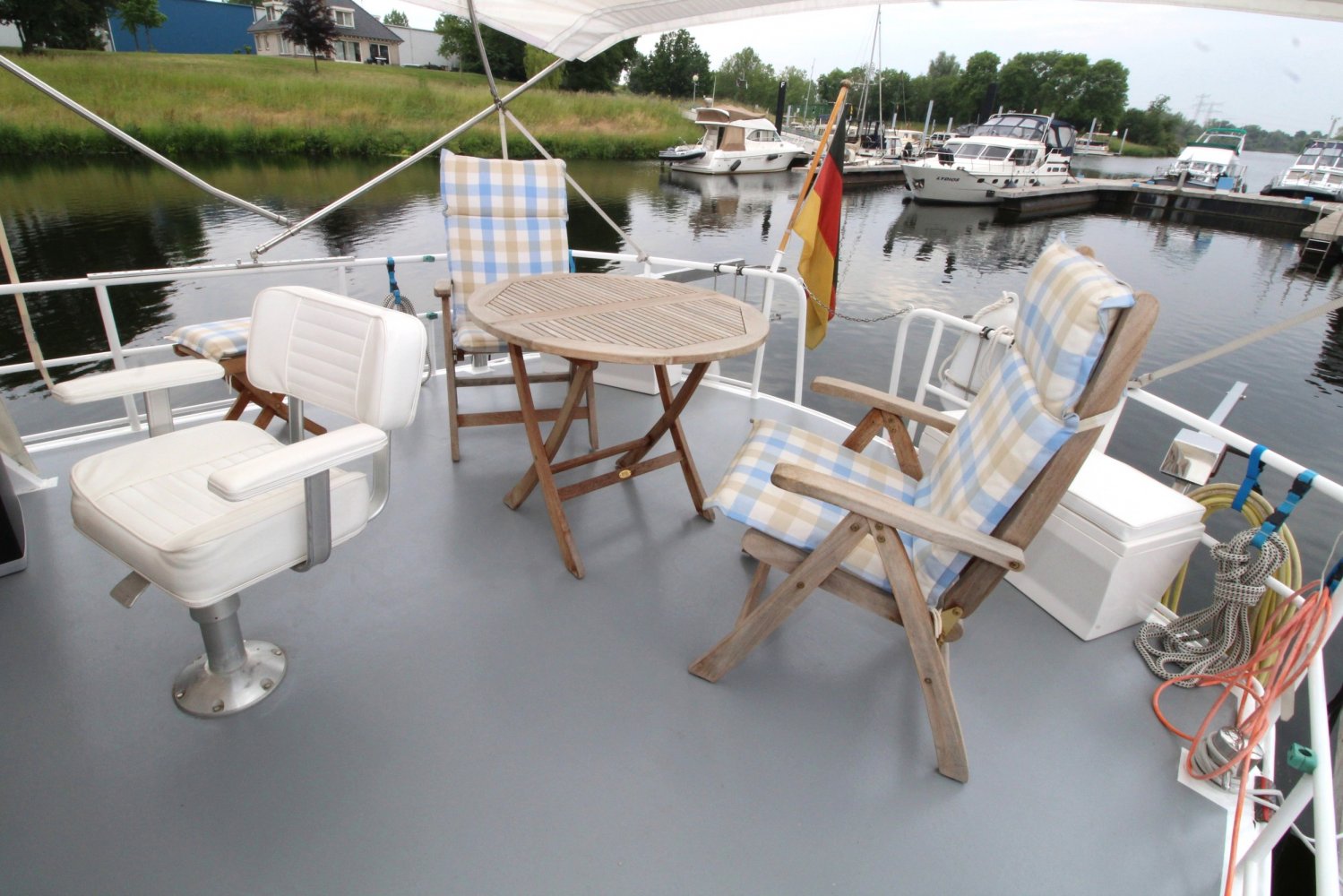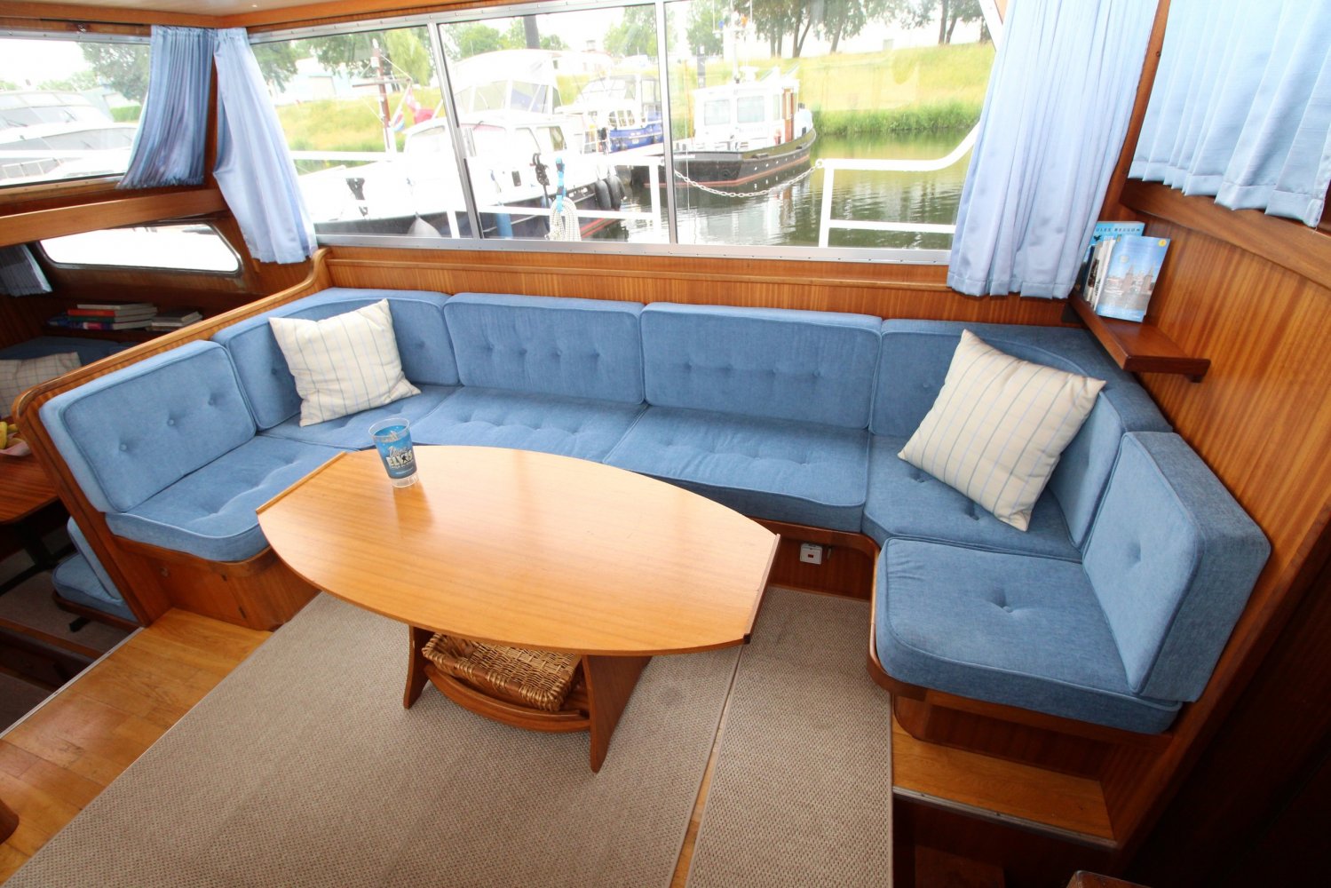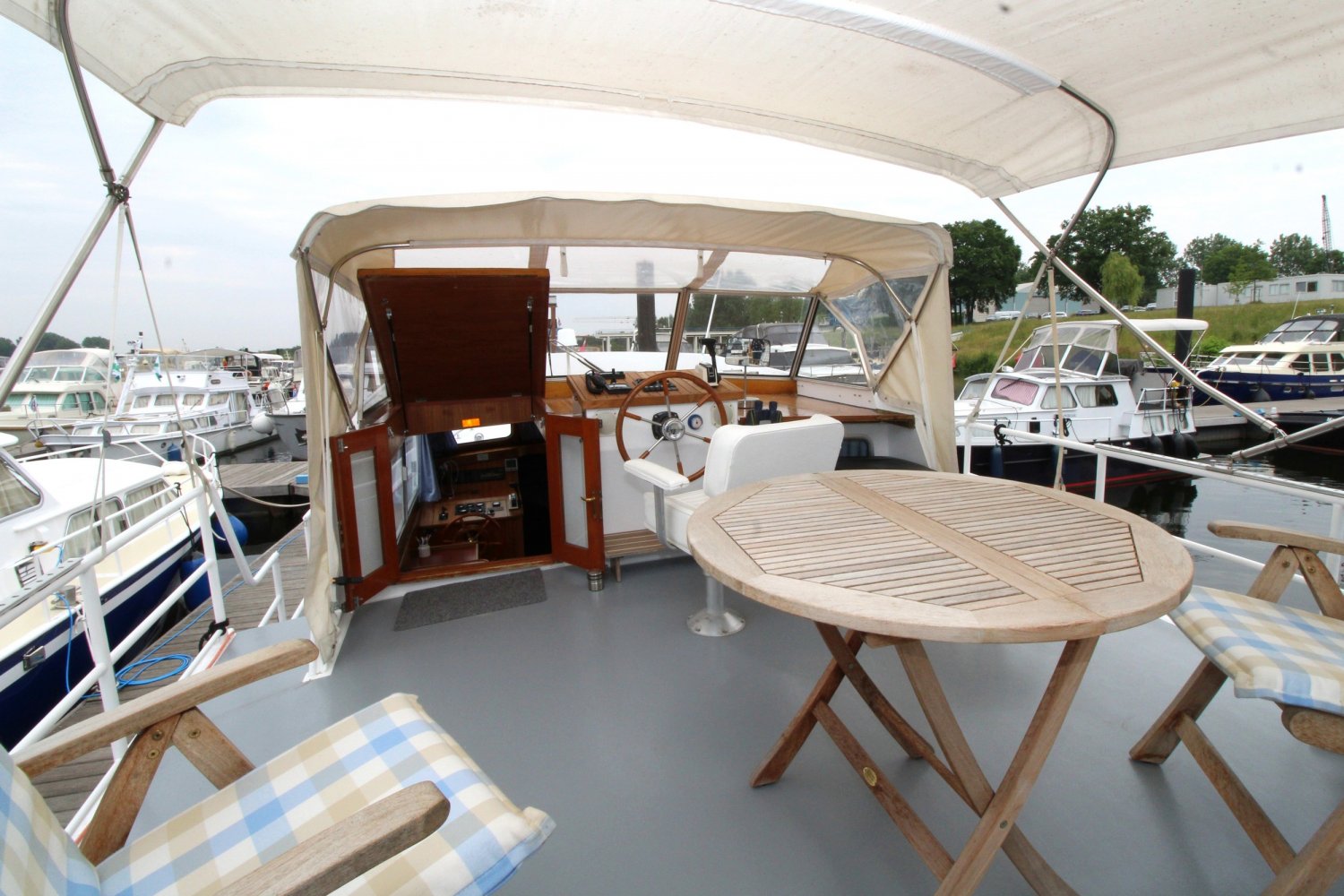 Brede gangboorden met een hoge reling zorgen ervoor dat men zich aan boord van deze Hollandia 1200 SL veilig over het schip kan bewegen. Het achterdek biedt voldoende plaats aan u en uw gasten om van het mooie buitenleven te genieten. Vanaf de hier gelegen stuurstand heeft men een goed overzicht op het schip en de omgeving.