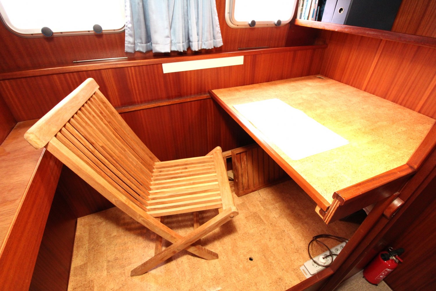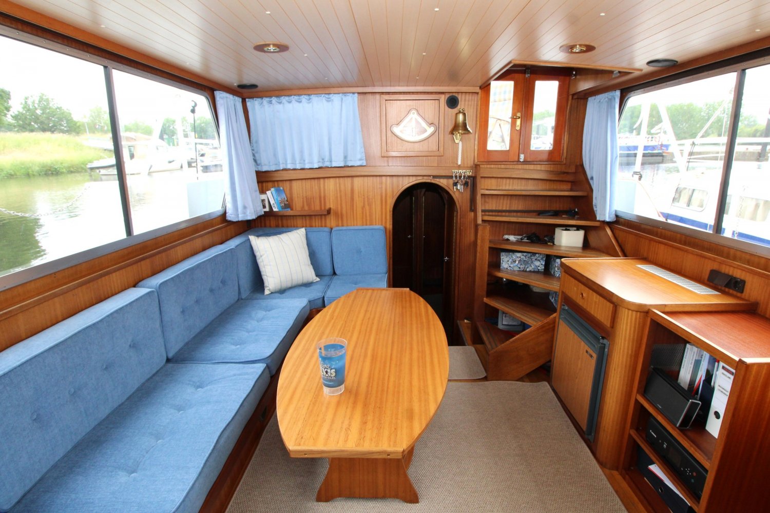 Deze ruime Hollandia 1200 SL heeft een warm houten interieur en gezellige leefruimtes, welke netjes en verzorgd ogen. Door grote ramen in de salon valt heerlijk veel licht naar binnen, hetgeen een aangename atmosfeer geeft en een ruime uitstraling. De kombuis aan boord is praktisch van indeling en ingericht met een gezellige eethoek, welke veranderd kan worden in een extra slaapplaats voor 2 personen. Verder heeft u aan boord de beschikking over 3 vaste slaapplaatsen, een separate douche- en toiletruimte, plus een hut welke de eigenaar als kantoor gebruikt. Tevens is er op dit motorjacht voldoende kast- en bergruimte voor uw persoonlijke spullen.