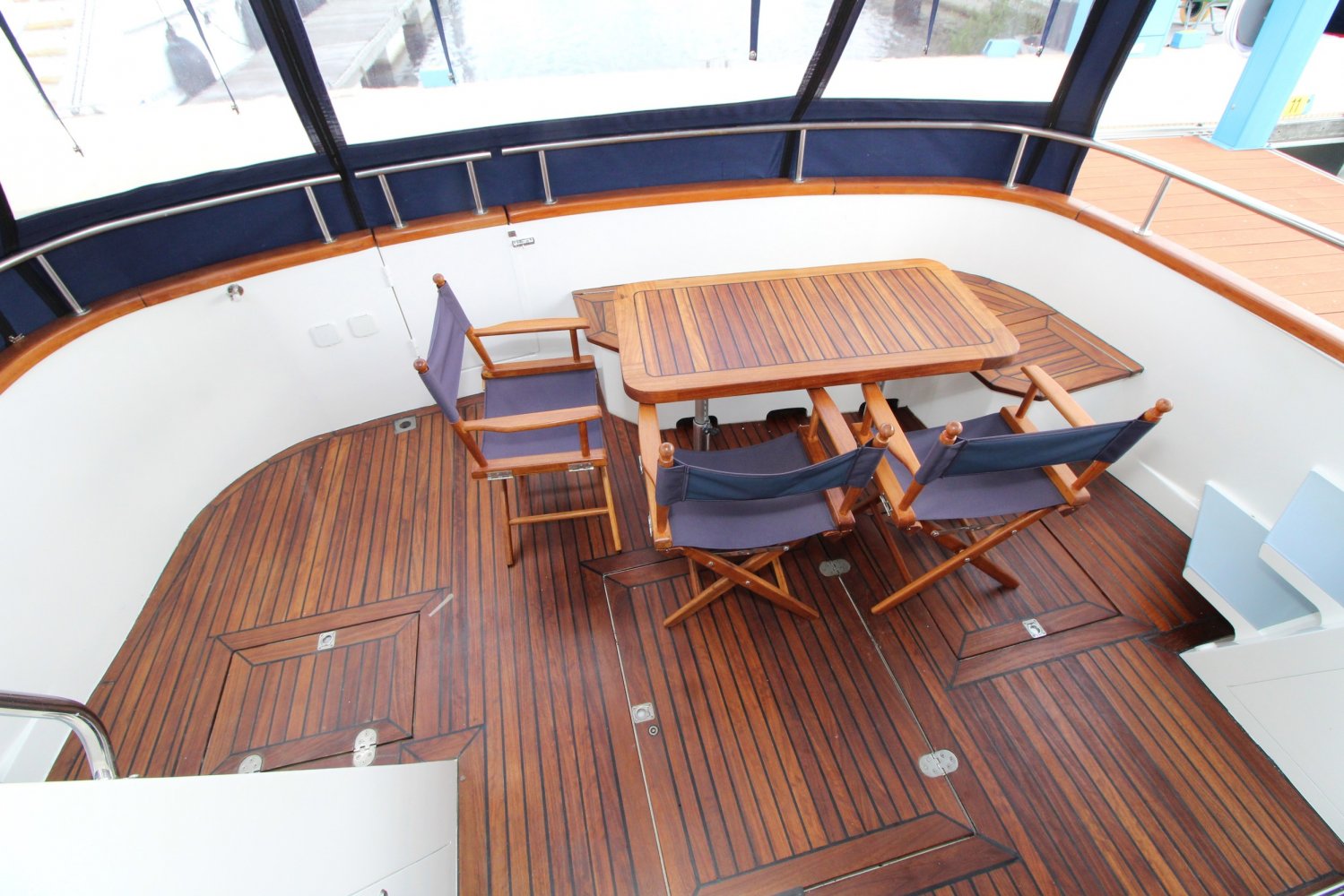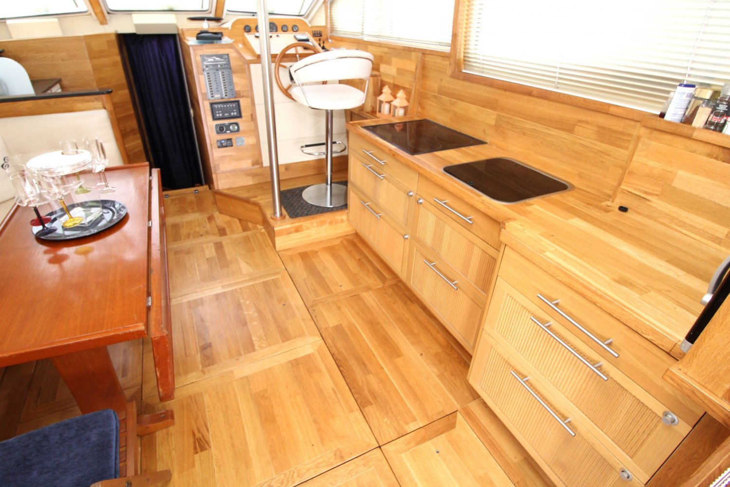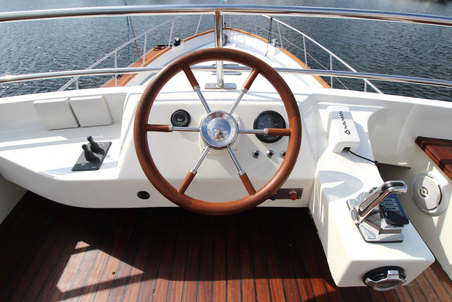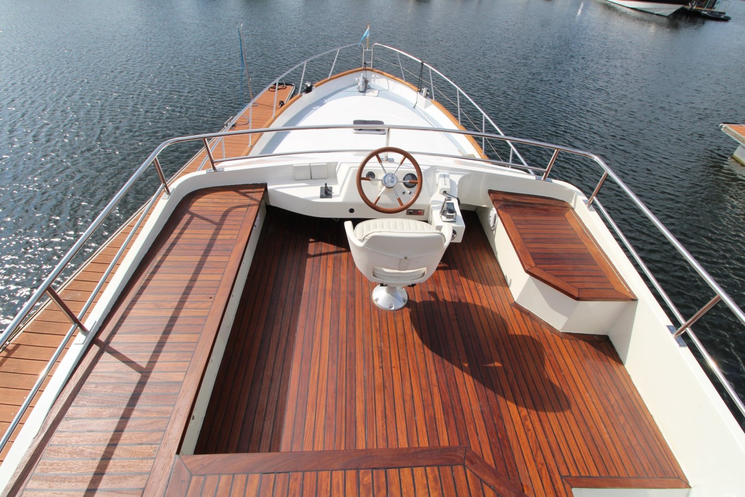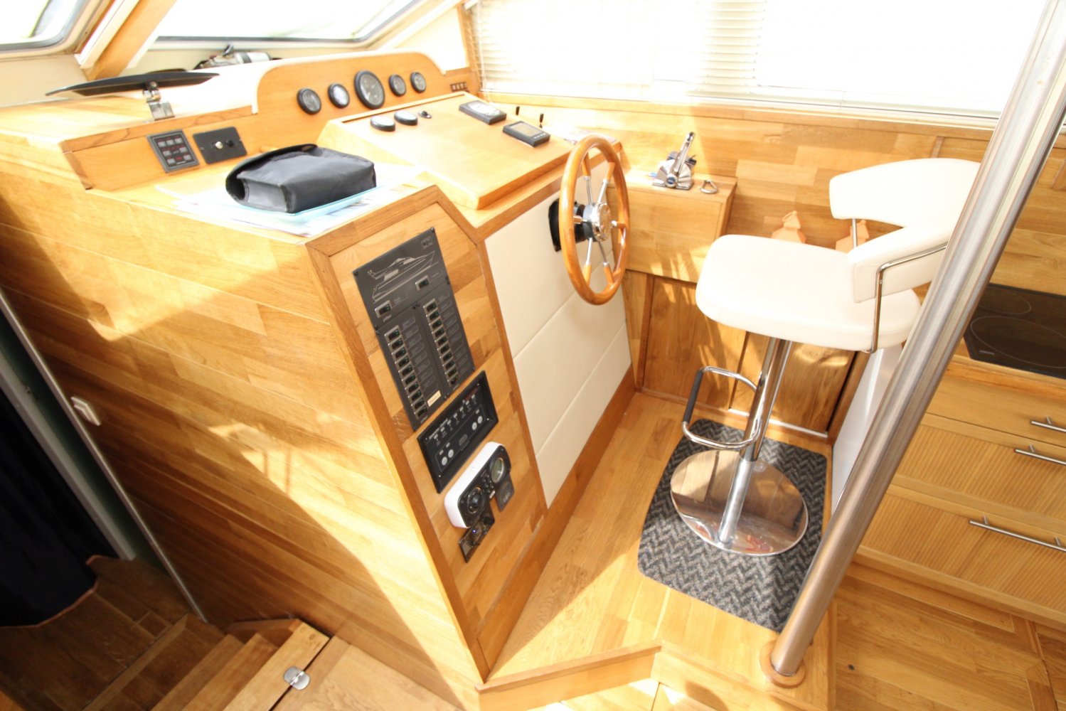 Vanaf de grote flybridge heeft u een schitterend uitzicht op uw omgeving en het vaarwater. Naast een stuurstand is deze voorzien van diverse banken om te kunnen genieten van het zonnetje. Door haar lage doorvaarthoogte staat u een groot vaargebied tot uw beschikking. De Franse kanalen bijvoorbeeld, behoren tot één van de vele mogelijkheden. Ook grote rivieren en open wateren zijn geen probleem voor de 120 PK sterke dieselmotor, dankzij de boeg- en hekschroef manoeuvreert dit motorjacht zeer eenvoudig. Kortom deze Bruce Roberts 1200 Fly heeft alles aan boord voor een aangenaam verblijf op het water en om mooie reizen te maken.