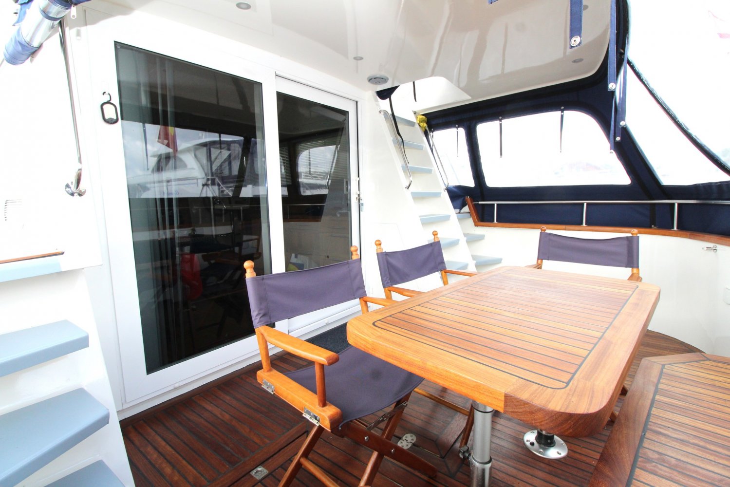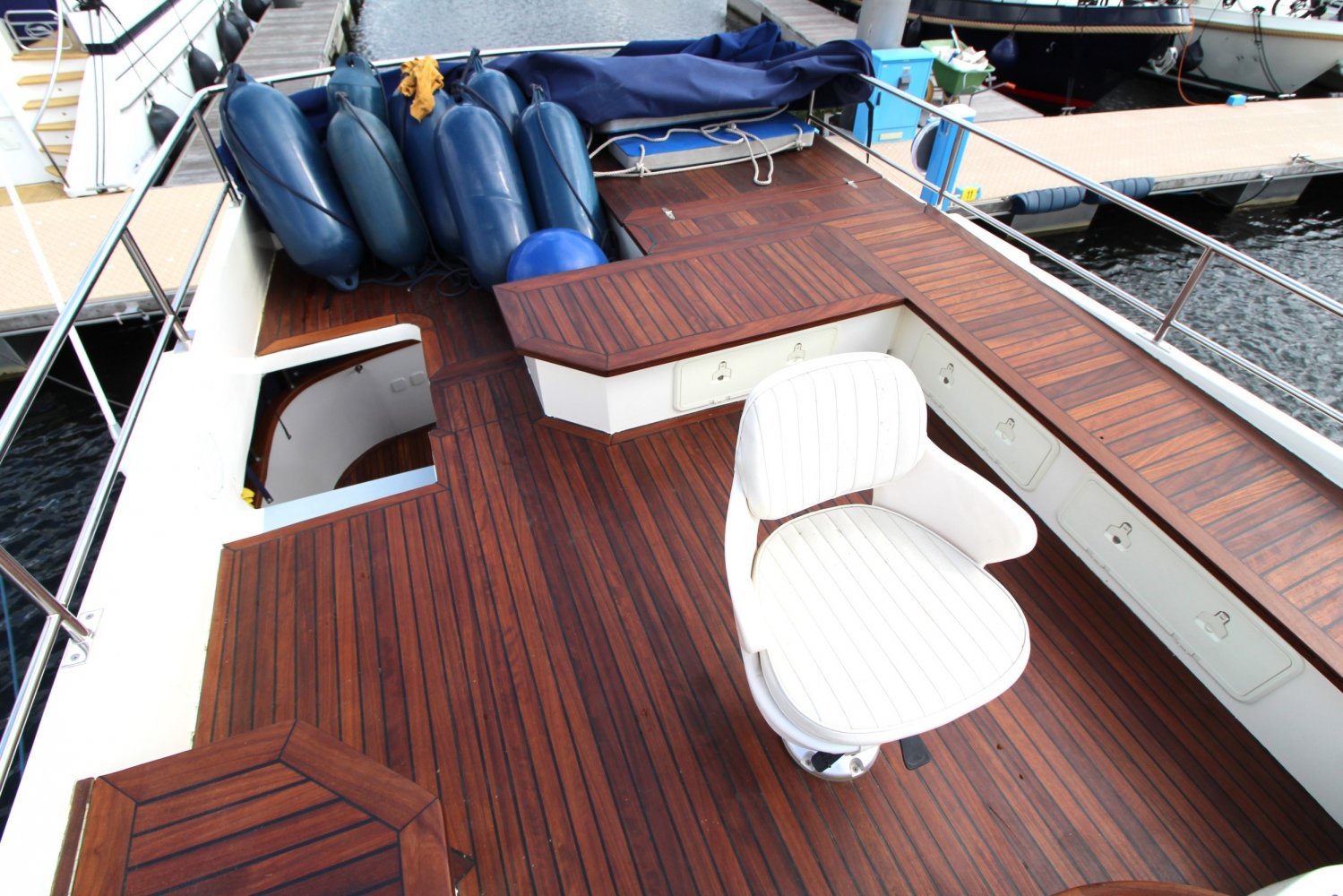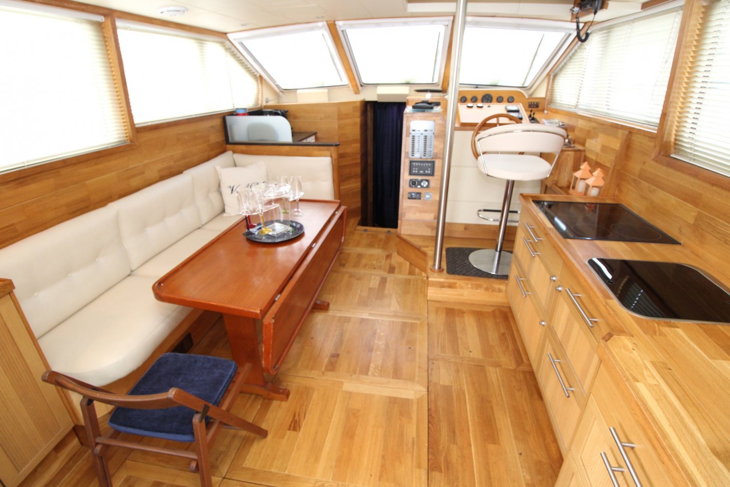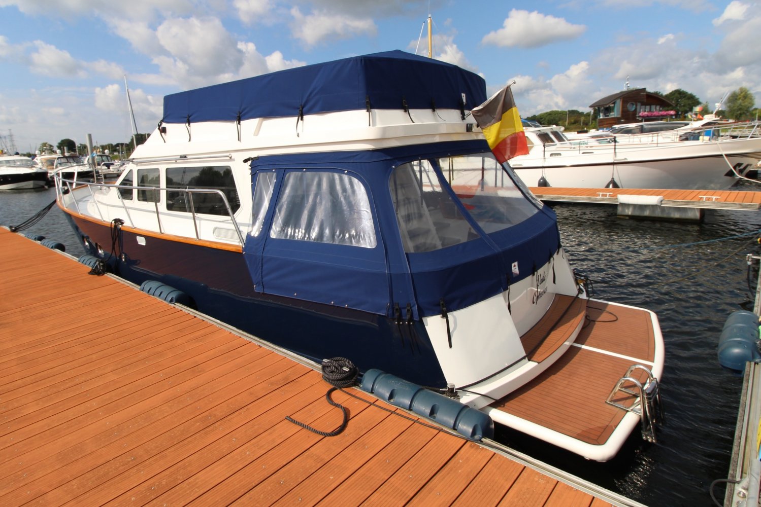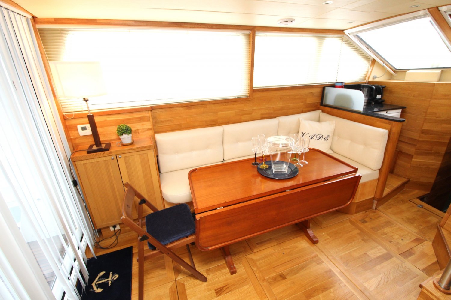 Vanaf de grote flybridge heeft u een schitterend uitzicht op uw omgeving en het vaarwater. Naast een stuurstand is deze voorzien van diverse banken om te kunnen genieten van het zonnetje. Door haar lage doorvaarthoogte staat u een groot vaargebied tot uw beschikking. De Franse kanalen bijvoorbeeld, behoren tot één van de vele mogelijkheden. Ook grote rivieren en open wateren zijn geen probleem voor de 120 PK sterke dieselmotor, dankzij de boeg- en hekschroef manoeuvreert dit motorjacht zeer eenvoudig. Kortom deze Bruce Roberts 1200 Fly heeft alles aan boord voor een aangenaam verblijf op het water en om mooie reizen te maken.