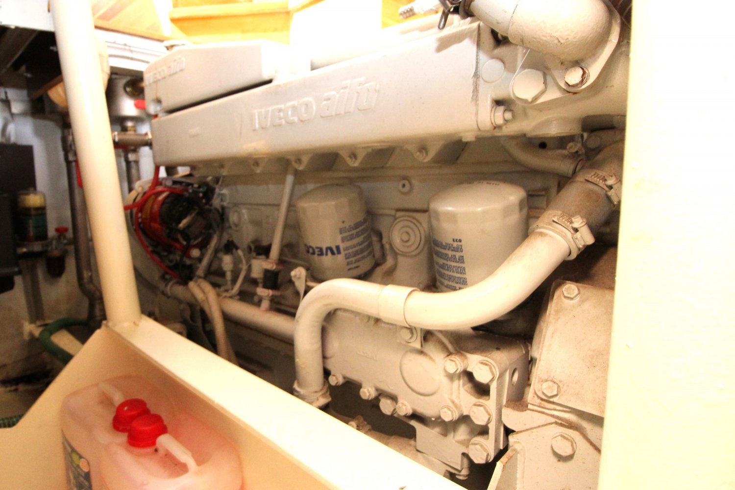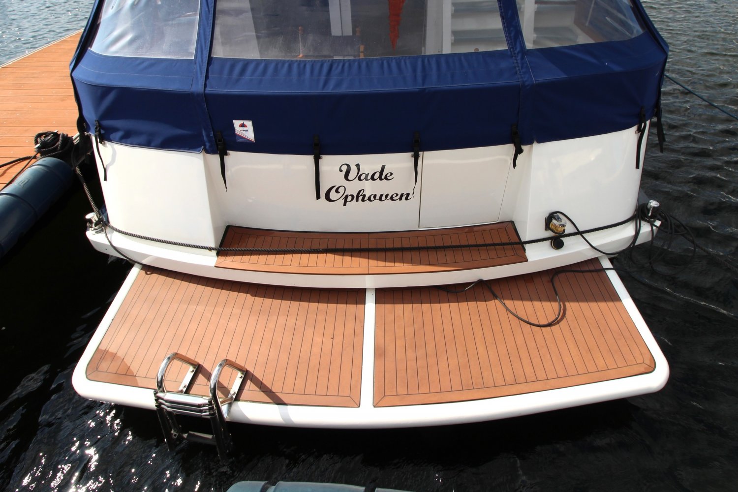 Via een groot zwemplateau bereikt men eenvoudig de kuip van deze Bruce Roberts 1200 Fly welke voorzien is van een vast dak en een royale bank met tafel.  Een heerlijke plek om van het mooie buitenleven te genieten.  Een grote glazen schuifdeur maakt dat de kuip naadloos overloopt naar binnen, zodat hierdoor één grote sociale ruimte ontstaat. Het schip oogt netjes en verzorgd en heeft een aangename atmosfeer. De indeling van de salon met haar licht eikenhouten interieur zorgt voor een zeer ruimtelijk gevoel wat versterkt wordt door grote raampartijen die voor een geweldig zicht zorgen. De kombuis is praktisch van indeling en direct aan stuurboordzijde bij de schuifdeur geplaatst hetgeen handig is als men gasten in de kuip van een versnapering wilt voorzien. Benedendeks heeft u de beschikking over een gastenhut met een 2 persoons bed en kastruimte en een eigenaars hut in de boeg welke ingericht is met een 2 persoons Frans bed en kasten voor uw persoonlijke spullen. Natuurlijk ontbreekt een badkamer met wastafel, elektrisch toilet en douche niet aan boord van dit motorjacht.