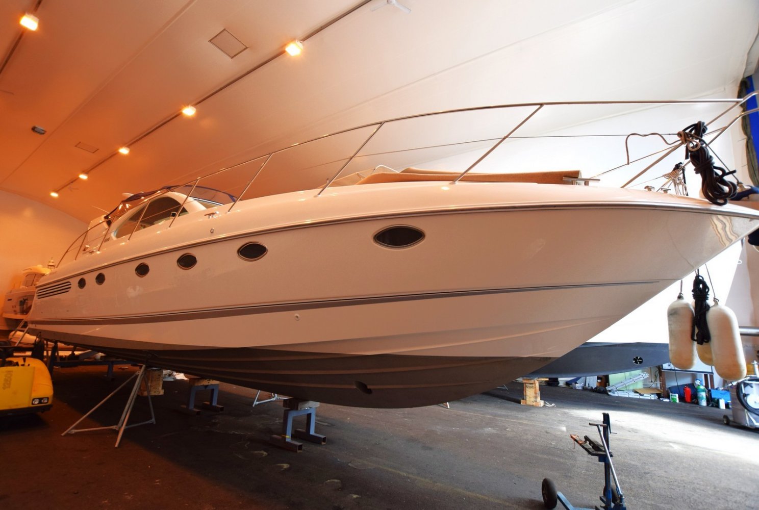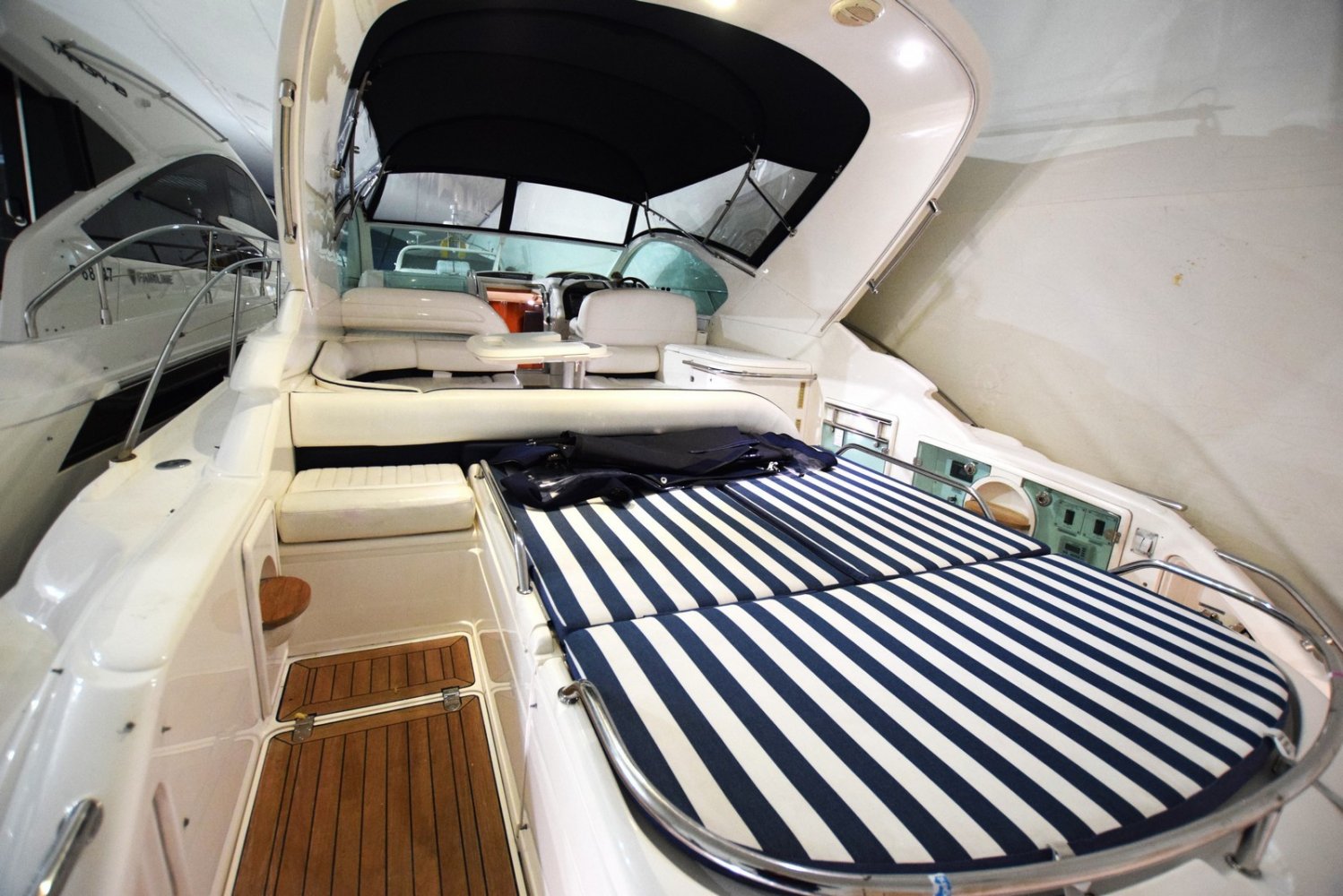 Dekzeil cockpit Passarelle Teakhouten cockpit + zwemplatform Cockpit wetbar incl BBQ, spoelbak, koelkast Radar Plotter Stuurautomaat Boegschroef Boegschroef VHF TV Walstroom Generator Onan 7kw (2015) AC/Verwarming Stereo Kookplaat Micro/Oven Koelkast Elektrisch spoeltoilet