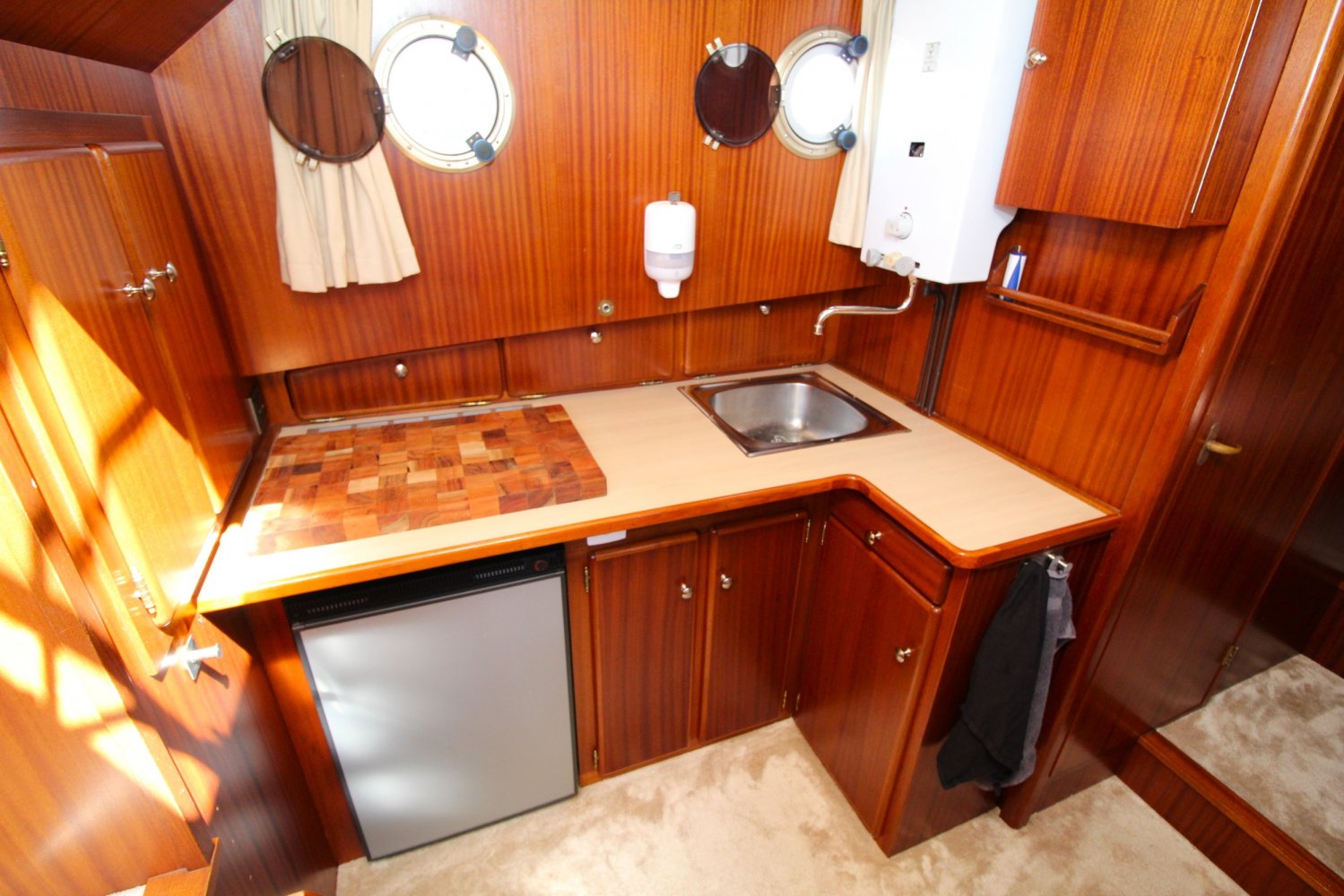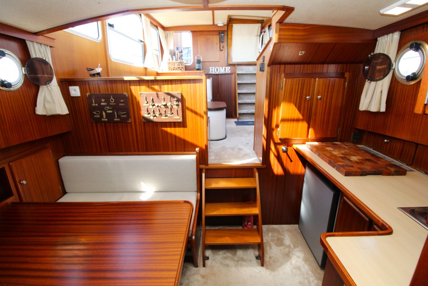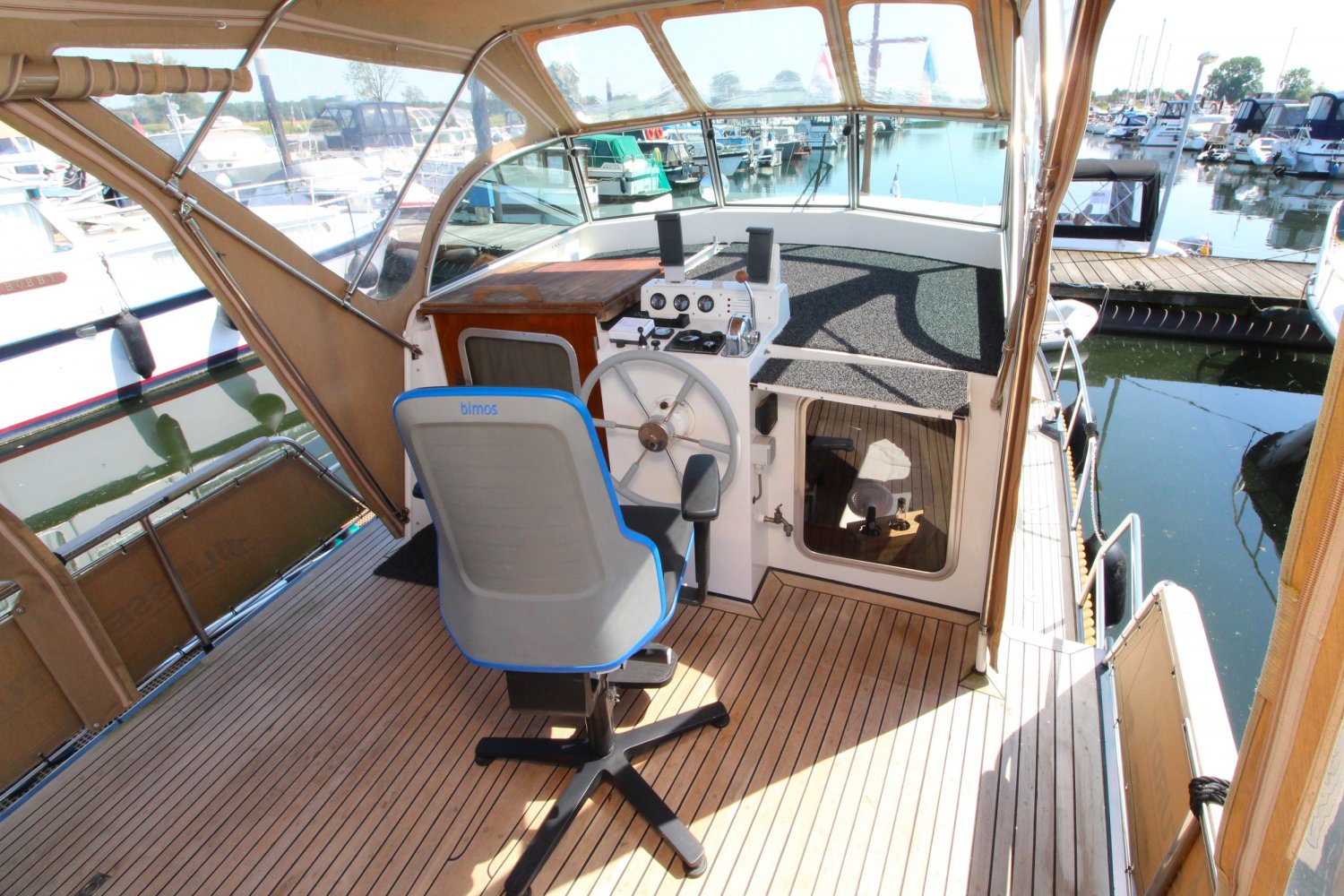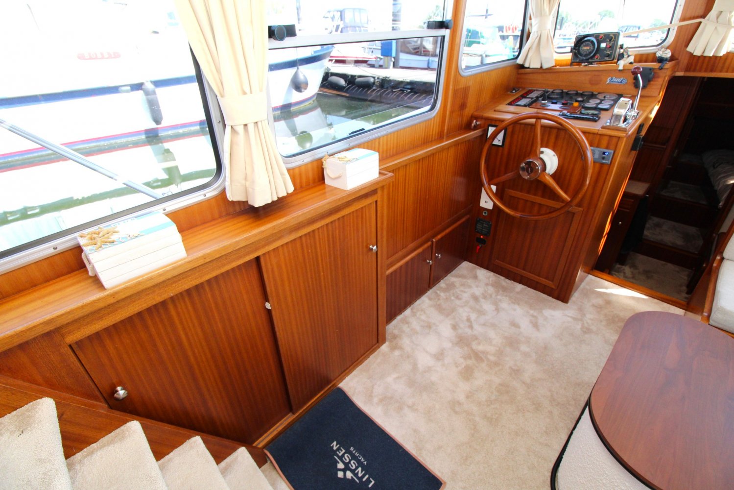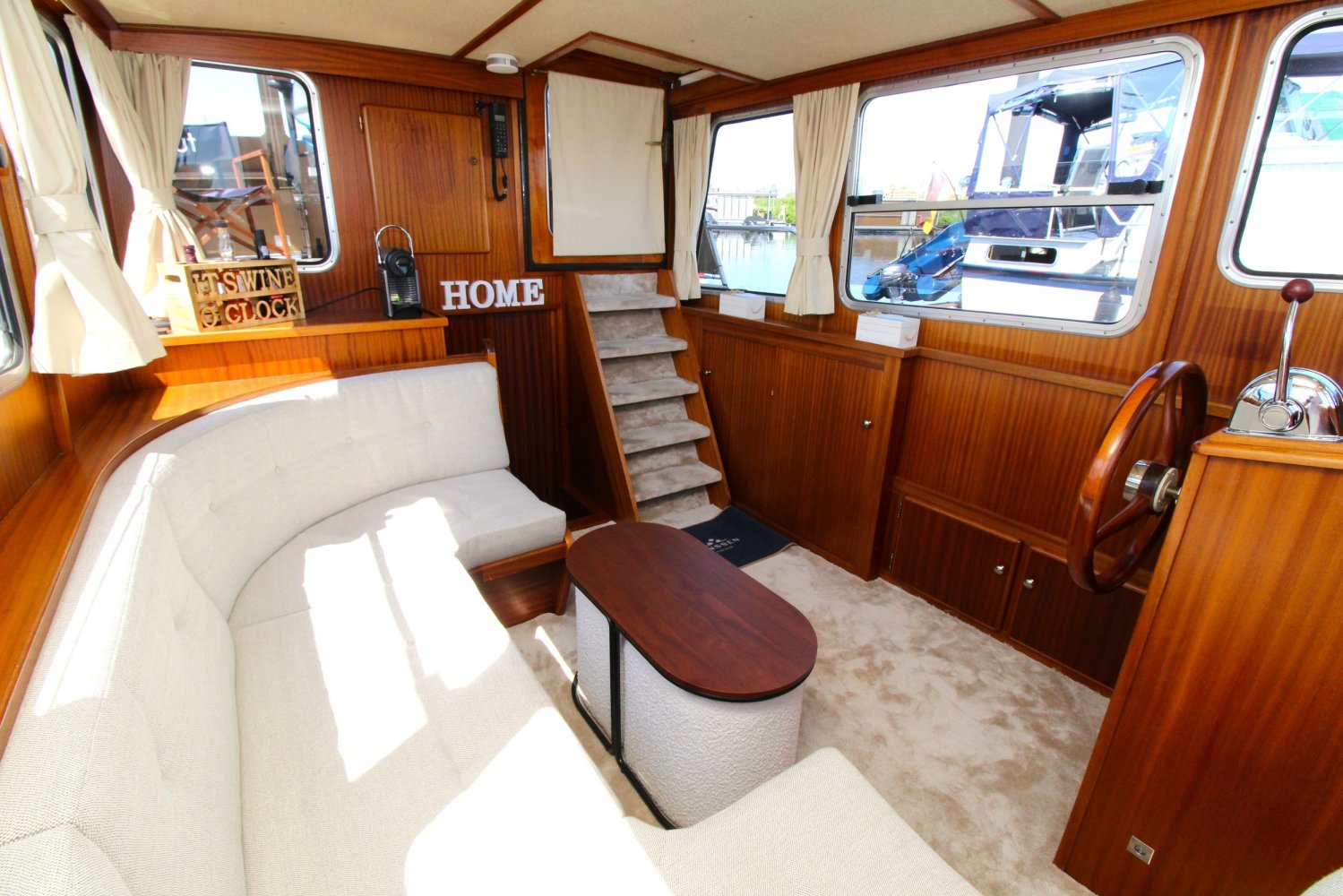Deze Linssen Classic Sturdy 35 Ac heeft een gezellig interieur welke modern oogt door met name de nieuwe vloerbedekking en de lichte bekleding. Grote ramen zorgen voor veel lichtinval en geven de salon en kombuis een ruime uitstraling. De kombuis is ingericht met een comfortabele dinette, welke eenvoudig veranderd kan worden in 2 extra slaapplaatsen. In de boeg treft u een gastenhut aan en een badkamer met een wastafel, een toilet en een douche, welke momenteel buiten gebruik is. De master bedroom is ingericht met een 2 persoons vrijstaand bed en kasten. Patrijspoorten zorgen hier voor een voldoende lichtinval en ventilatie en geven de ruimte een aangename atmosfeer.