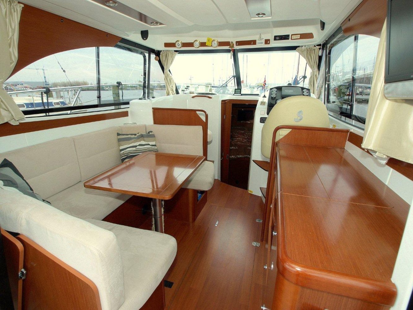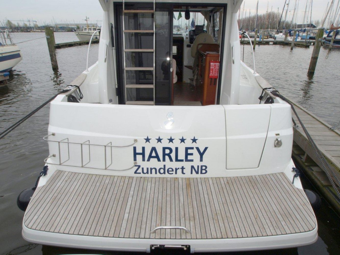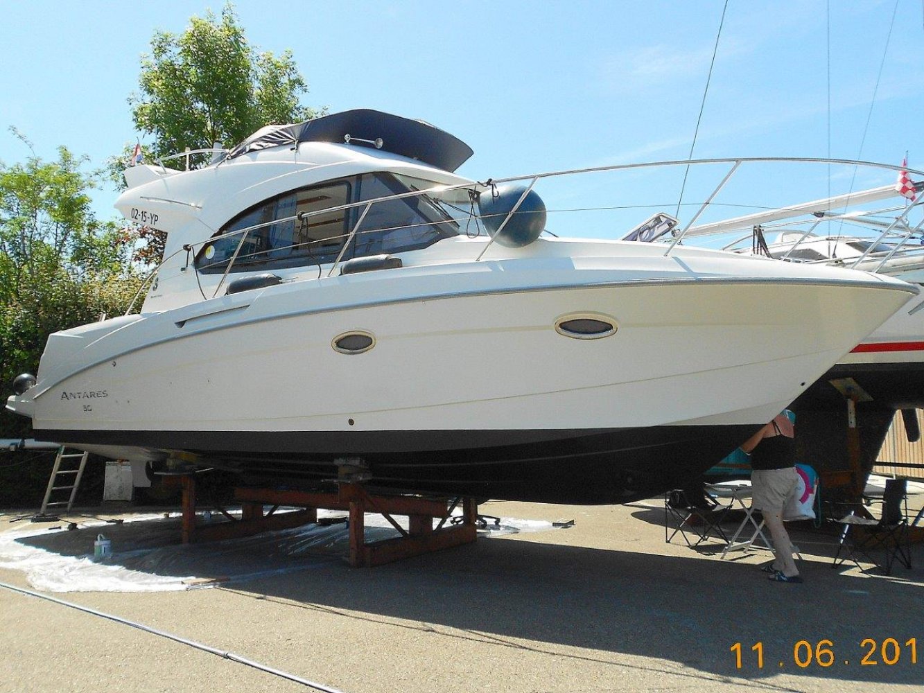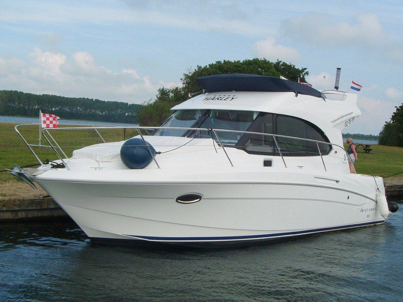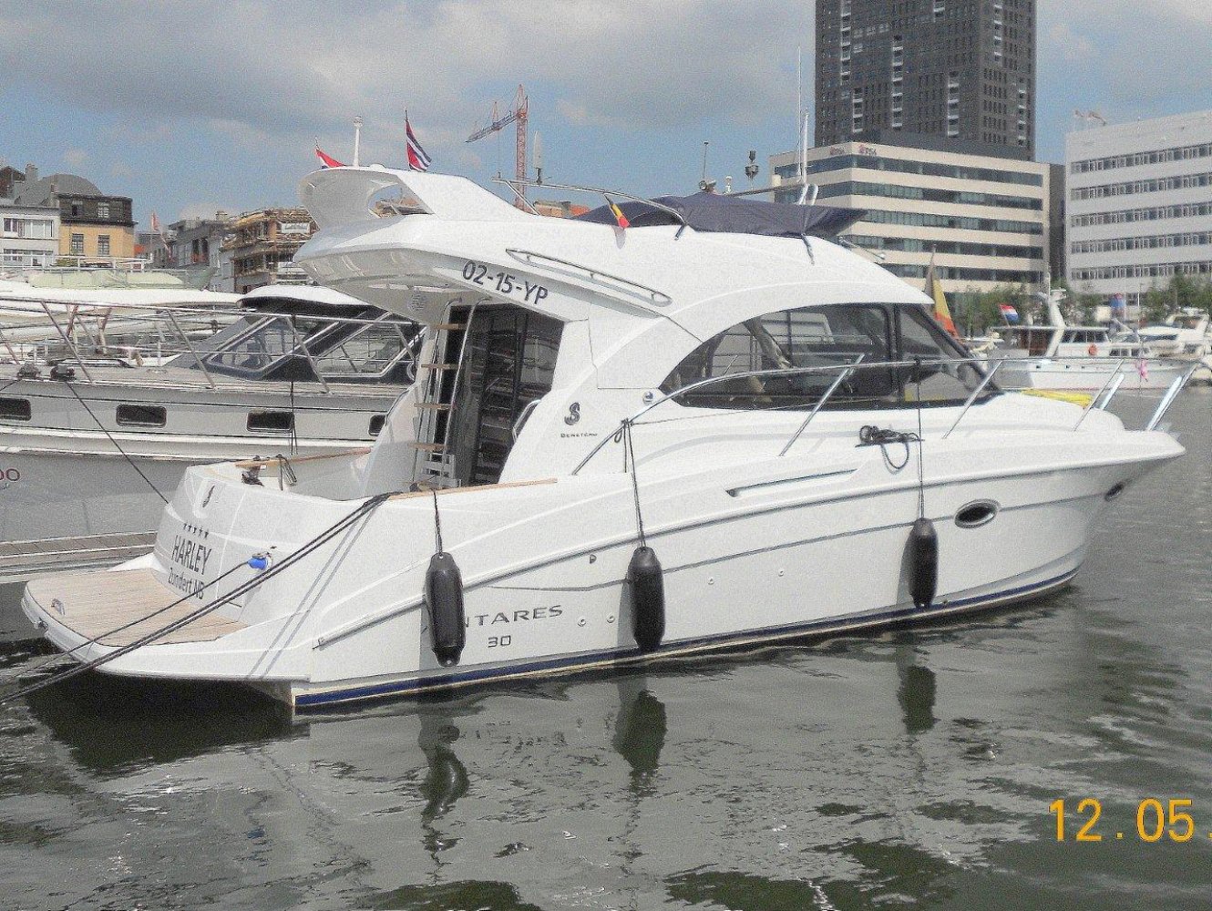 De Beneteau Antares 30 met flybridge is een fraai gelijnd en modern jacht welke ook op hogere snelheden goed vaart. Het exemplaar dat wij aanbieden is in uitstekende staat en compleet uitgerust. Dit schip is in april 2017 voorzien van nieuwe antifouling en geheel gepoetst, dus klaar voor een nieuw seizoen. Bij het aan boord stappen valt meteen het grote zwemplatform op en de gezellige kuip. Beide zijn voorzien van teak. Vanaf de kuip is de royale flybridge bereikbaar. Hier is het niet alleen fijn sturen, maar ook gezellig borrelen met een paar mensen of heerlijk zonnen. De stuurstand op de flybridge is overigens voorzien van een grote Raymarine kleurenplotter, een extra Raymarine ST70 multi display, bediening van de boegschroef en elektronische motorbediening. Via de ganboorden is het voordek bereikbaar. Hier is een groot zonnebed te maken en toegang tot het ruime ankerluik met elektrische lier. De salon is heerlijk licht en ruim van opzet. De bank aan bakboord is comfortabel. De keuken aan stuurboord biedt alle comfort, van oven tot magnetron. De stuurstand biedt wederom de nodige apparatuur en mogelijkheden. Opvallend is de trolling valve, welke de mogelijkheid biedt om met maar 1,5 km/uur te varen (ipv 6 km/uur), waardoor aanleggen een stuk prettiger is. Naast de stuurstand is een bankje voor een passagier. In het voorschip zijn 2 dubbele hutten (1 met stapelbed en 1 met eilandbed) en de natte cel geplaatst. De algehele ruimte aan boord is verrassend voor een schip van deze afmeting. Zoekt u een stoer en zeewaardig schip met flybridge waar de kop net vanaf is, dan kunnen we u van harte aanraden een keer te komen kijken. Uw jachtmakelaar is White Whale Willemstad, bereikbaar via mail of op +31 (0) 168 820 208.