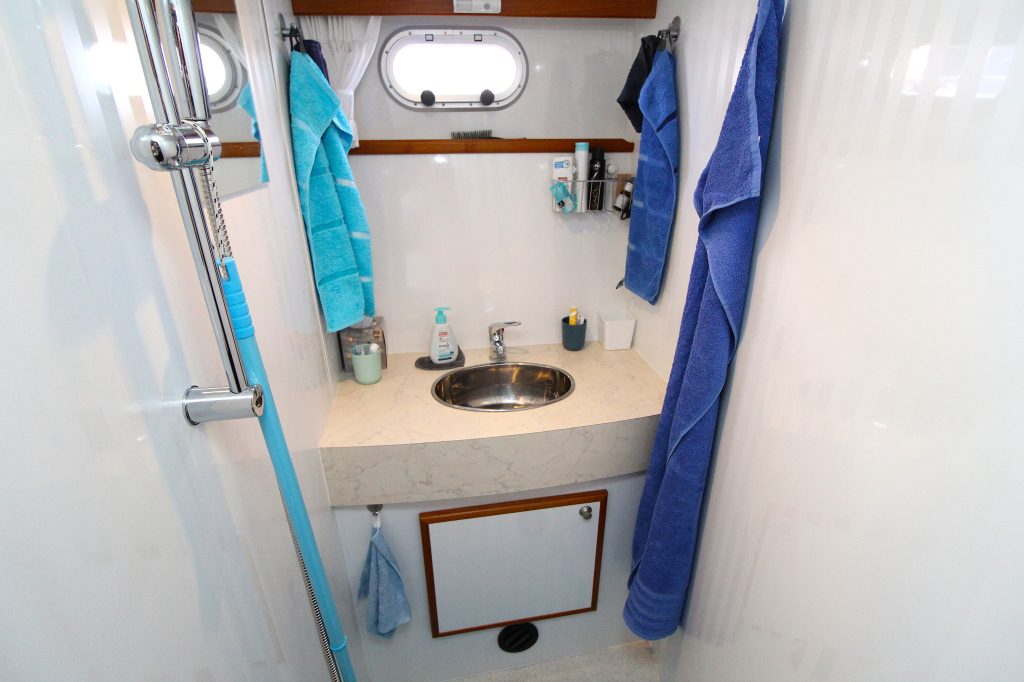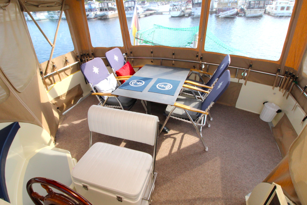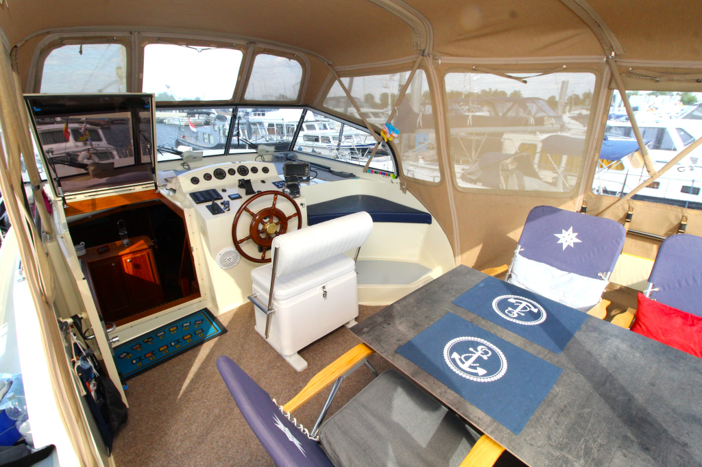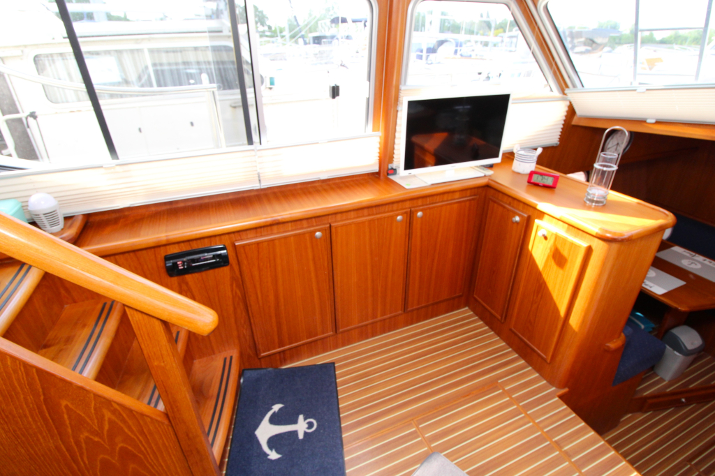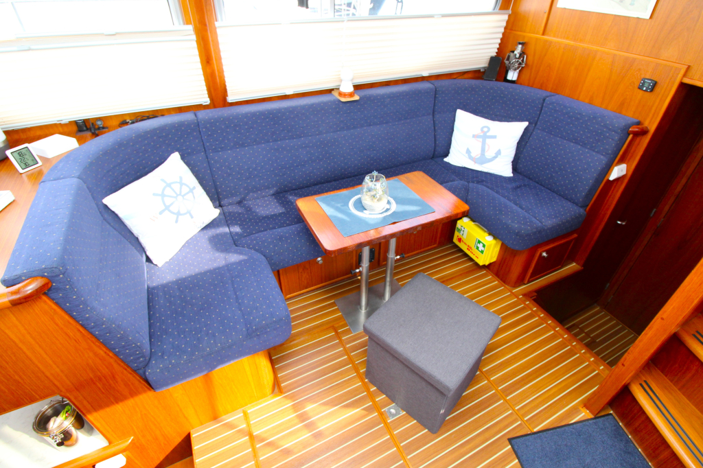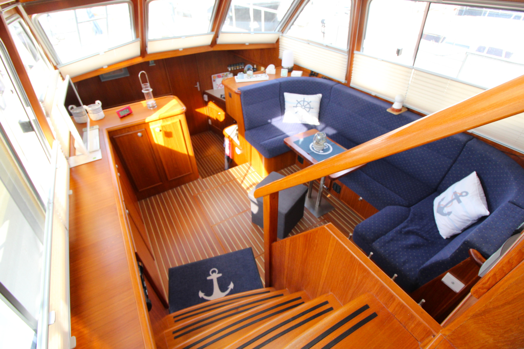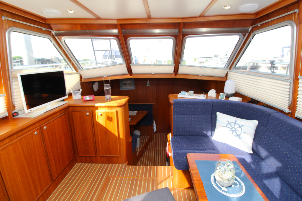 Indeling: De indeling is ruim en doordacht. Voorin bevinden zich, naast de gastenkamer in de boeg, een knusse dinette met kombuis, in het midden een gezellige salon met veel daglicht, en achterin een ruime eigenaars hut met vrijstaand bed en separate toilet- en doucheruimte.