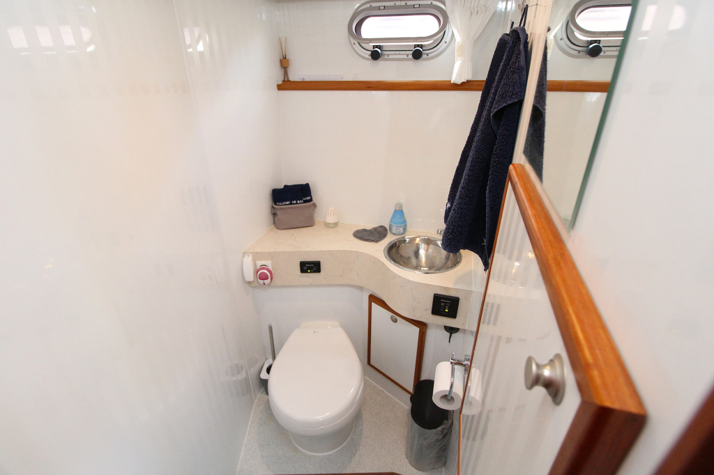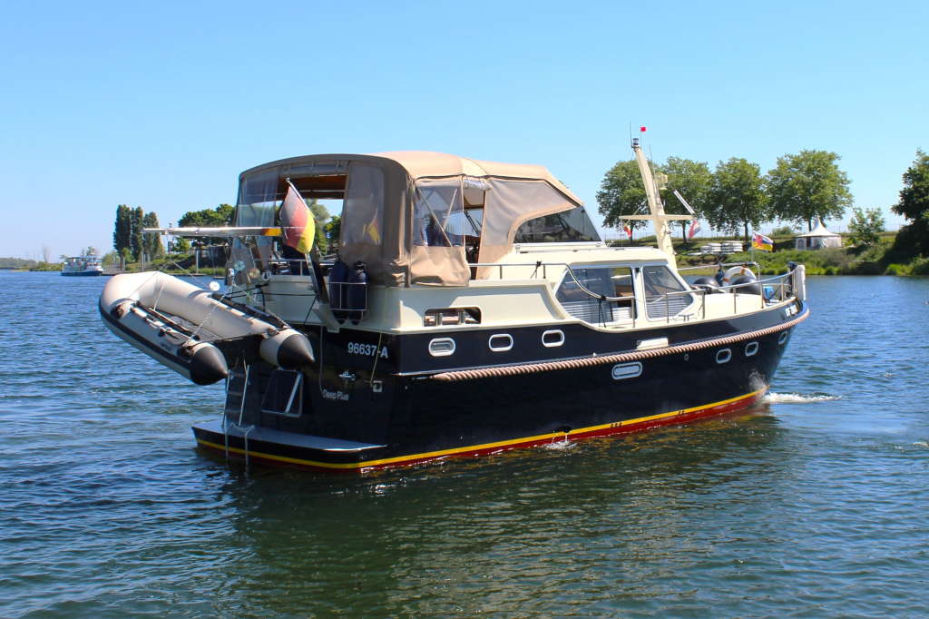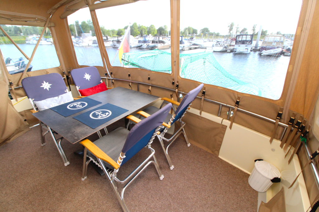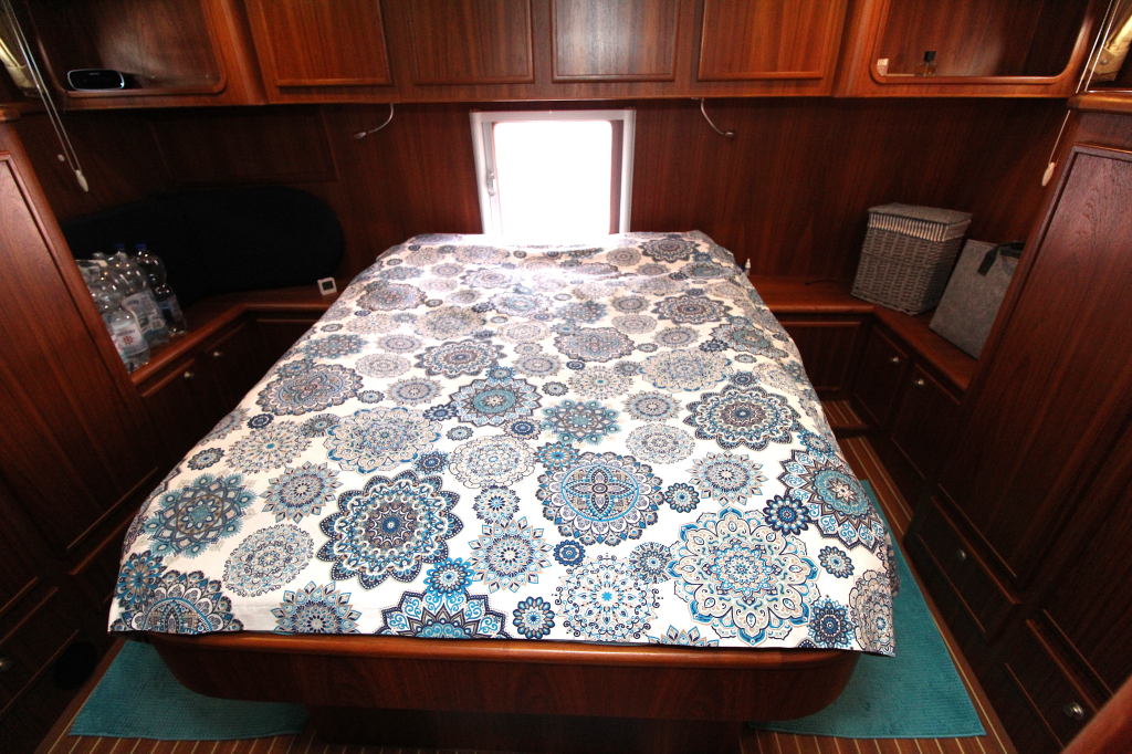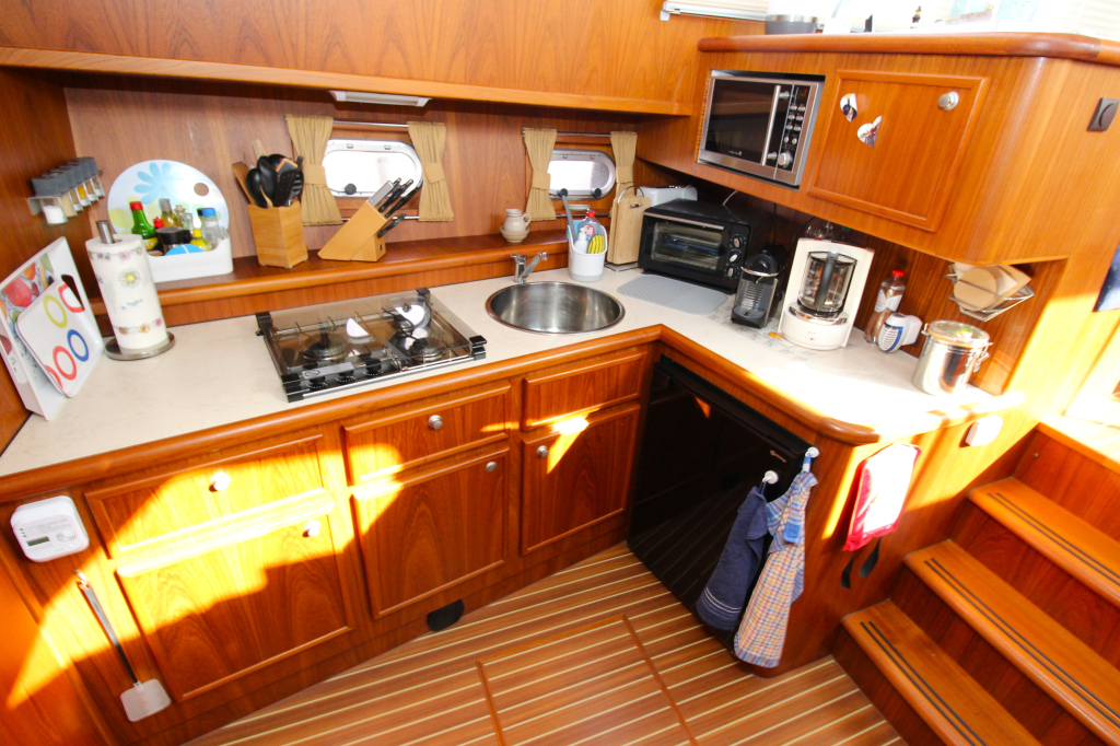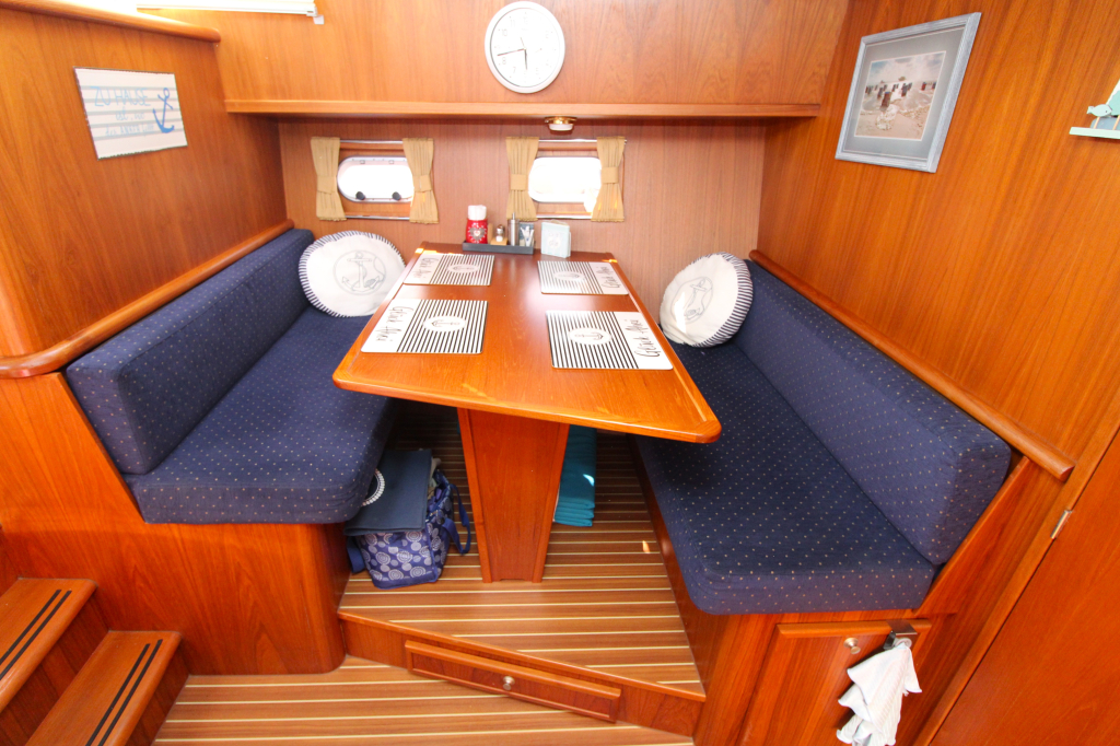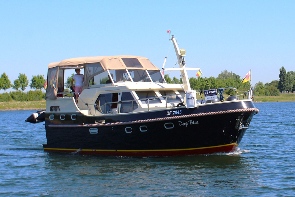 Indeling: De indeling is ruim en doordacht. Voorin bevinden zich, naast de gastenkamer in de boeg, een knusse dinette met kombuis, in het midden een gezellige salon met veel daglicht, en achterin een ruime eigenaars hut met vrijstaand bed en separate toilet- en doucheruimte.