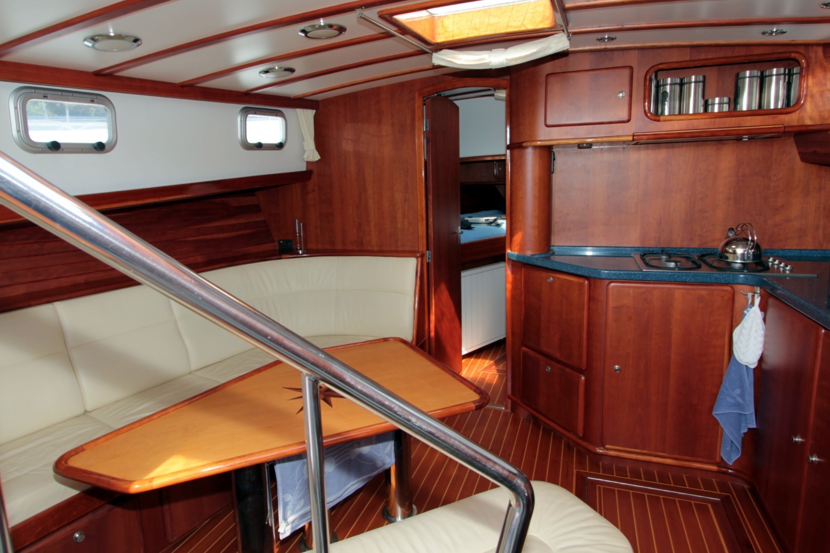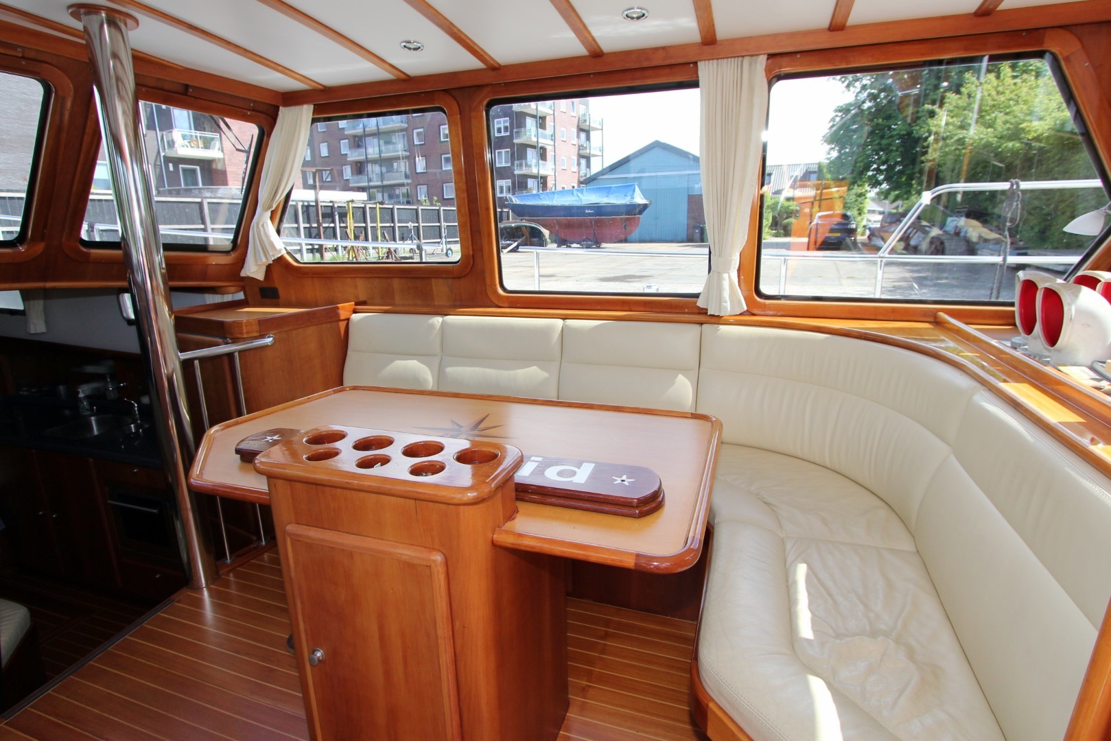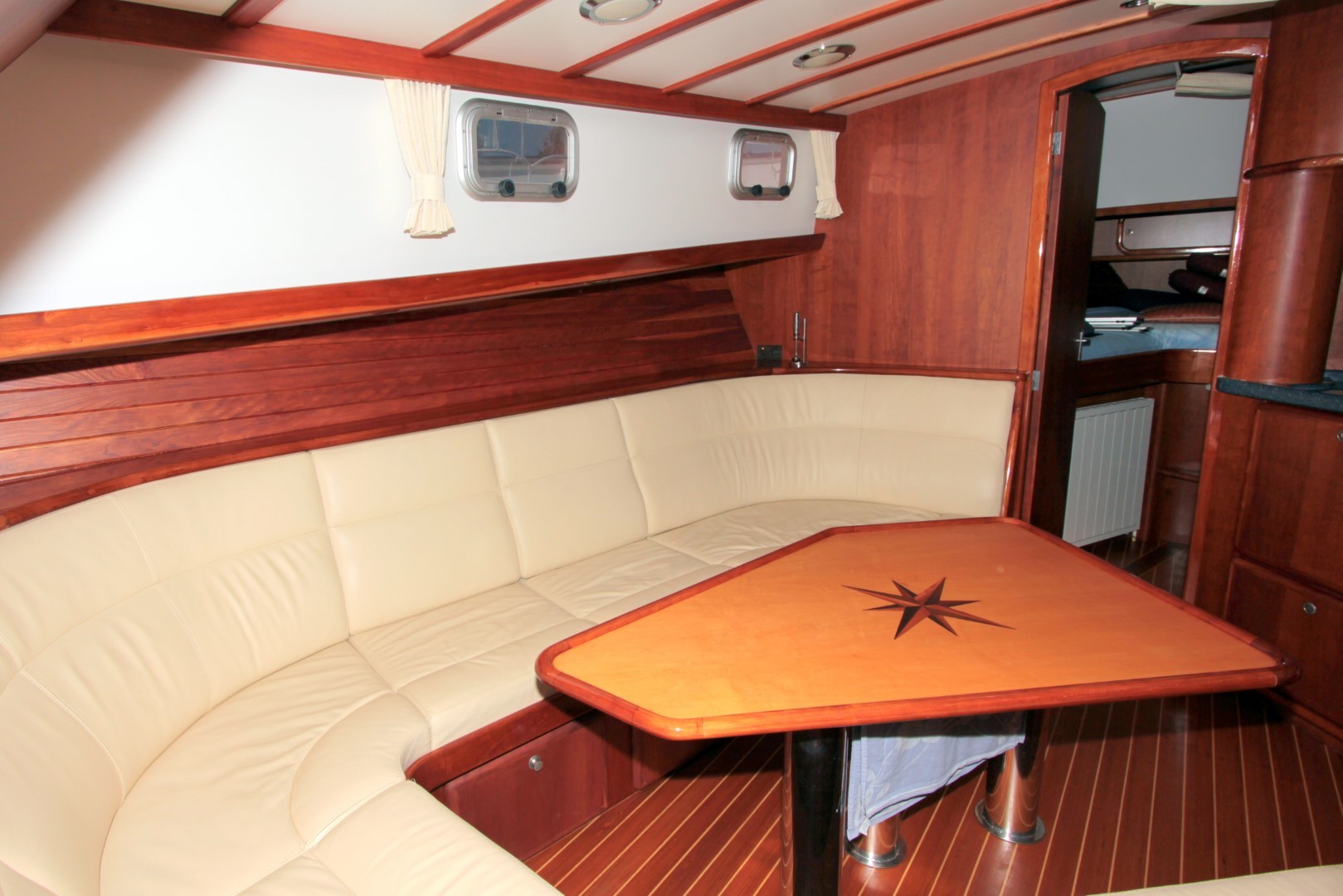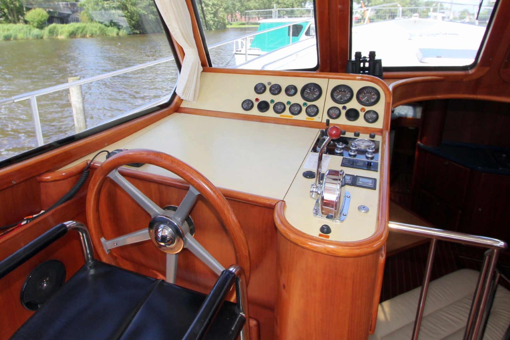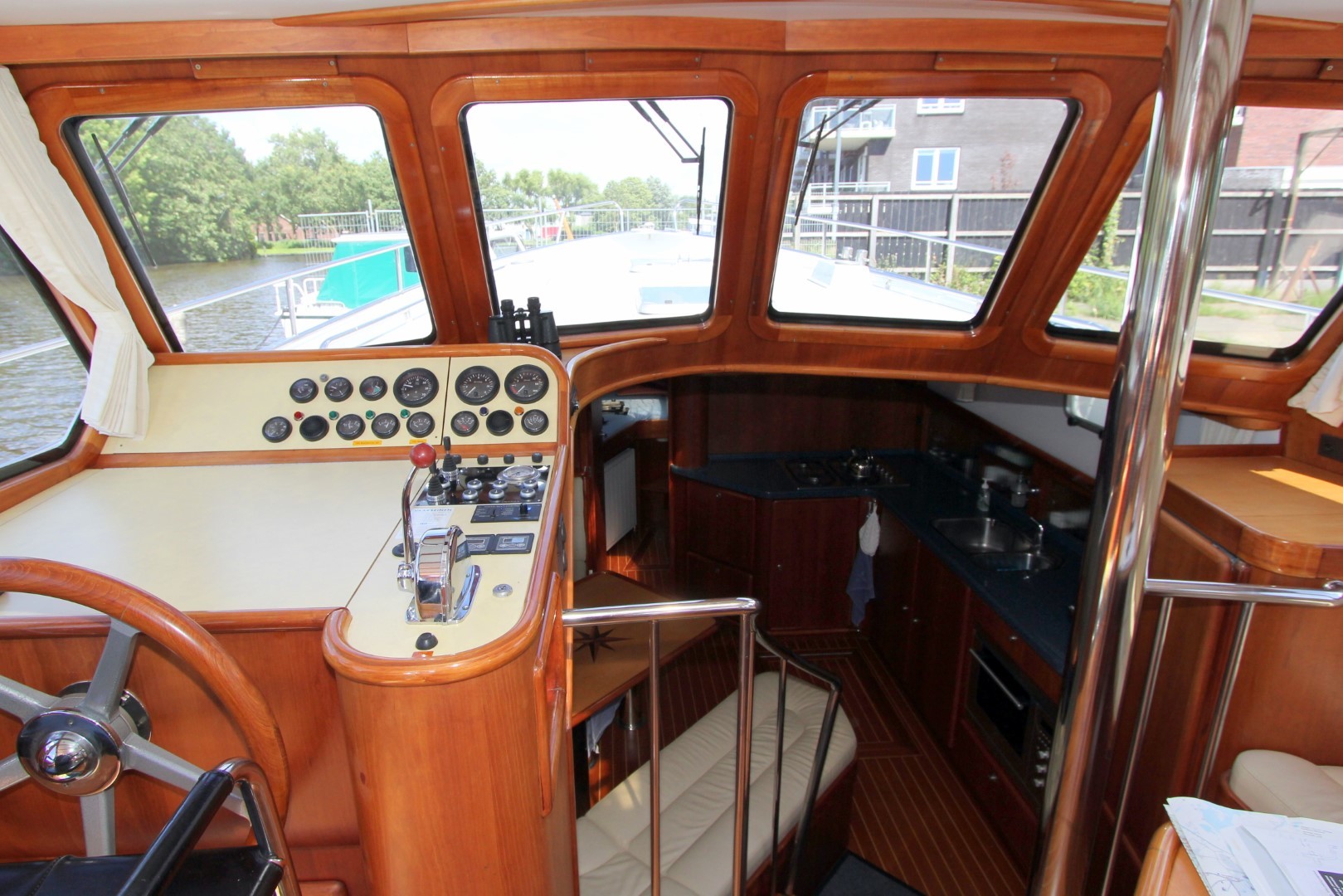 Aan boord stappend merkt u gelijk op dat het schip gebouwd is met kennis, alles is doordacht en zeer stevig gebouwd. via het verhoogde achterdek stapt u de salon binnen. daar ziet u de binnenstuurstand en een bank met hoge tafel in het stuurhuis waardoor u een fraai uitzicht rondom heeft. verder naar voren (trap af) is de gezellige salon en kombuis, het is zeer ruim opgezet waardoor u zich prima thuis kunt voelen als u aan boord zou wonen. voorin is een dubbele kooi. in het achterschip is de master cabine, ook ruim opgezet met alle voorzieningen.