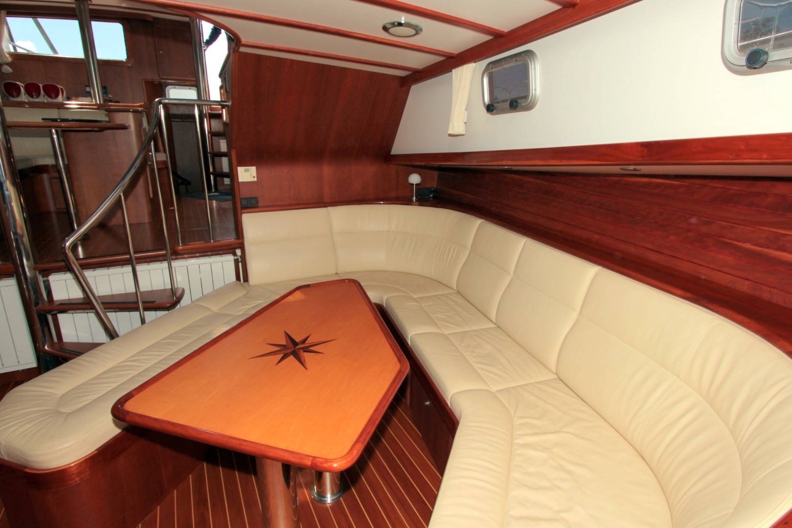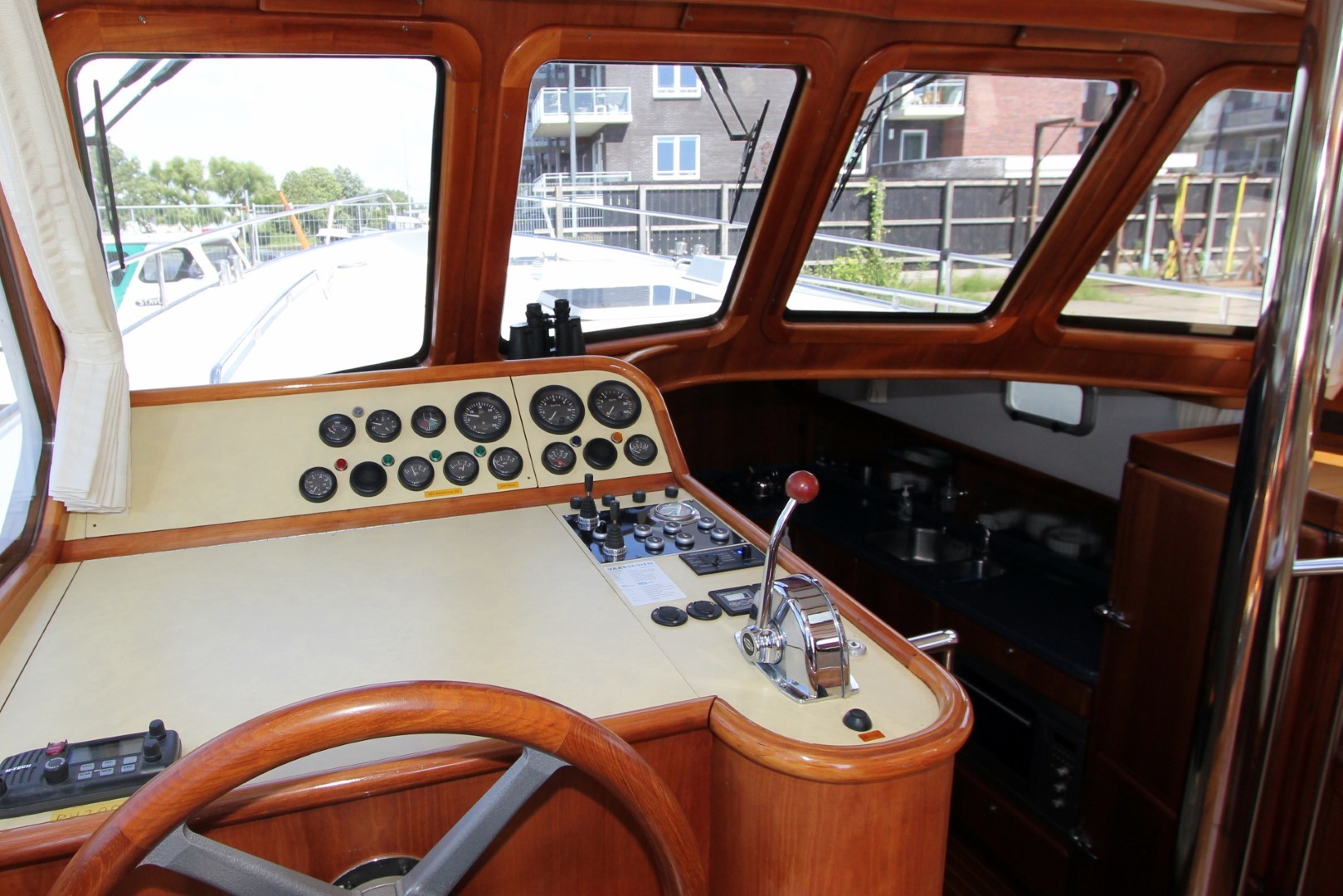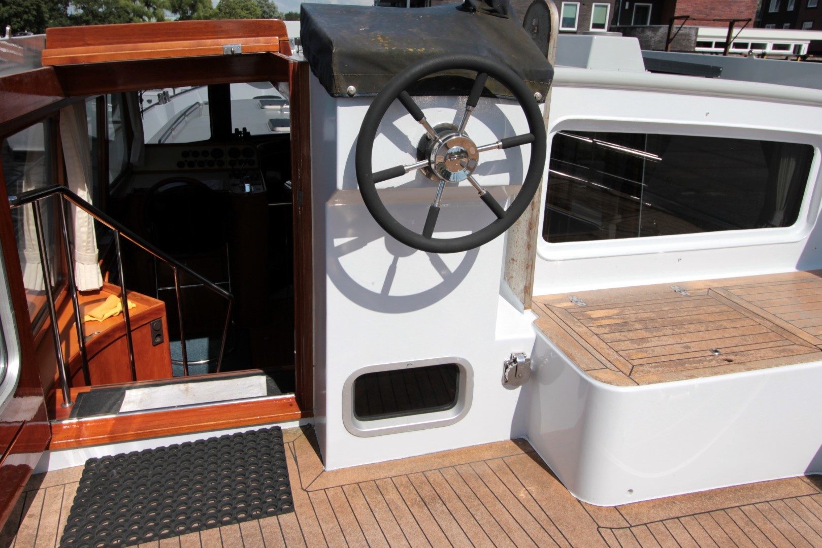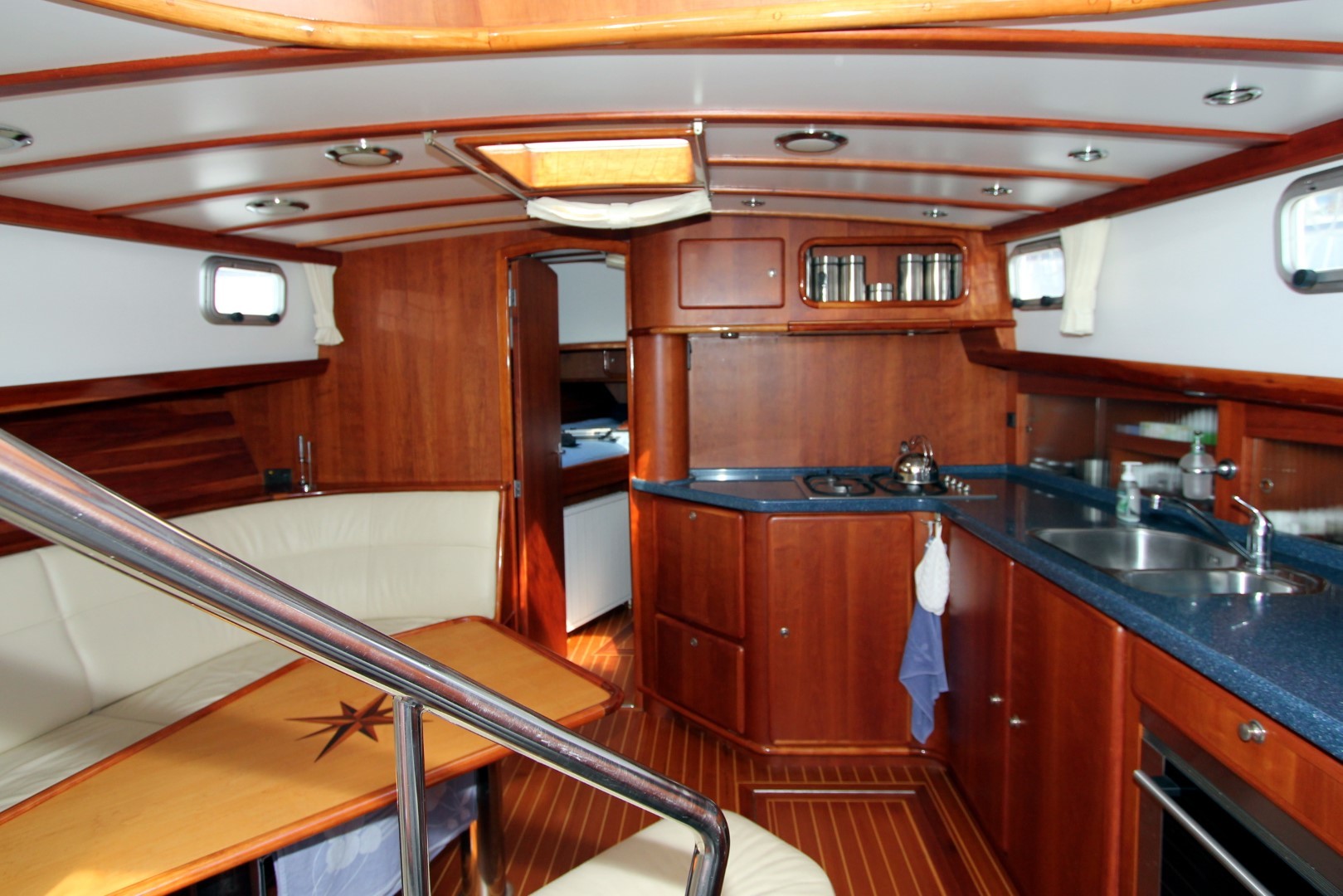 Aan boord stappend merkt u gelijk op dat het schip gebouwd is met kennis, alles is doordacht en zeer stevig gebouwd. via het verhoogde achterdek stapt u de salon binnen. daar ziet u de binnenstuurstand en een bank met hoge tafel in het stuurhuis waardoor u een fraai uitzicht rondom heeft. verder naar voren (trap af) is de gezellige salon en kombuis, het is zeer ruim opgezet waardoor u zich prima thuis kunt voelen als u aan boord zou wonen. voorin is een dubbele kooi. in het achterschip is de master cabine, ook ruim opgezet met alle voorzieningen.