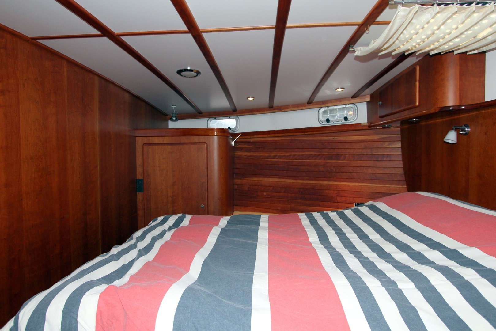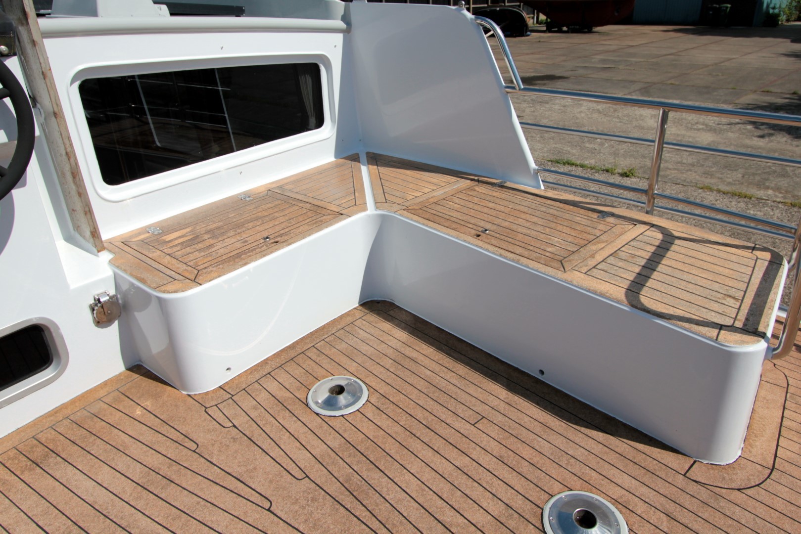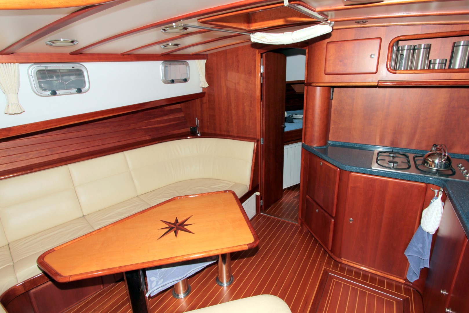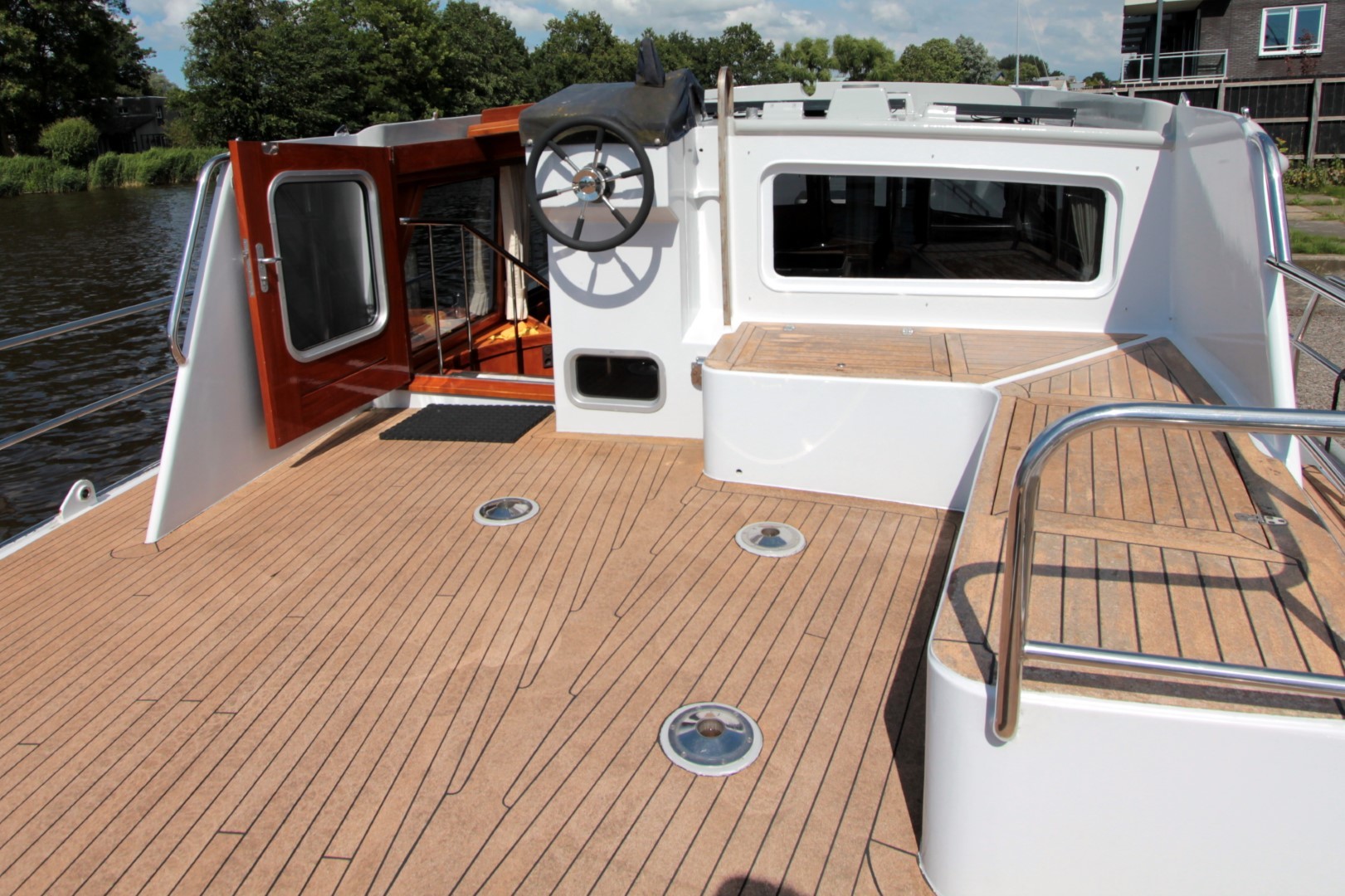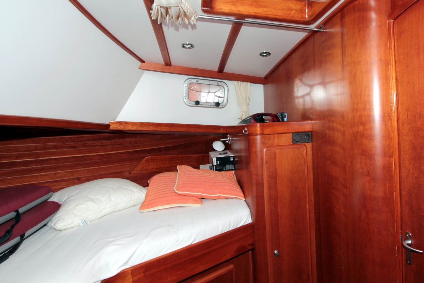 Aan boord stappend merkt u gelijk op dat het schip gebouwd is met kennis, alles is doordacht en zeer stevig gebouwd. via het verhoogde achterdek stapt u de salon binnen. daar ziet u de binnenstuurstand en een bank met hoge tafel in het stuurhuis waardoor u een fraai uitzicht rondom heeft. verder naar voren (trap af) is de gezellige salon en kombuis, het is zeer ruim opgezet waardoor u zich prima thuis kunt voelen als u aan boord zou wonen. voorin is een dubbele kooi. in het achterschip is de master cabine, ook ruim opgezet met alle voorzieningen.