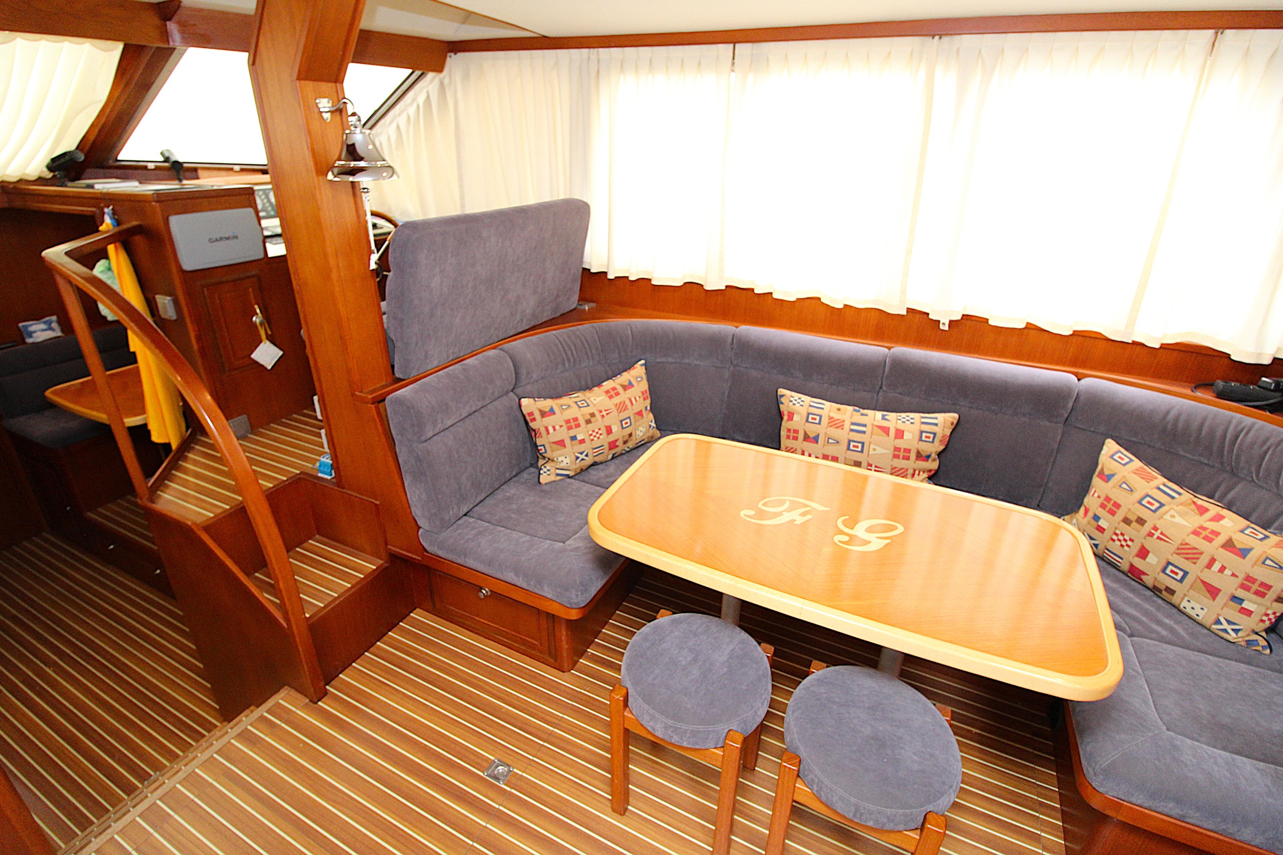 Gangboorden: Flex-Teak. Flybridge en Achterdek: Teakhout (behoeft onderhoud).