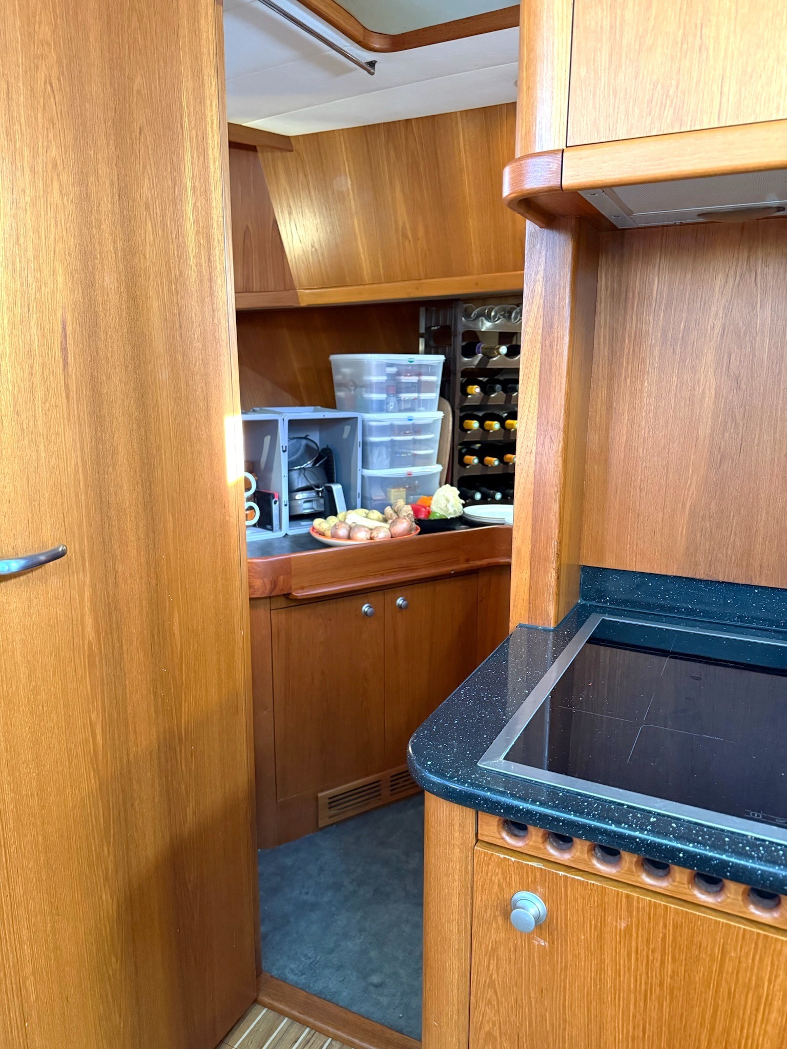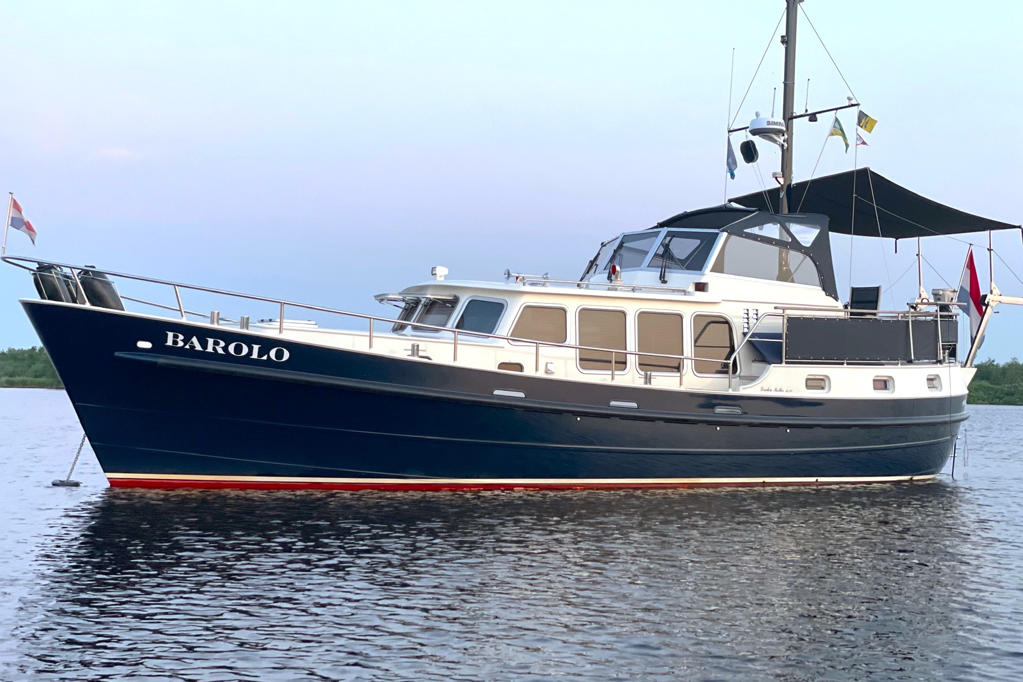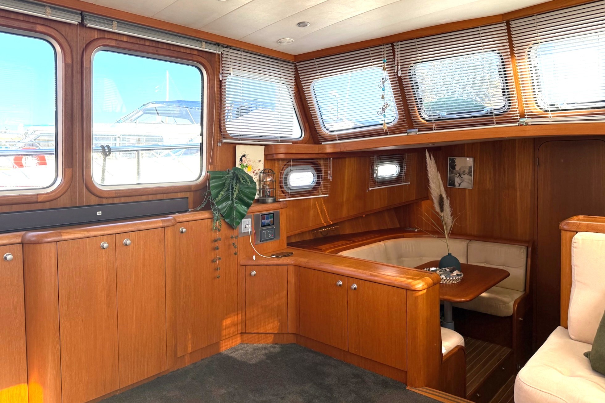 Beautiful and very complete Linden Kotter 13.70 spitsgat is now offered by her second (Dutch) owner. The dark blue round bilge hull has been expertly jogged, which makes it virtually indestructible. This ship is not only very complete, but also equipped with many recent upgrades/innovations. See the complete specifications for an impression. From air conditioning and central heating to double glazing and from generator to solar panels, really everything is on it. Also a very complete and powerful Victron system, hydraulic bow and stern thruster and anchor winch, stainless steel davits, custom sunroof over the aft deck, you can't think of anything as crazy. The current owner uses the guest cabin (foreship) as a storage room. However, the beds can be put back into use immediately.