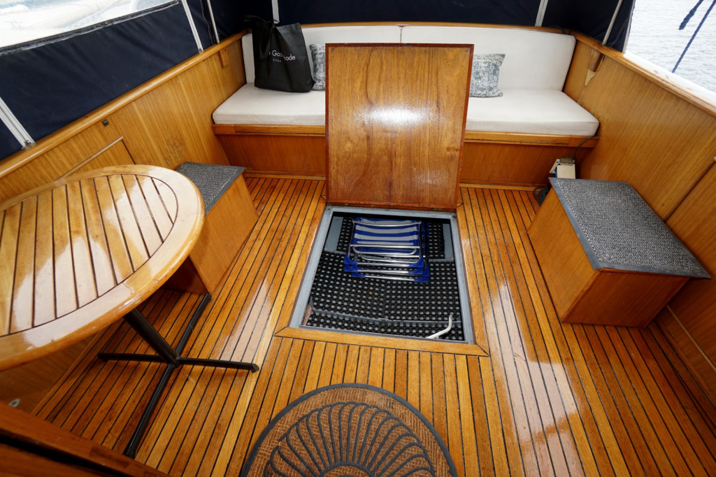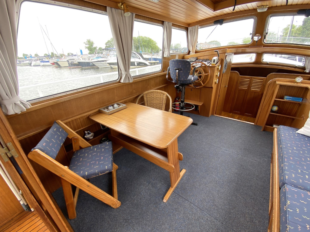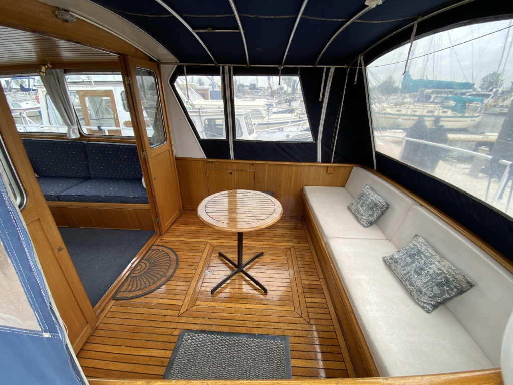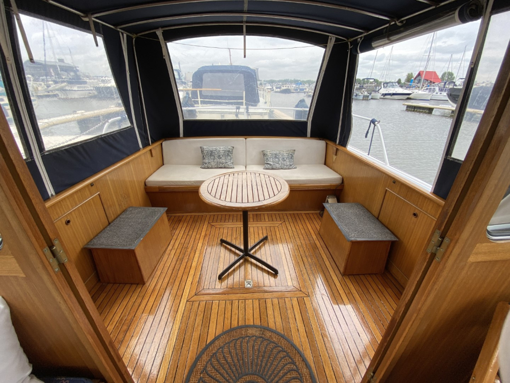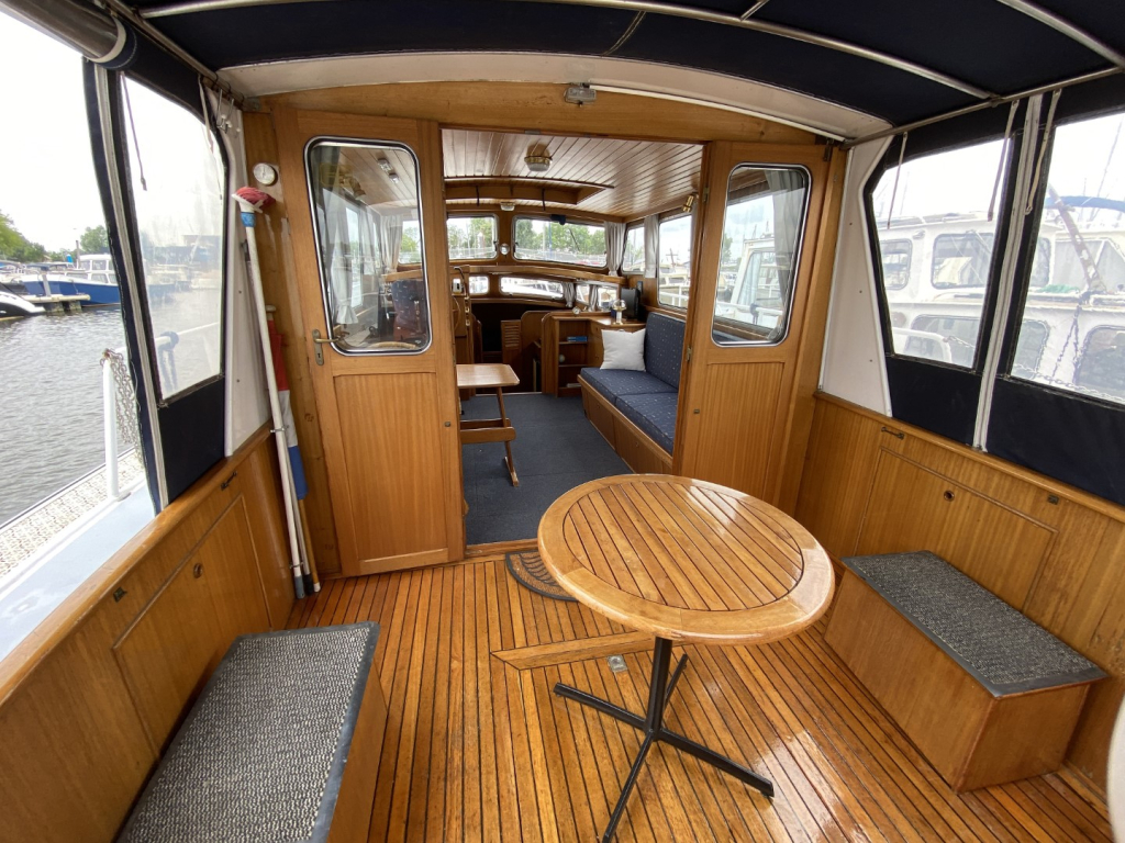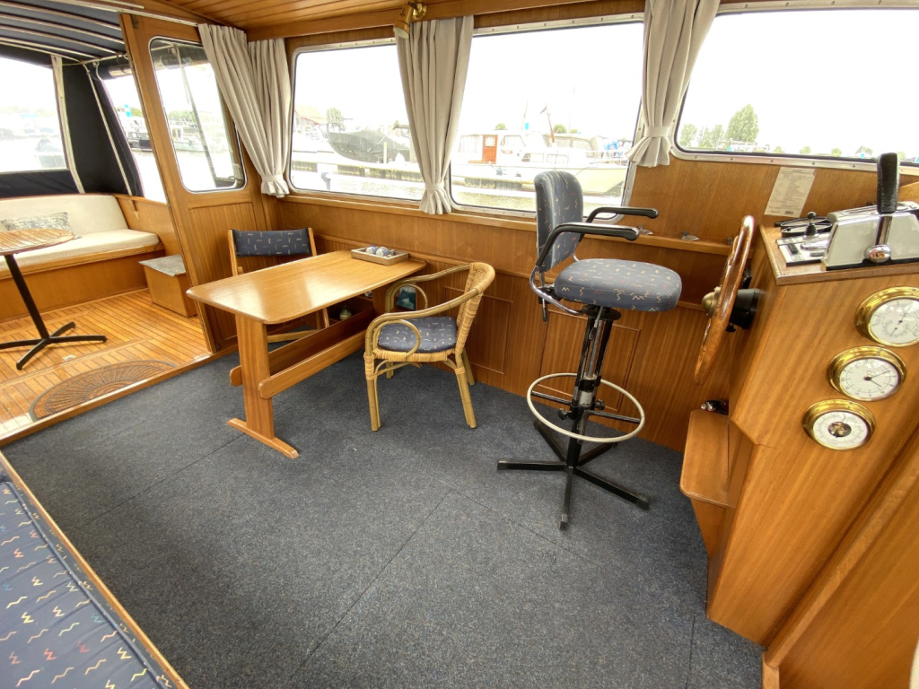 De romp en opbouw zijn volledig van staal en verkeren in goede staat. Dankzij de open kuip is er een naadloze overgang tussen binnen en buiten, wat zorgt voor een bijzonder ruimtelijk gevoel. Het interieur is uitgevoerd in degelijk teakhout en straalt warmte en vakmanschap uit. Binnen treft u een gezellige salon met voldoende zitplaatsen en zicht rondom, een compacte maar volledig uitgeruste kombuis, een afgesloten toiletruimte en een comfortabele semi-afgesloten slaaphut in het voorschip met V-bed.