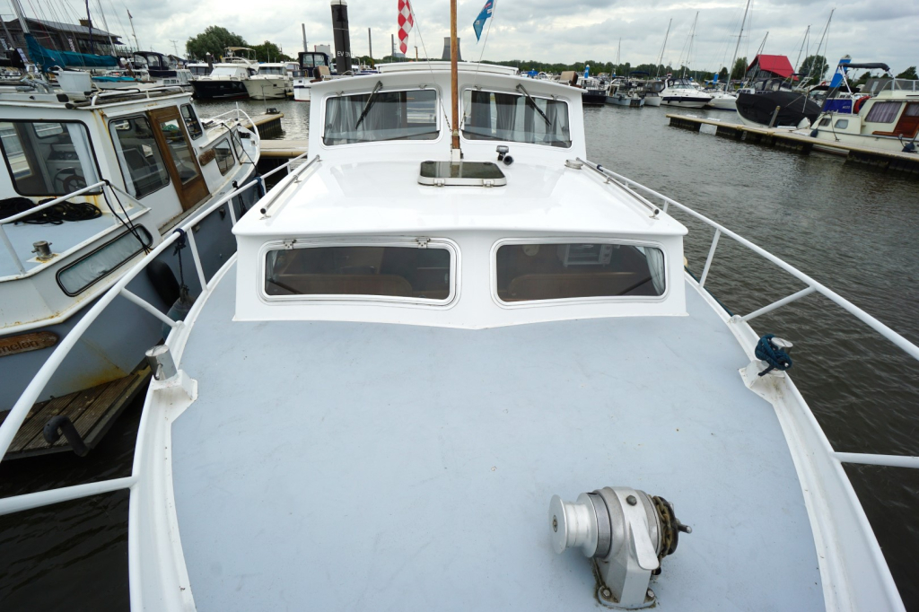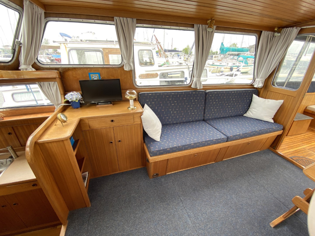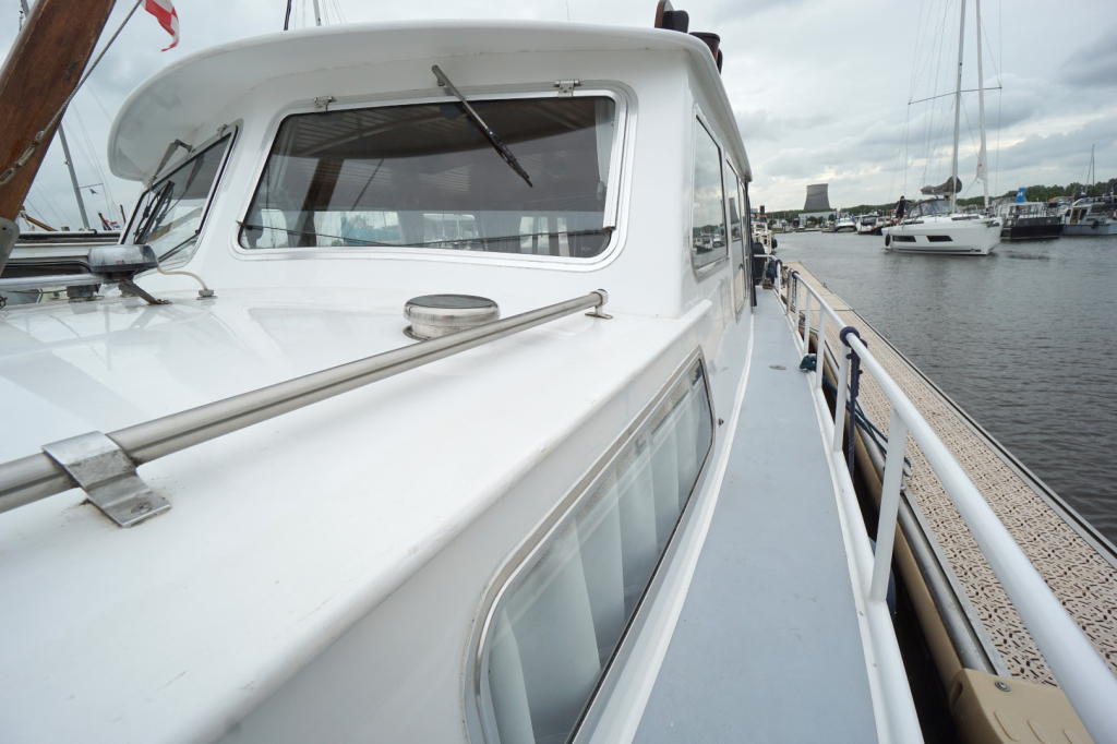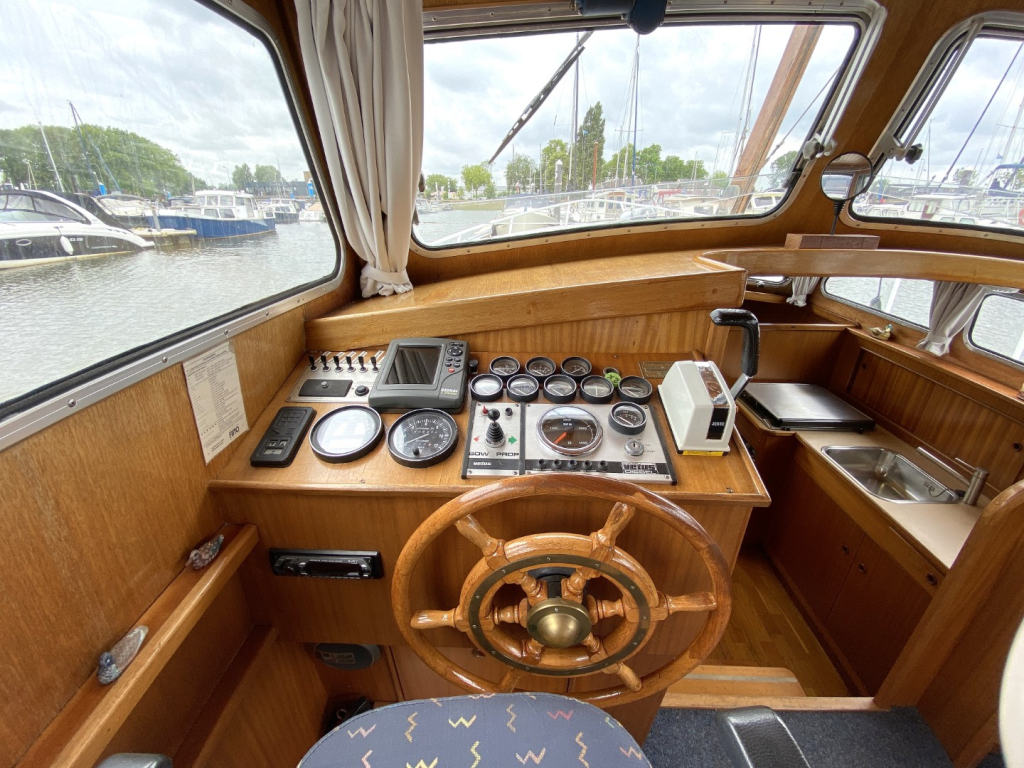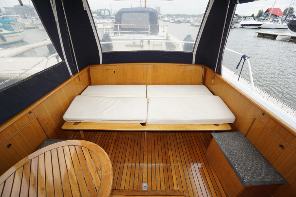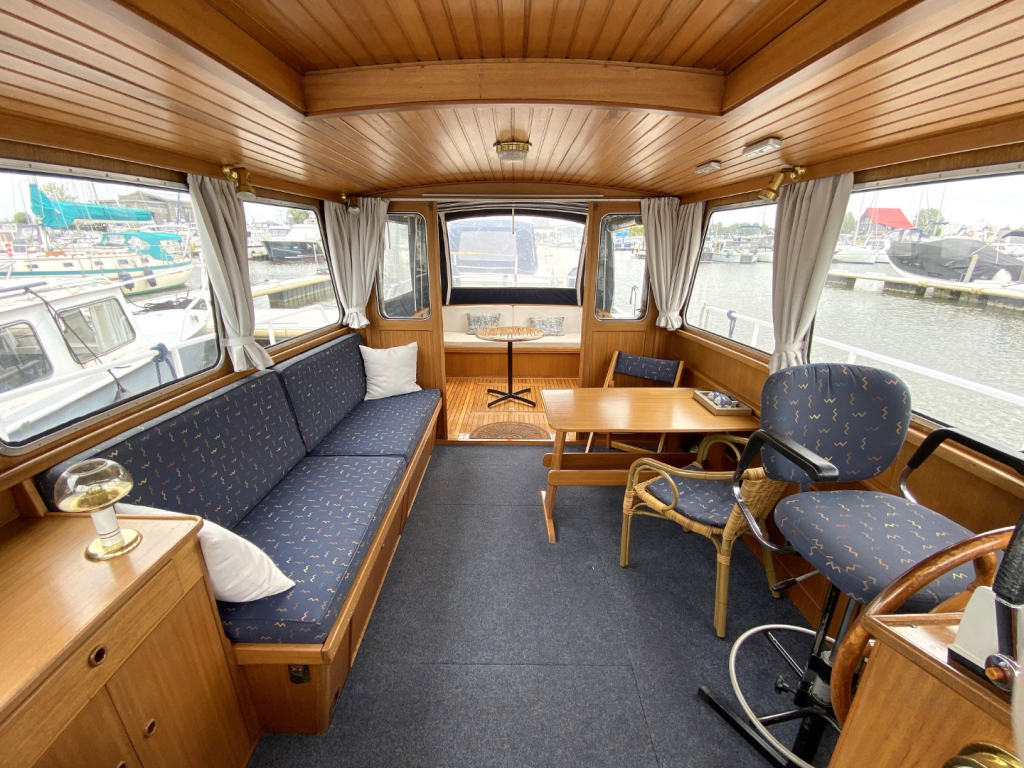 De romp en opbouw zijn volledig van staal en verkeren in goede staat. Dankzij de open kuip is er een naadloze overgang tussen binnen en buiten, wat zorgt voor een bijzonder ruimtelijk gevoel. Het interieur is uitgevoerd in degelijk teakhout en straalt warmte en vakmanschap uit. Binnen treft u een gezellige salon met voldoende zitplaatsen en zicht rondom, een compacte maar volledig uitgeruste kombuis, een afgesloten toiletruimte en een comfortabele semi-afgesloten slaaphut in het voorschip met V-bed.