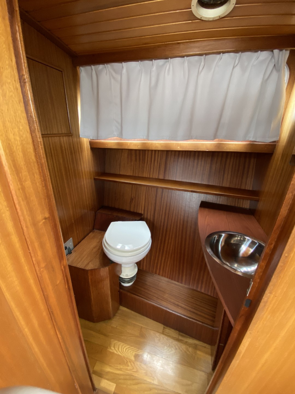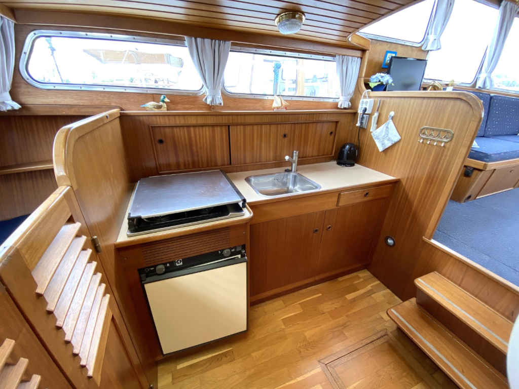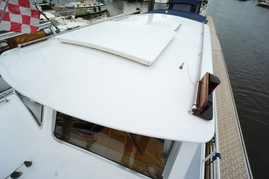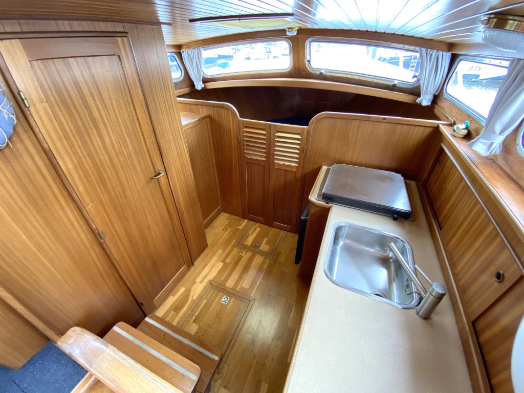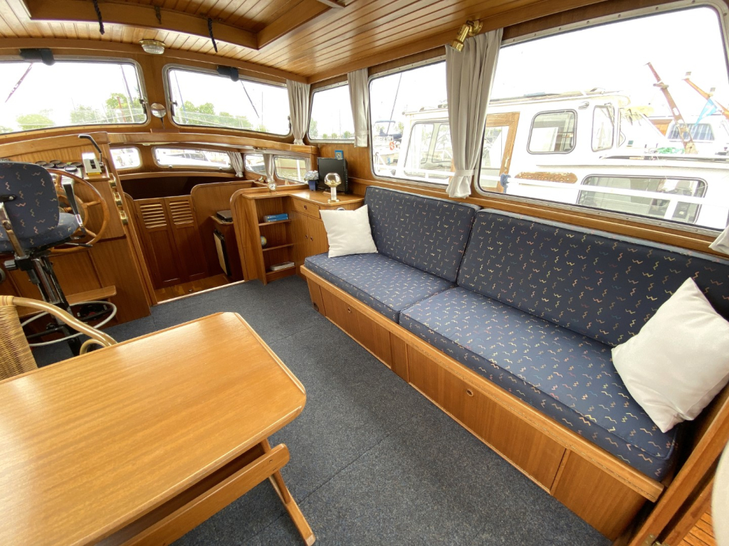 De romp en opbouw zijn volledig van staal en verkeren in goede staat. Dankzij de open kuip is er een naadloze overgang tussen binnen en buiten, wat zorgt voor een bijzonder ruimtelijk gevoel. Het interieur is uitgevoerd in degelijk teakhout en straalt warmte en vakmanschap uit. Binnen treft u een gezellige salon met voldoende zitplaatsen en zicht rondom, een compacte maar volledig uitgeruste kombuis, een afgesloten toiletruimte en een comfortabele semi-afgesloten slaaphut in het voorschip met V-bed.