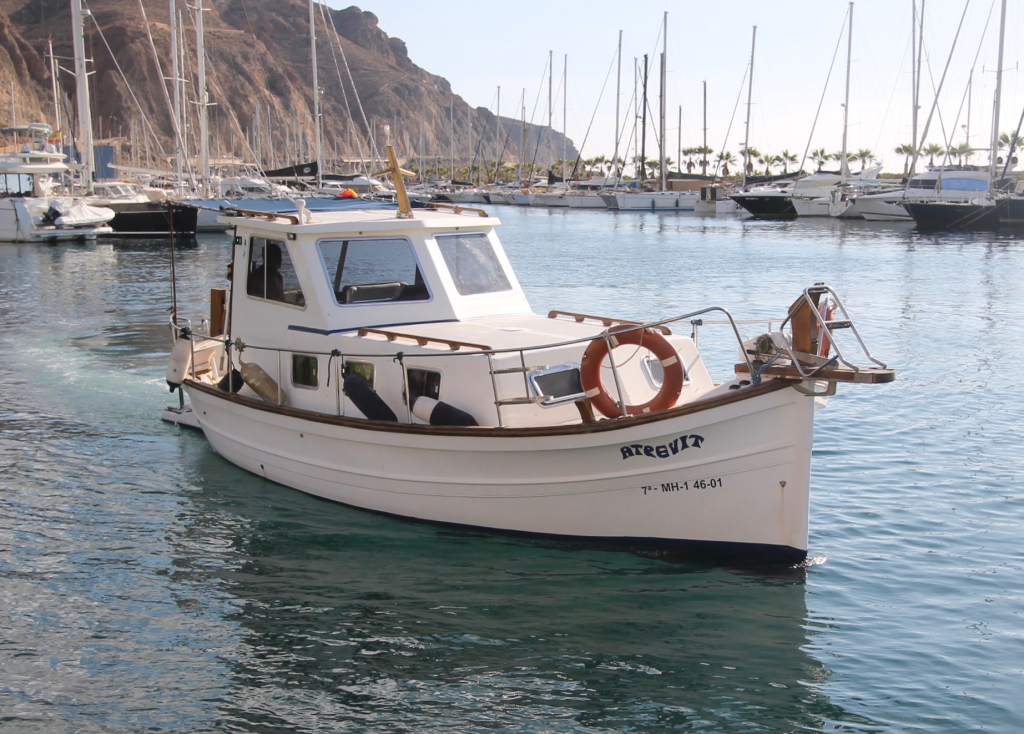 Llaut Menorquin Tiburon 44 “Atrevit” (1999) for sale in Aguadulce, Almería, Spain. Popular classic mediterranean boat design from the Balearics, Spain. Well maintained and cared for, equipped with 2 powerful Sole SM90 diesel engines. Perfect for daytrips, fishing, anchoring and even crossings! Electronics up to date with new Raymarine autopilot (2025). Covered steering area, comfortable cockpit and possibility for solarium on the cabin deck. Nice bathing platform on the stern. Sleeps 4 inside, 2 in the double bow cabin and 2 in the saloon. One bathroom. Good woodwork in- and outside. Spanish flagged with valid ITB until June 2027 and all taxes paid. Mooring 12M in property available in Puerto Deportivo Aguadulce for only €5.000 extra.