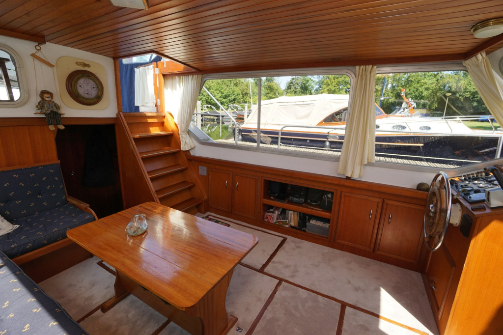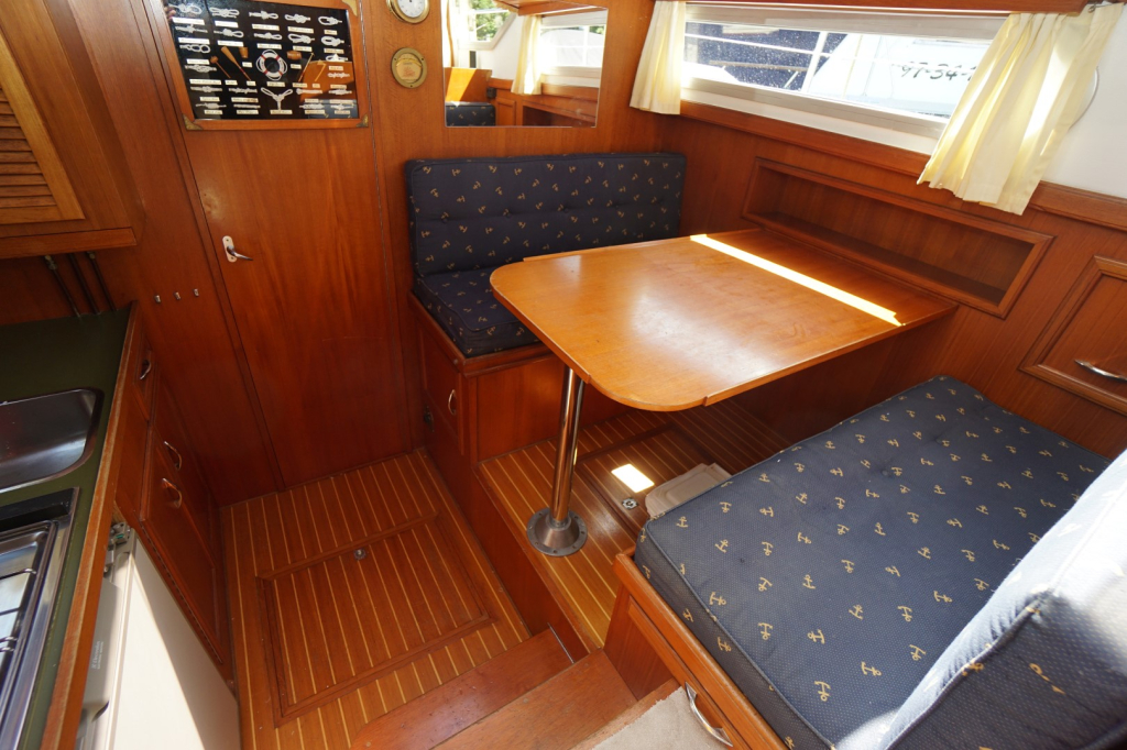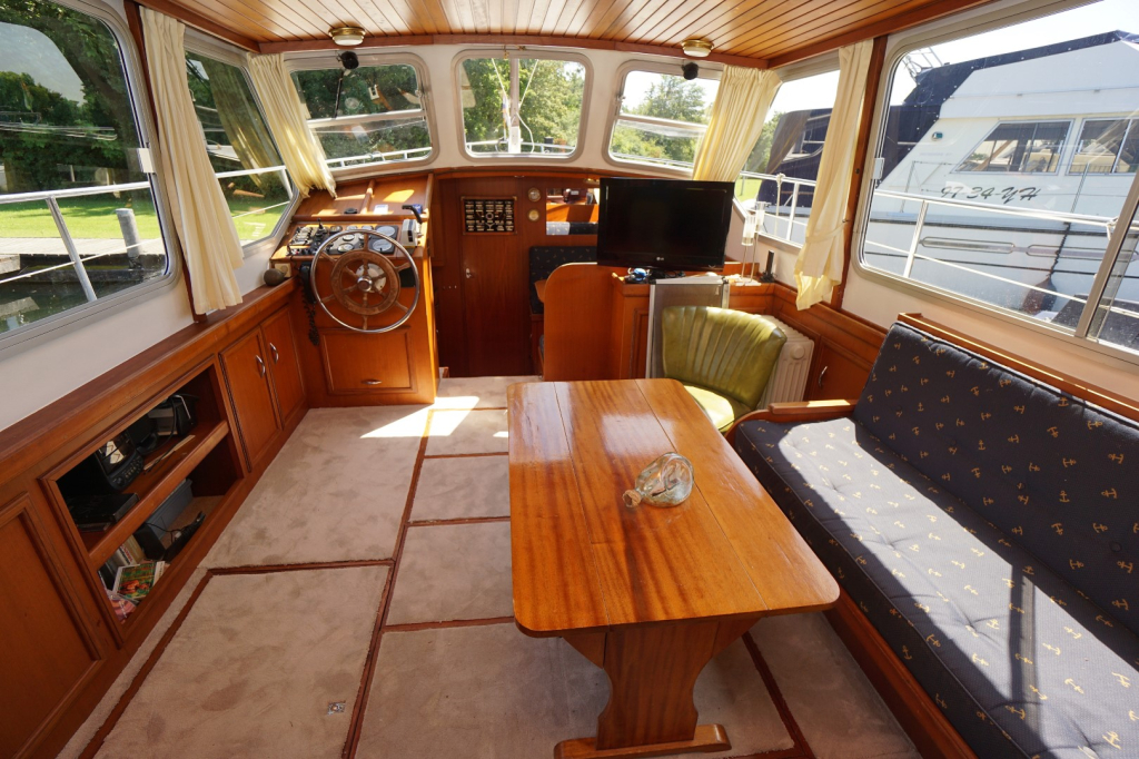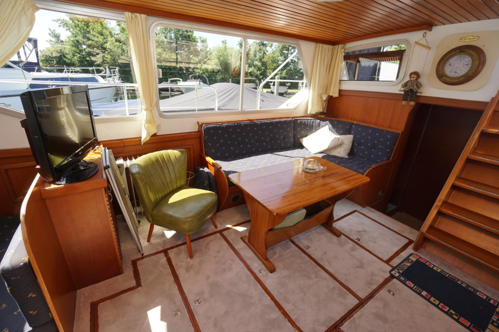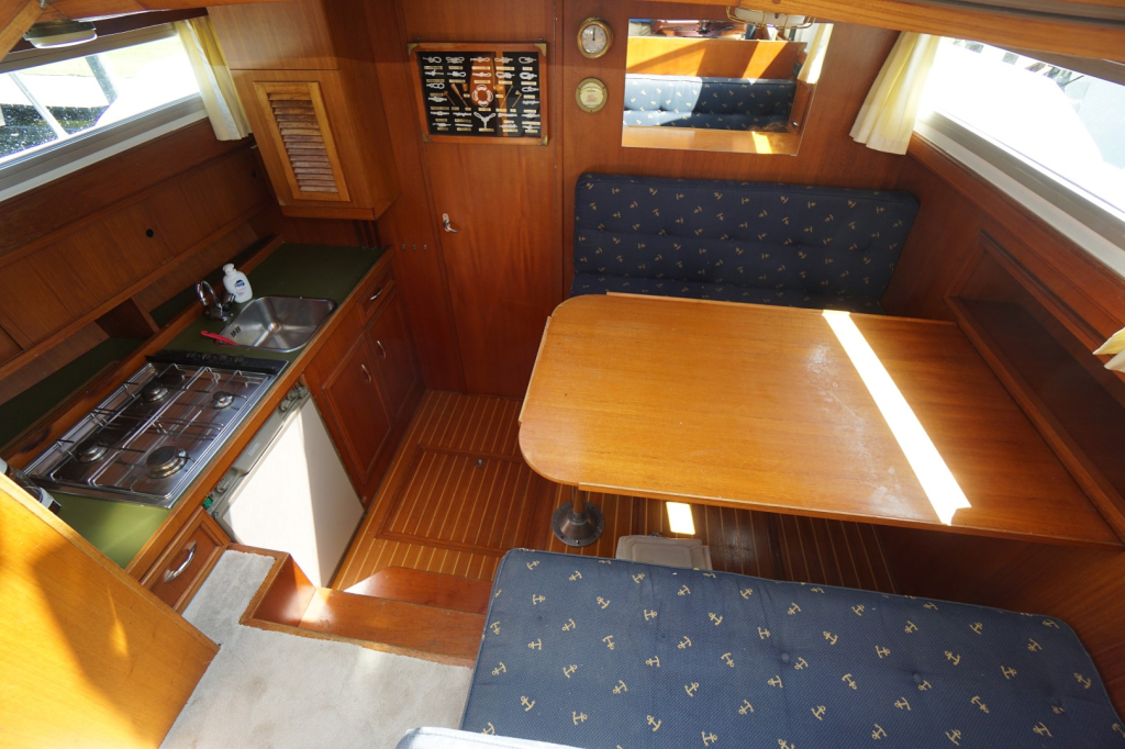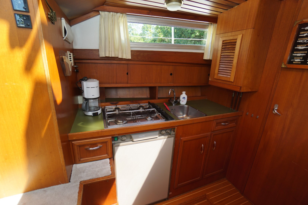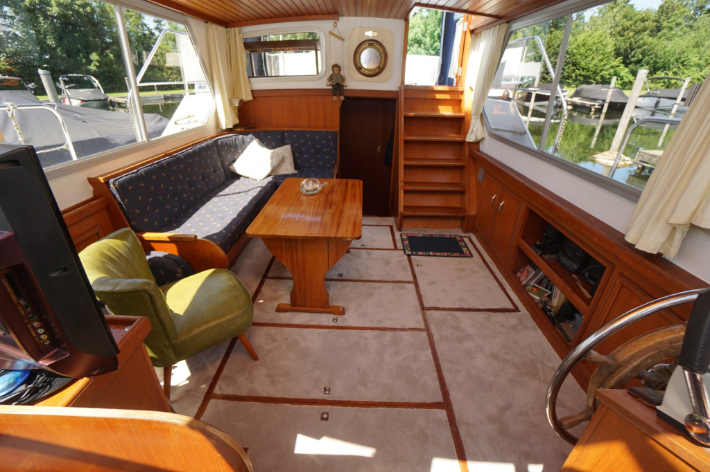 De Kempala 12.50 is gebouwd met vakmanschap en aandacht voor detail. Het royale achterdek biedt een comfortabele zitplek met goed zicht rondom. Binnen valt direct de warme sfeer op, dankzij het gebruik van mooie teakhouten afwerking en de doordachte indeling. De salon is licht en uitnodigend, met voldoende ruimte om te ontspannen of gasten te ontvangen. De kombuis is volledig uitgerust en biedt alles wat nodig is om aan boord te koken maar daar tegenover een gezellige dinette, welke overigens ook eenvoudig als extra slaapplaats te gebruiken is.
