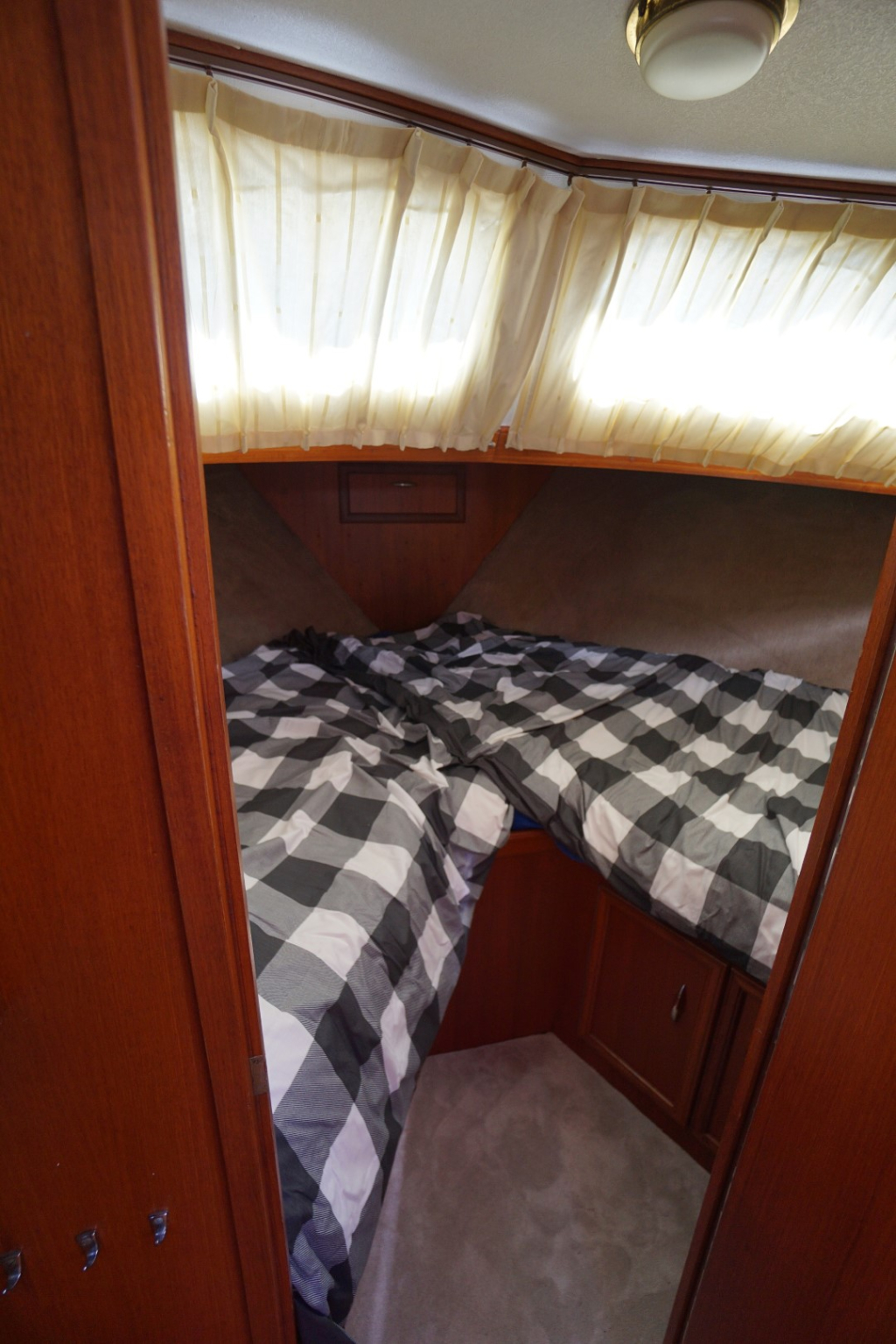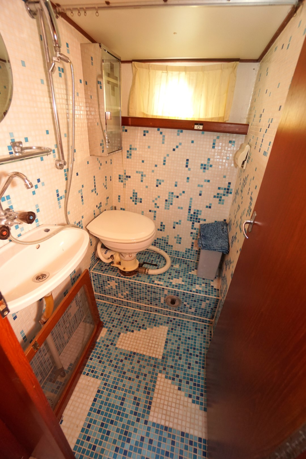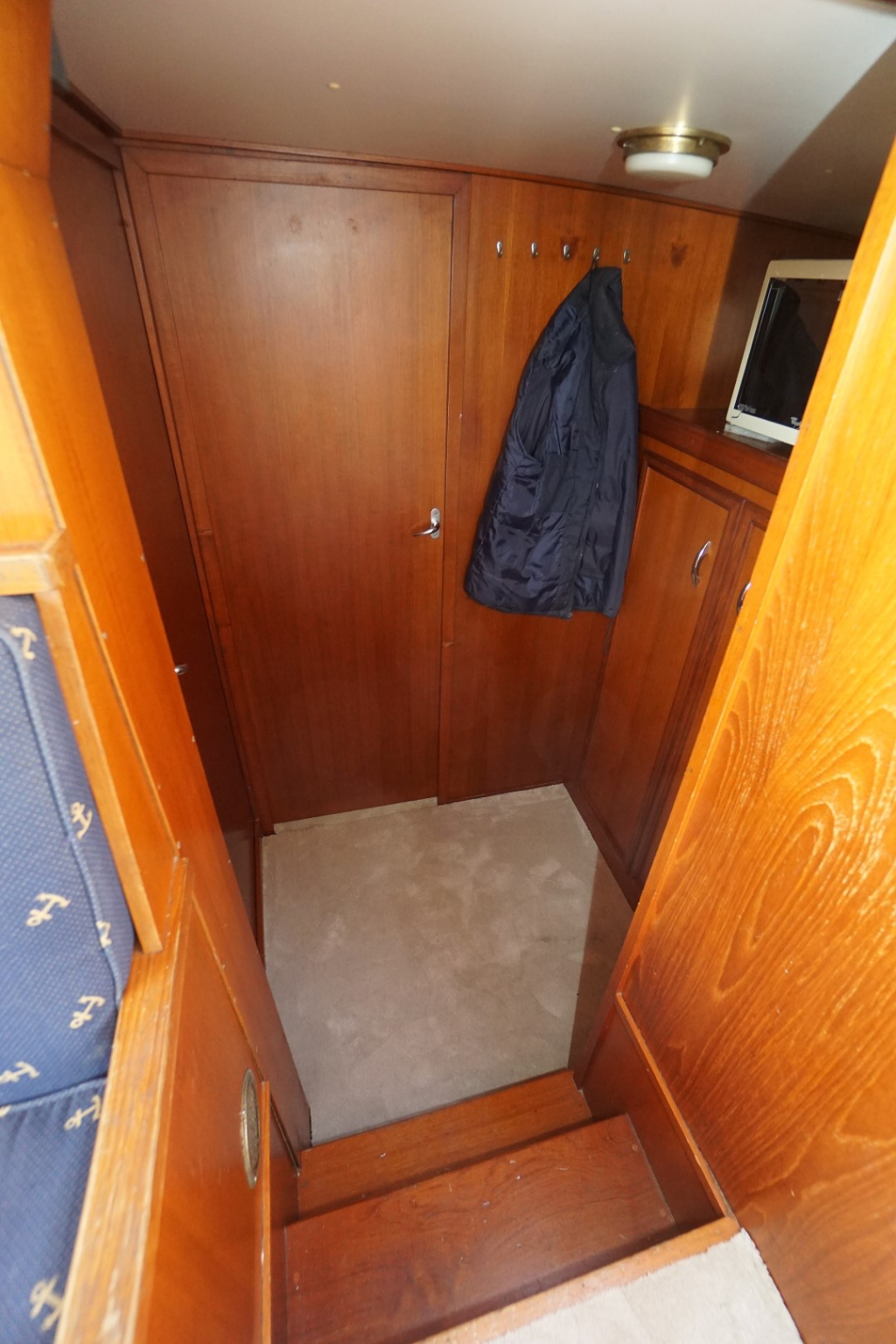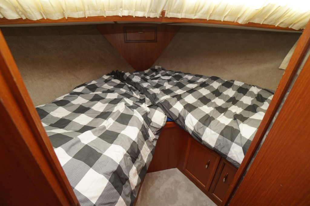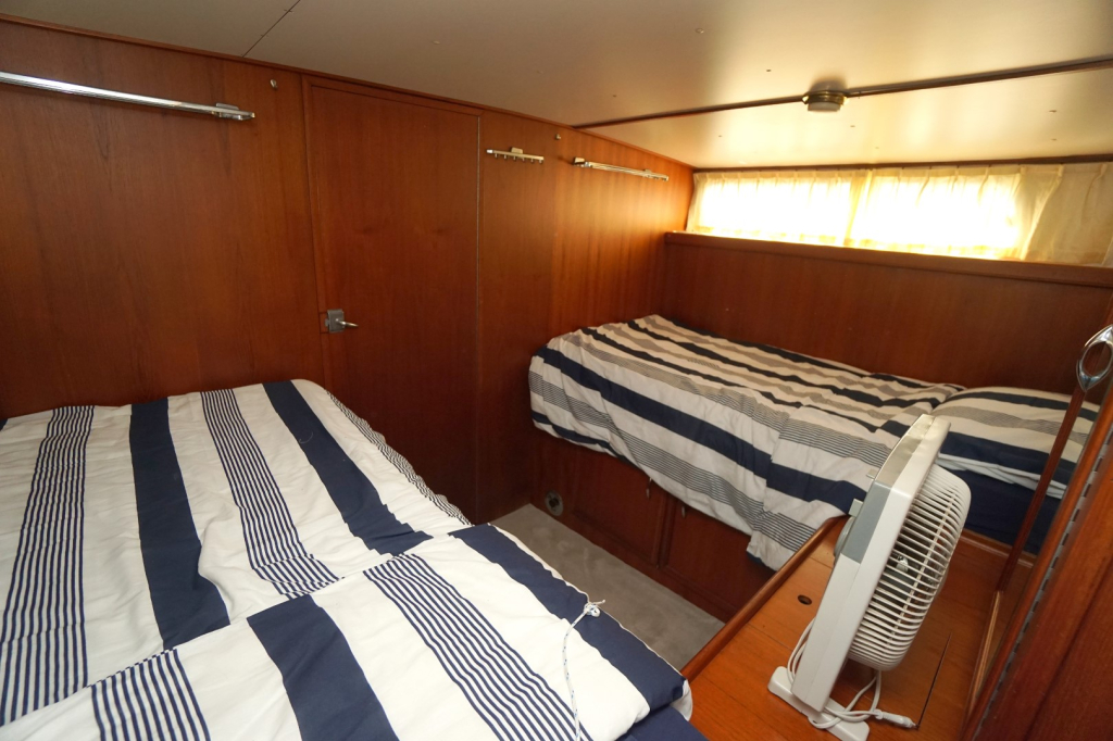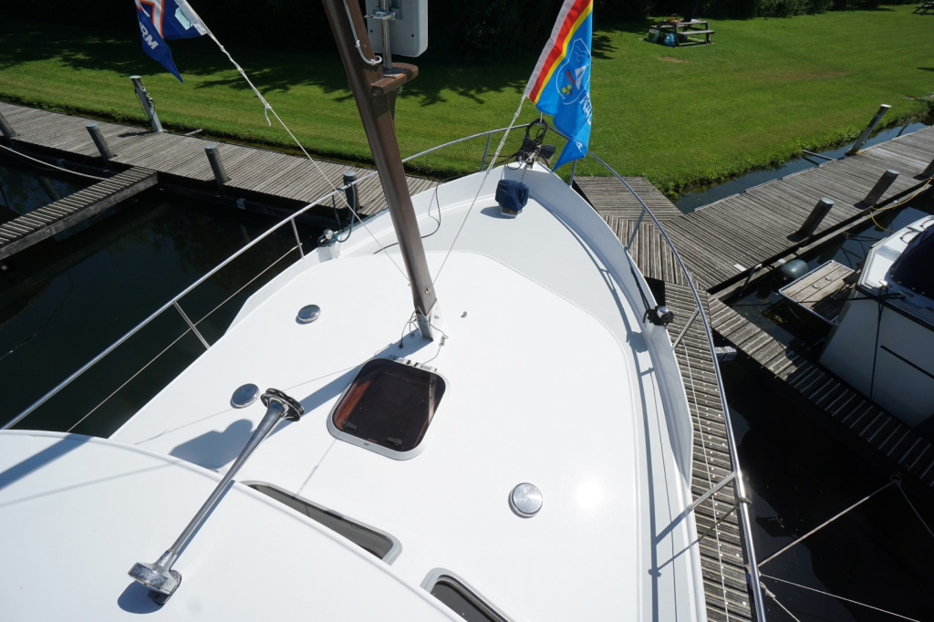 Onderdeks bevinden zich een ruime slaaphut met een tweepersoonsbed en voldoende kastruimte, evenals een extra hut in het vooronder met twee slaapplaatsen, ideaal voor familie of gasten. De natte cel is praktisch ingericht met toilet, wastafel en douche.