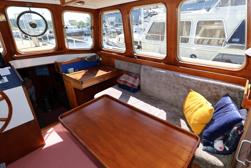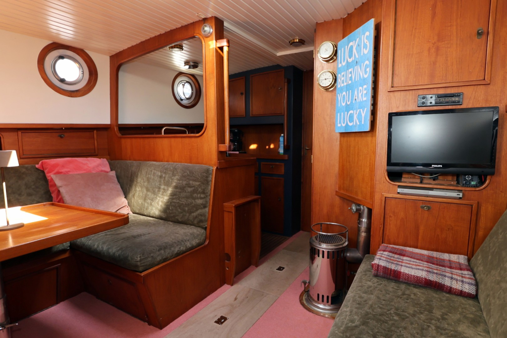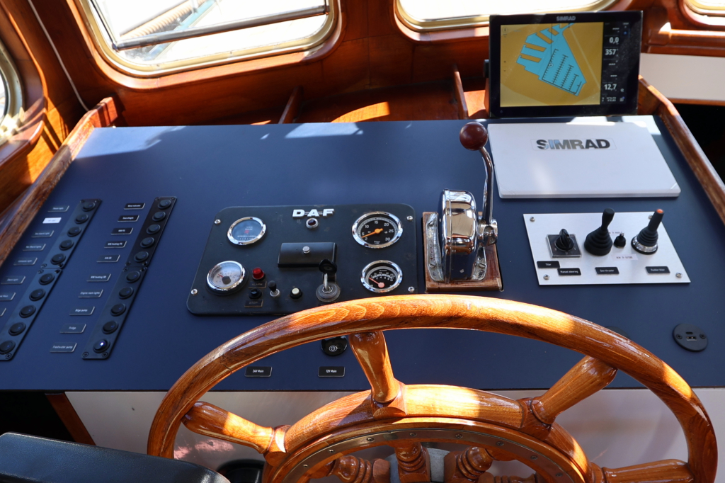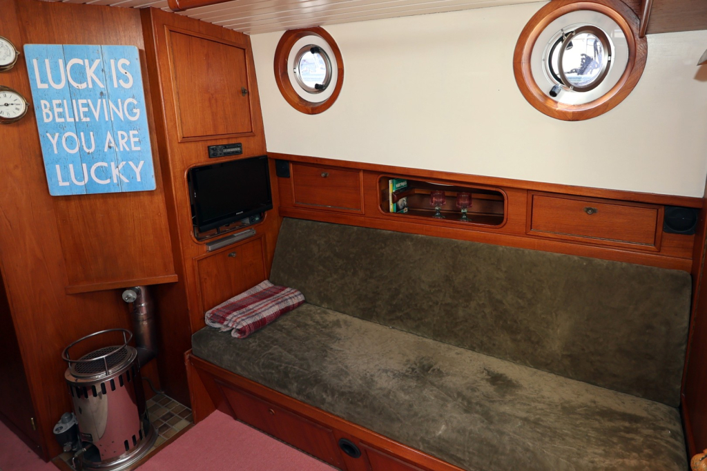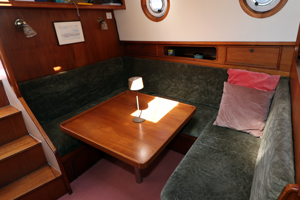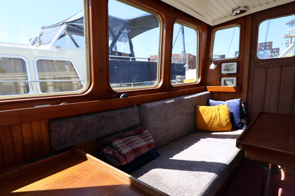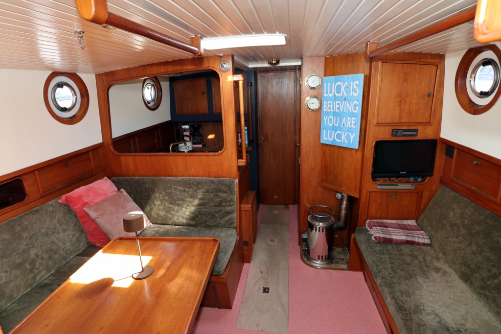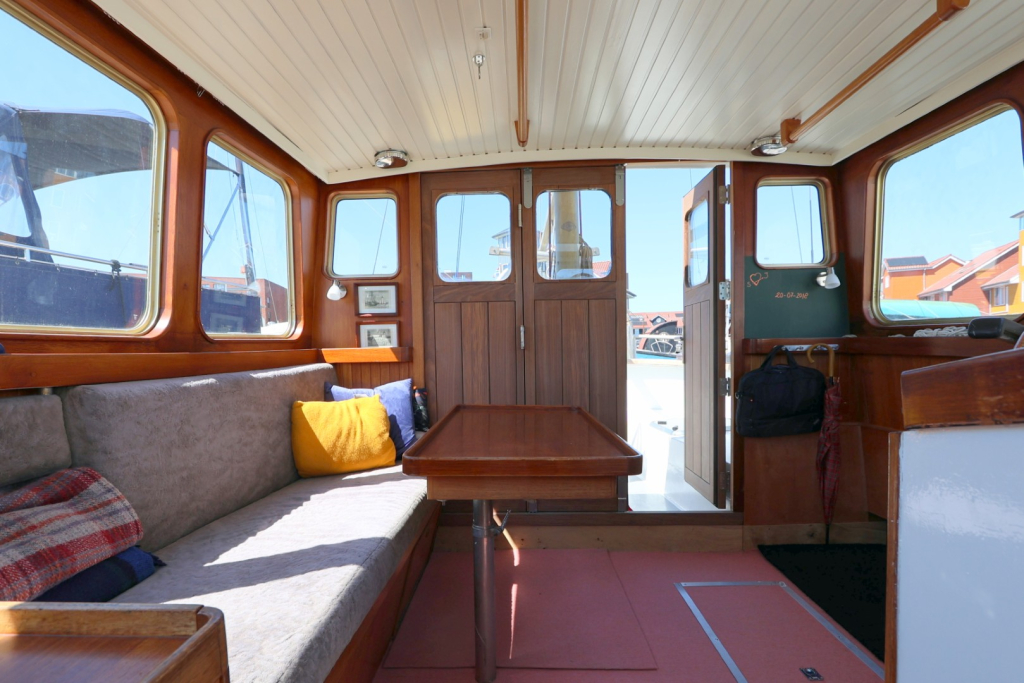 Als u binnenstapt in de kuip ziet u nieuwe hardhouten deuren geplaatst in achter schip (kunnen volledig open klappen), zodat binnen- en buiten verbonden zijn. Verder is er een nieuw elektrisch toilet geplaatst, het schakel paneel is vervangen, de stuurmachine nagekeken en voorzien van nieuwe ketting verbinding. De Eberspächer heteluchtkachel schoongemaakt en voorzien van nieuwe gloeiplug en brandstof pompje. Dan nog een nieuwe RVS diesel tank voor de reflex kachel