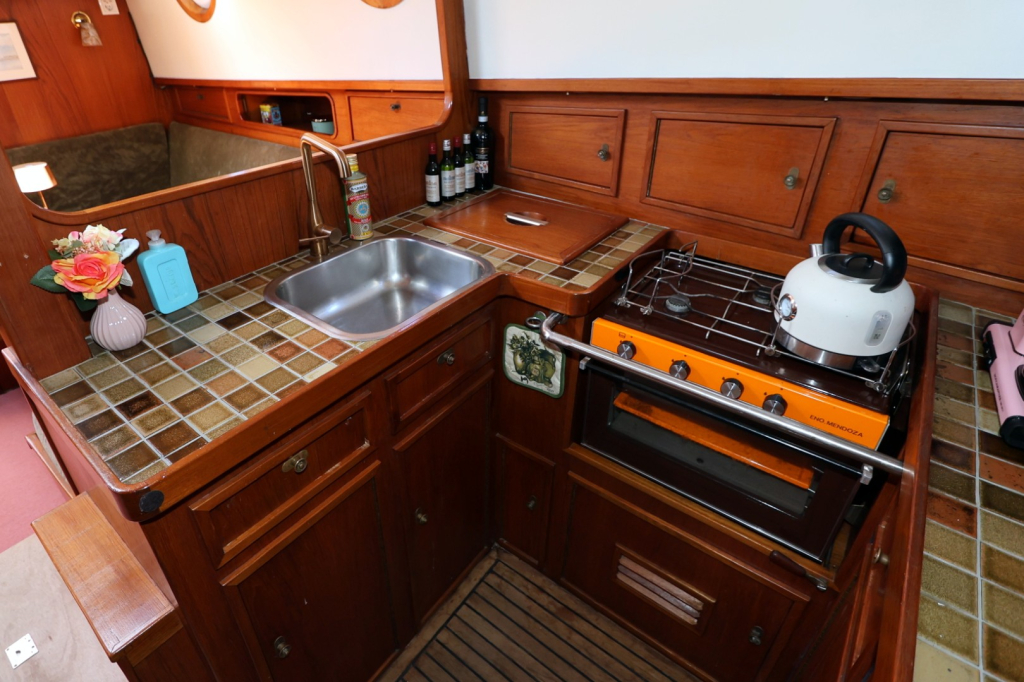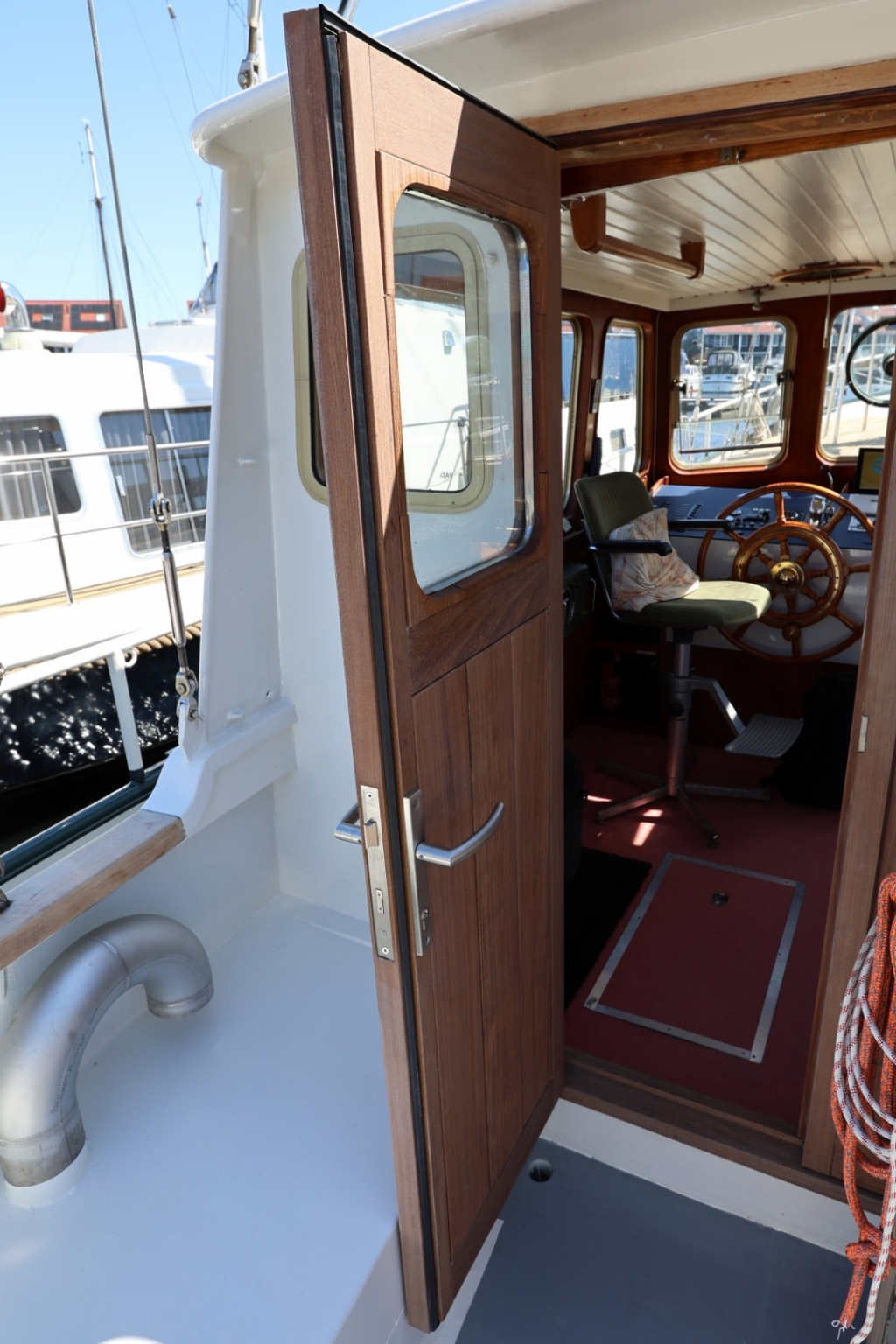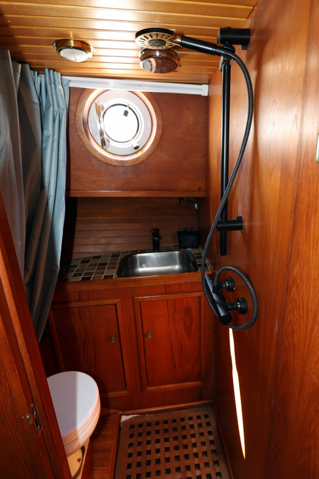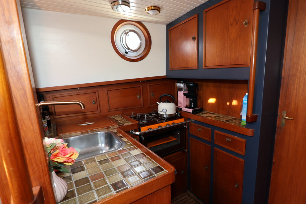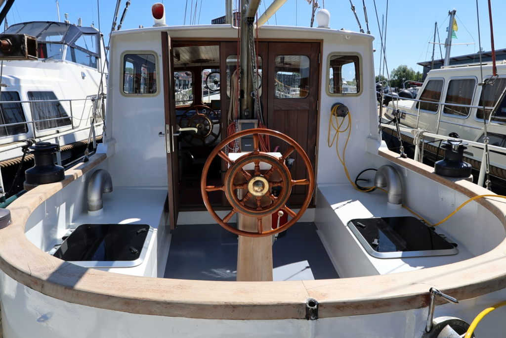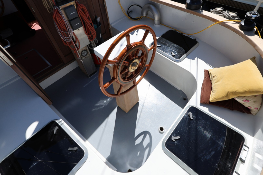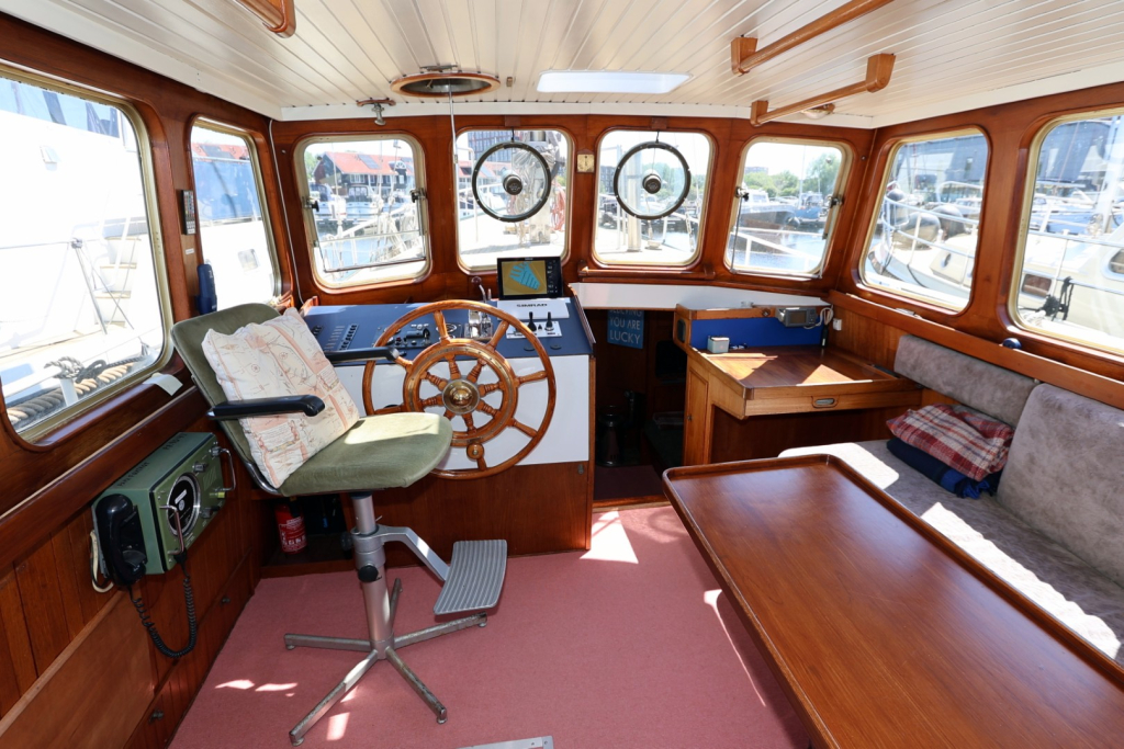 Als u binnenstapt in de kuip ziet u nieuwe hardhouten deuren geplaatst in achter schip (kunnen volledig open klappen), zodat binnen- en buiten verbonden zijn. Verder is er een nieuw elektrisch toilet geplaatst, het schakel paneel is vervangen, de stuurmachine nagekeken en voorzien van nieuwe ketting verbinding. De Eberspächer heteluchtkachel schoongemaakt en voorzien van nieuwe gloeiplug en brandstof pompje. Dan nog een nieuwe RVS diesel tank voor de reflex kachel