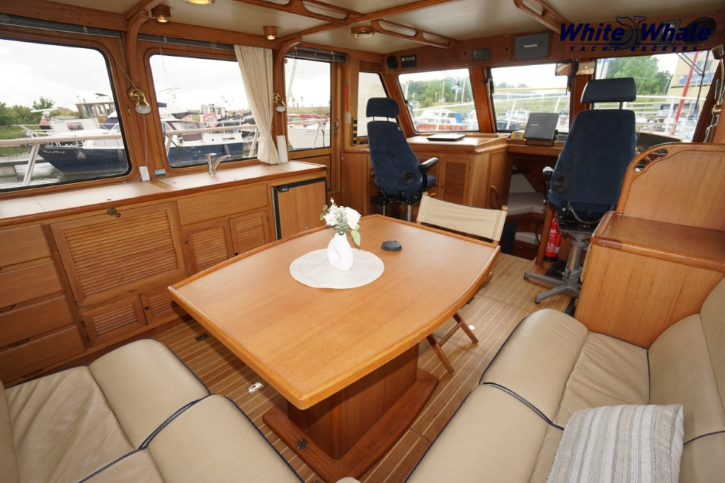 Wanneer u aan boord stapt, ervaart u direct de royale leefruimte en het gevoel van kwaliteit. De ruime en lichte salon heeft een panoramisch zicht op de omgeving en een aangename sfeer. Alles is fraai afgewerkt met hoogwaardige materialen en biedt een comfortabele zithoek en een praktische stuurstand.