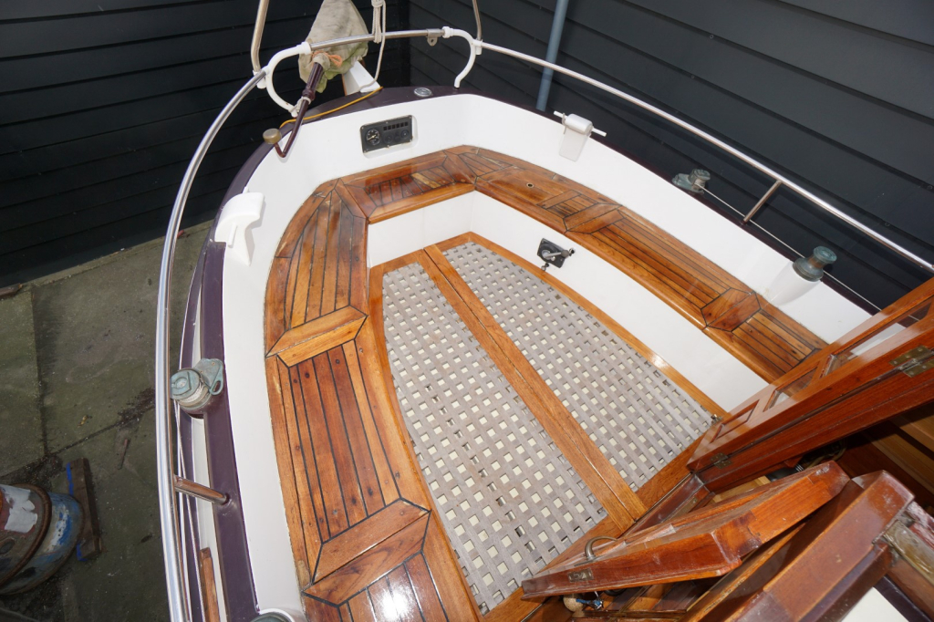 Binnen treft u een warme en verzorgde inrichting met essenhouten betimmering, een compact maar praktisch kombuis, een ruime salon met een gezellige zithoek die tevens kan dienen als slaapplaats voor 2 personen. In de voorpiek is een tweepersoonsbed te vinden en nog een extra eenpersoonsbed waarmee het totale aantal slaapplaatsen op 5 komt. Er voldoende bergruimte voor een langer verblijf aan boord en een afsluitbare toiletruimte maakt het comfort compleet.
