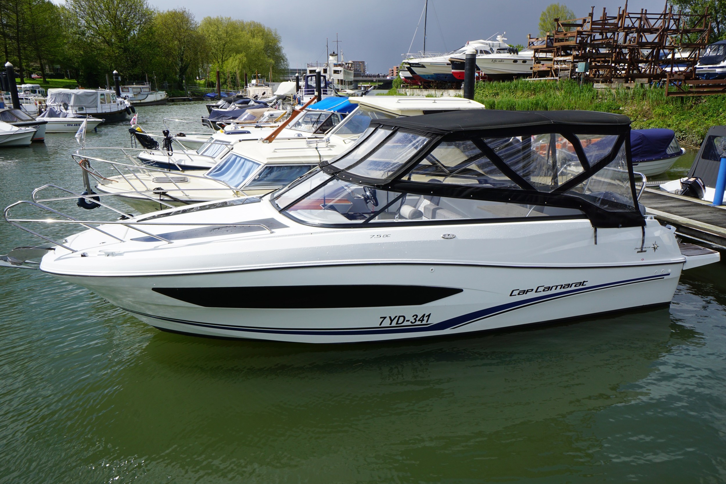 Jeanneau Cap Camarat 7.5DC serie 2. Volledig vaarklaar in Maart 2024 voorzien van nieuwe antifouling. Voorzien van een sterke en stille Yamaha F250 outboard motor, boegschroef, mooie (met stahoogte) kuiptent, koelkast, elektrisch toilet, elektrische ankerlier en ga zo maar door.