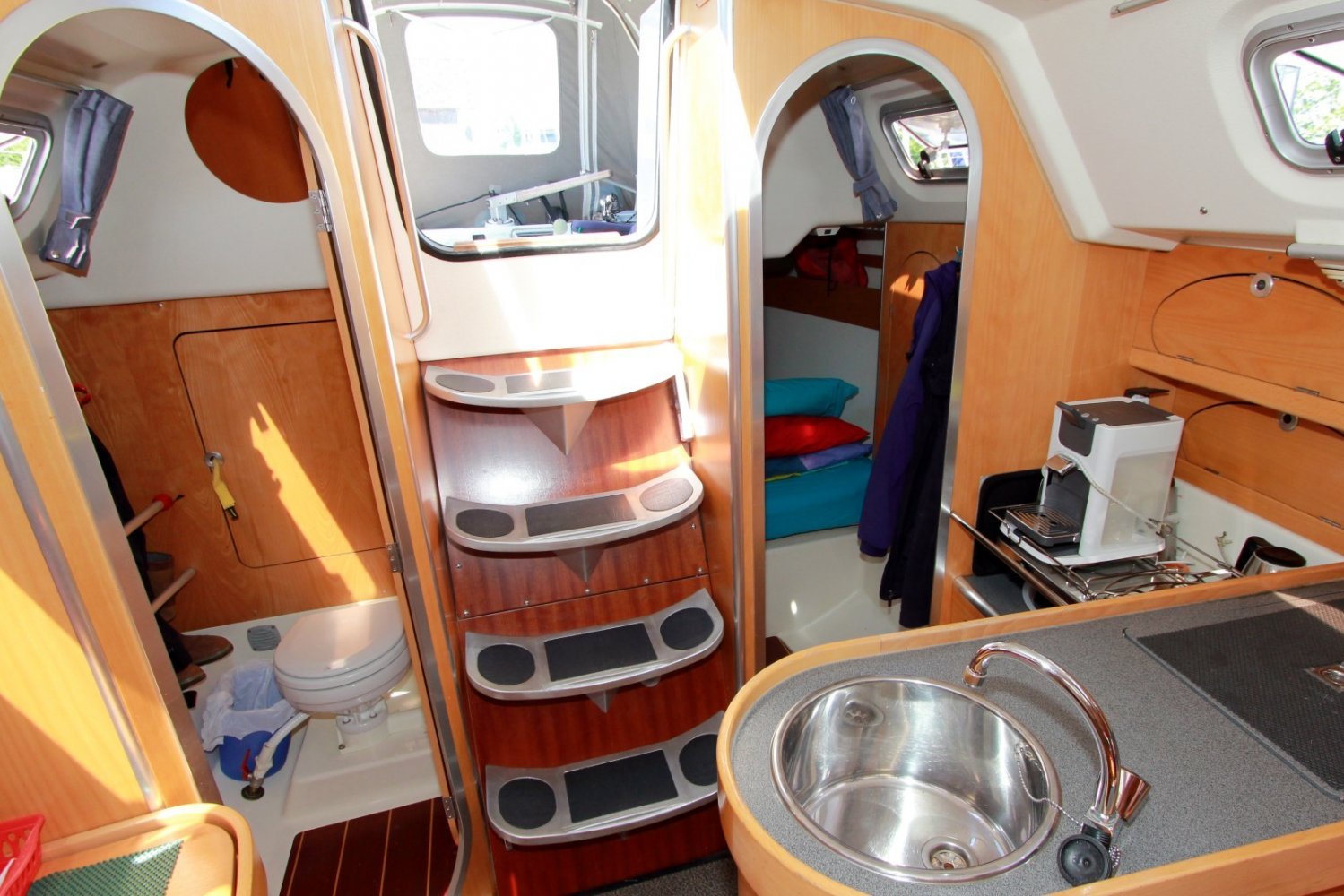 giek met drie reeflijnen, trimbare hekstag. alle vallen zijn vanuit de kuip bedienbaar