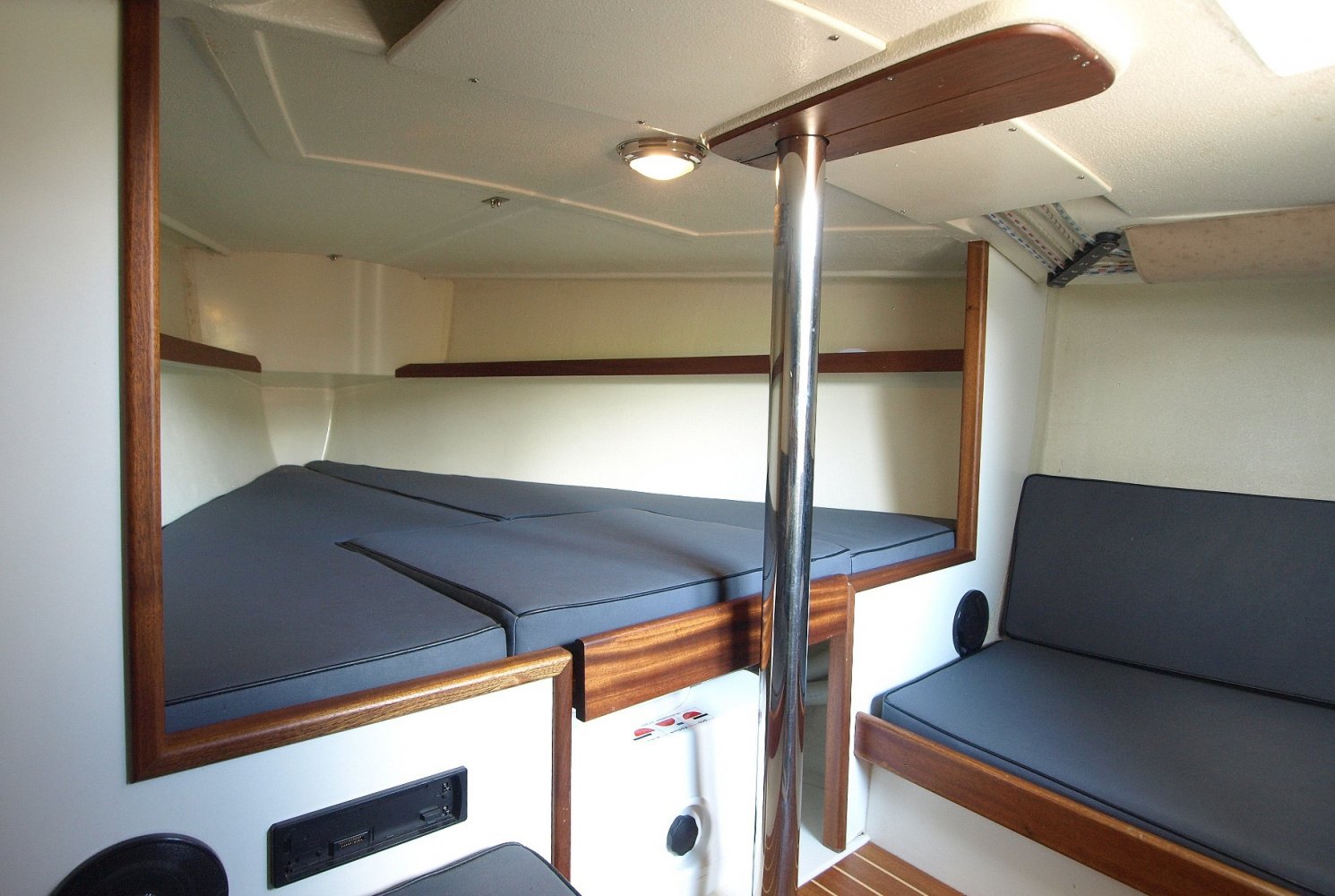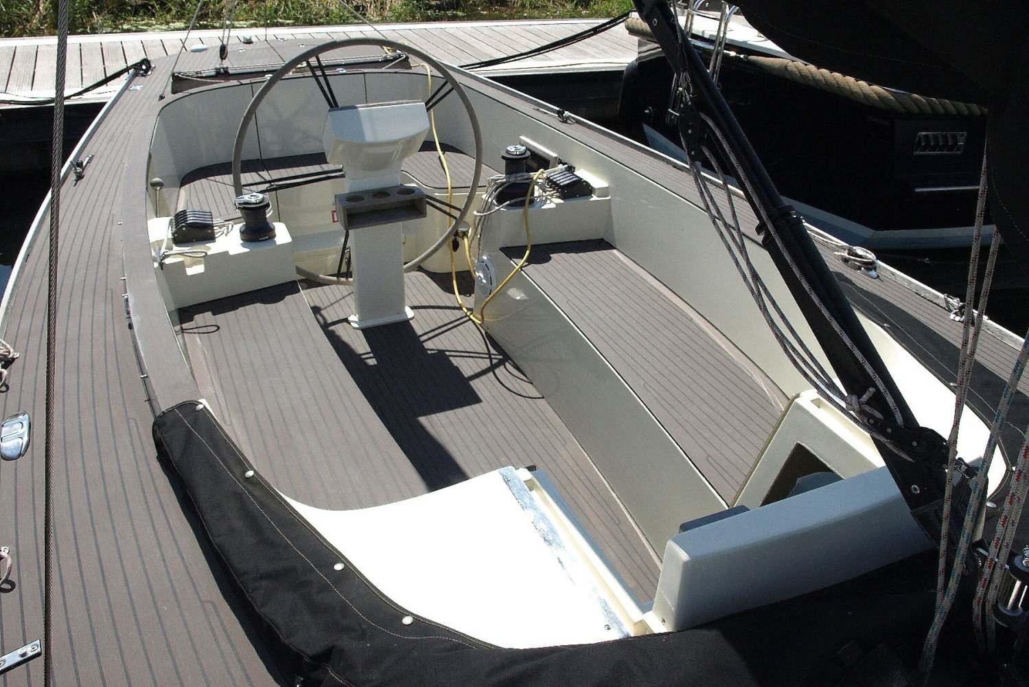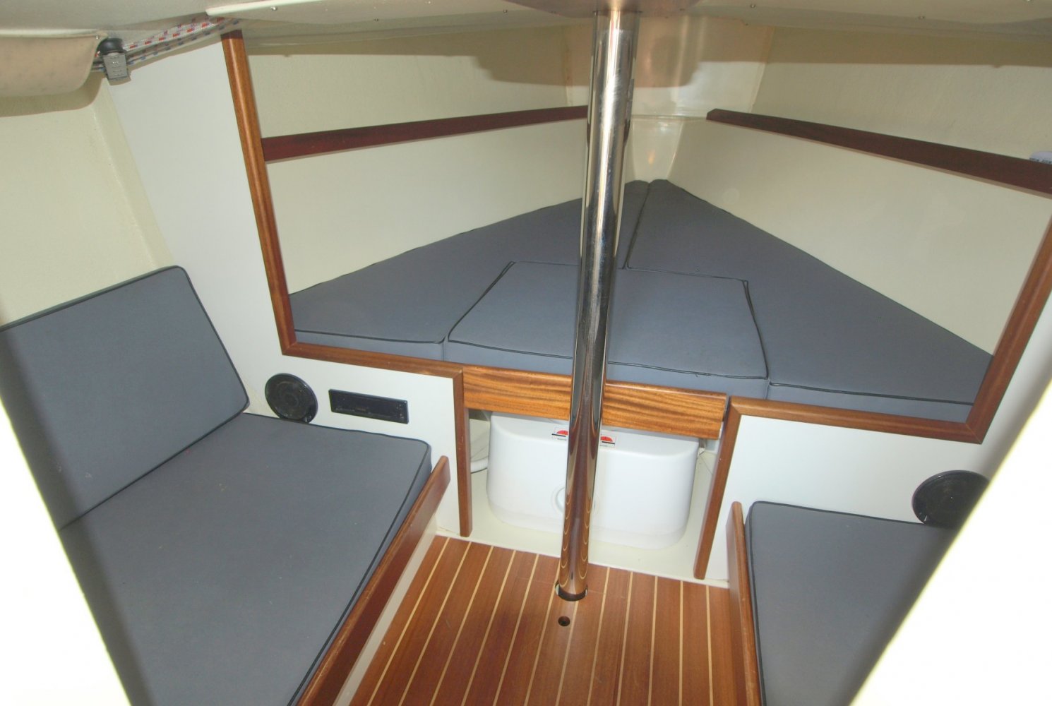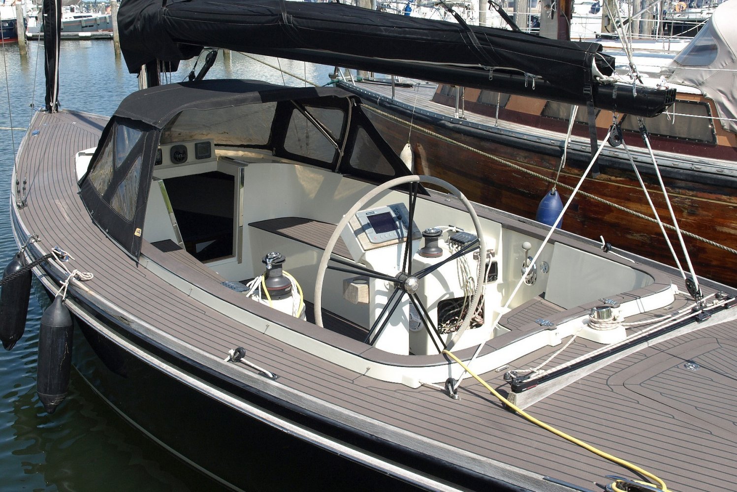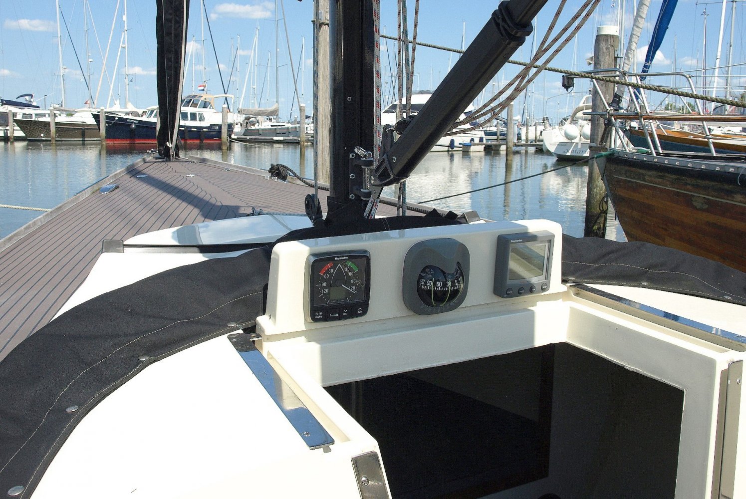 Erg fraaie en compleet uitgeruste Saffier Se 26, vaarklaar voor een nieuwe eigenaar. Als u het schip ziet liggen valt de voor Saffier zo kenmerkende combinatie van klassiek en modern design meteen op. Ook typisch voor Saffier is de hoogwaardige afwerking van de schepen en de slimme oplossingen zoals de onderdeks lopende lijnen een een fraai afgwerkte boegspriet voor de gennaker.   Deze Saffier in het bijzonder is daarbij erg compleet uitgerust met onder andere een stuurstand met een geinteregreerde kaartplotter en onderdeks stuurautomaat en een elektrische vallier. Verder is er een buiskap (welke overigens erg fraai weg te klappen is) met een aanritsbare kuiptent en er is voorzien in comfortabele kuipkussens. De fraaie kleurstelling in combinatie met de esthec dek afwerking maakt het plaatje helemaal af.   Binnen in het schip is voor het type schip nog opvallend veel ruimte en er is zelf aan een onderwatertoilet gedacht. In de voorpiek is een tweepersoonsbed en onder elke kuipbank is ook nog een enkel bed te vinden.   Zoals bij elke Saffier zijn de zeileigenschappen boven elke twijfel verheven en in dit geval is het schip ook nog eens voorzien van een gennaker voor net dat beetje extra snelheid op de ruimere rakken. En mocht er eens geen wind staan,  of al was het maar om de haven uit te komen, de rustig lopende Yanmar diesel motor is een betrouwbaar bemanningslid waar u altijd op kunt rekenen. Kortom deze Saffier 26 is een erg fraai schip gericht op de verwende zeiler die een bovengemiddeld goed gebouwd schip zoekt met een indrukwekkende uitstraling. Op zoek naar een chique daysailer? Neem dan zeker contact op om een afspraak te maken voor een bezichtiging! We zijn te bereiken op +31 168 820 208 of [email protected]