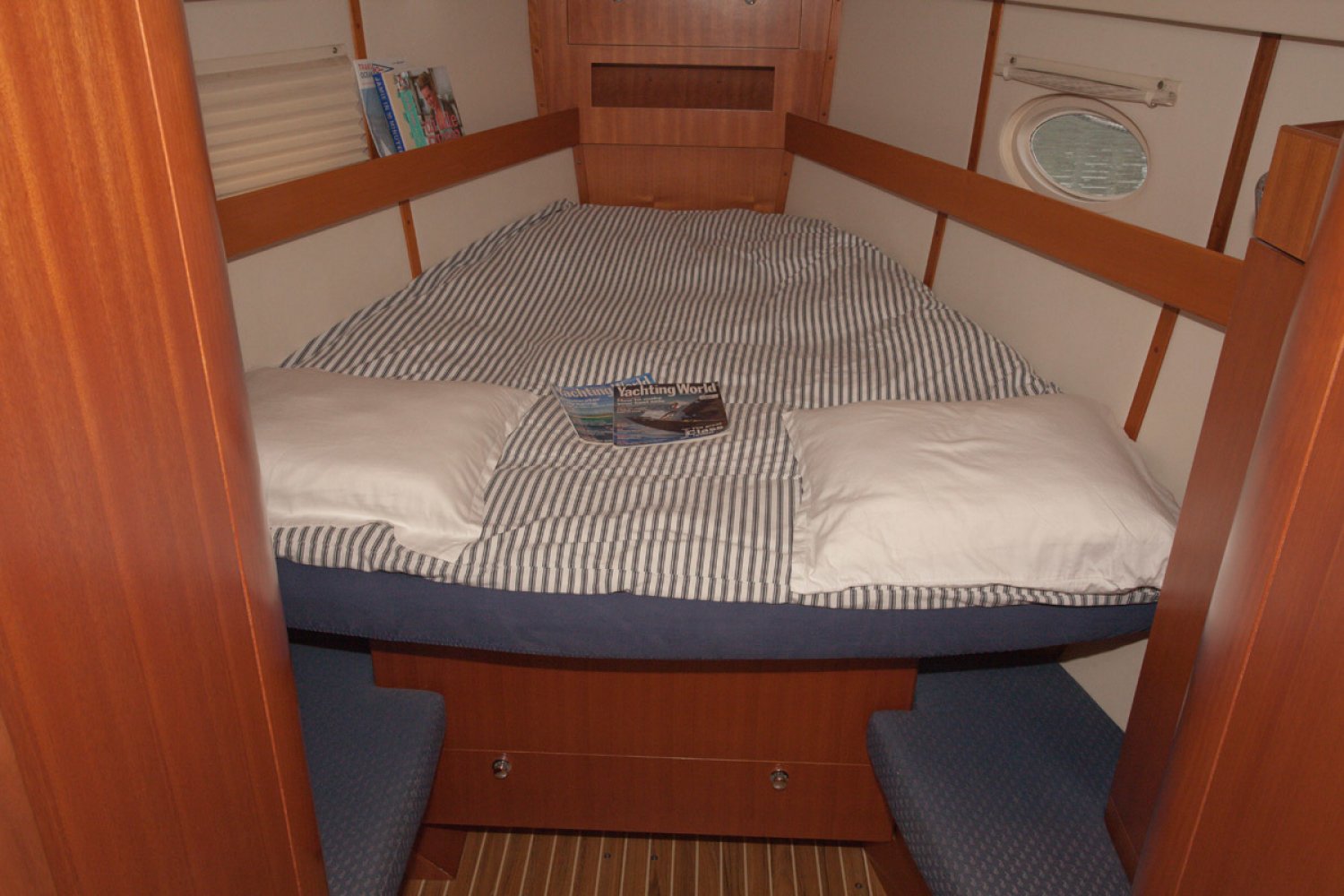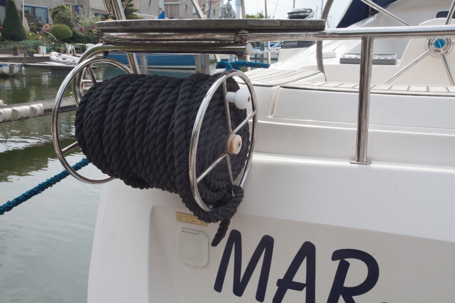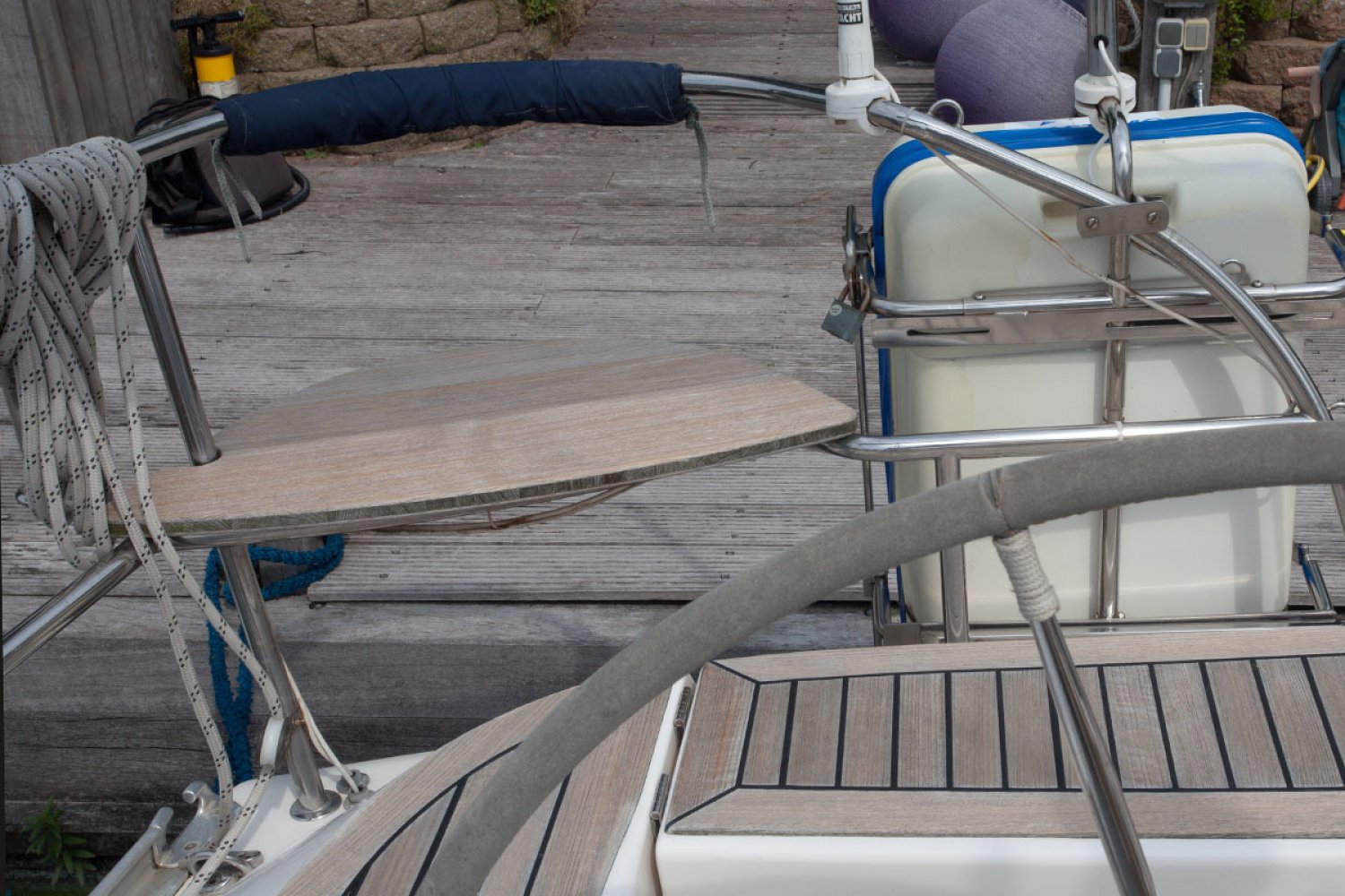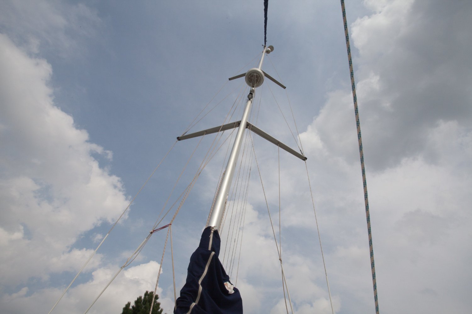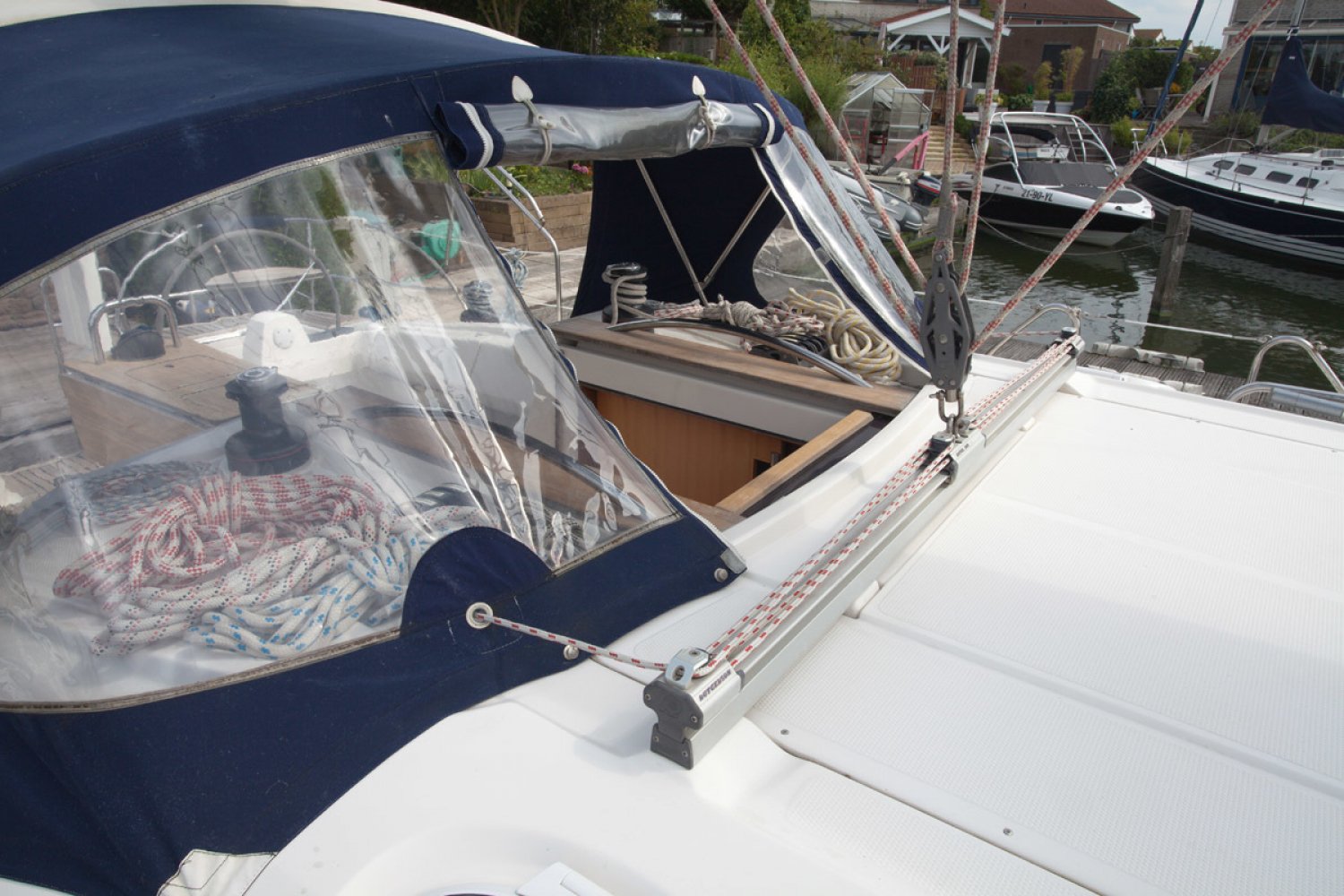 Seldén giekneerhouder en achterstagspanner, reven mogelijk vanuit de kuip, spinnakerboom, Genuahoes