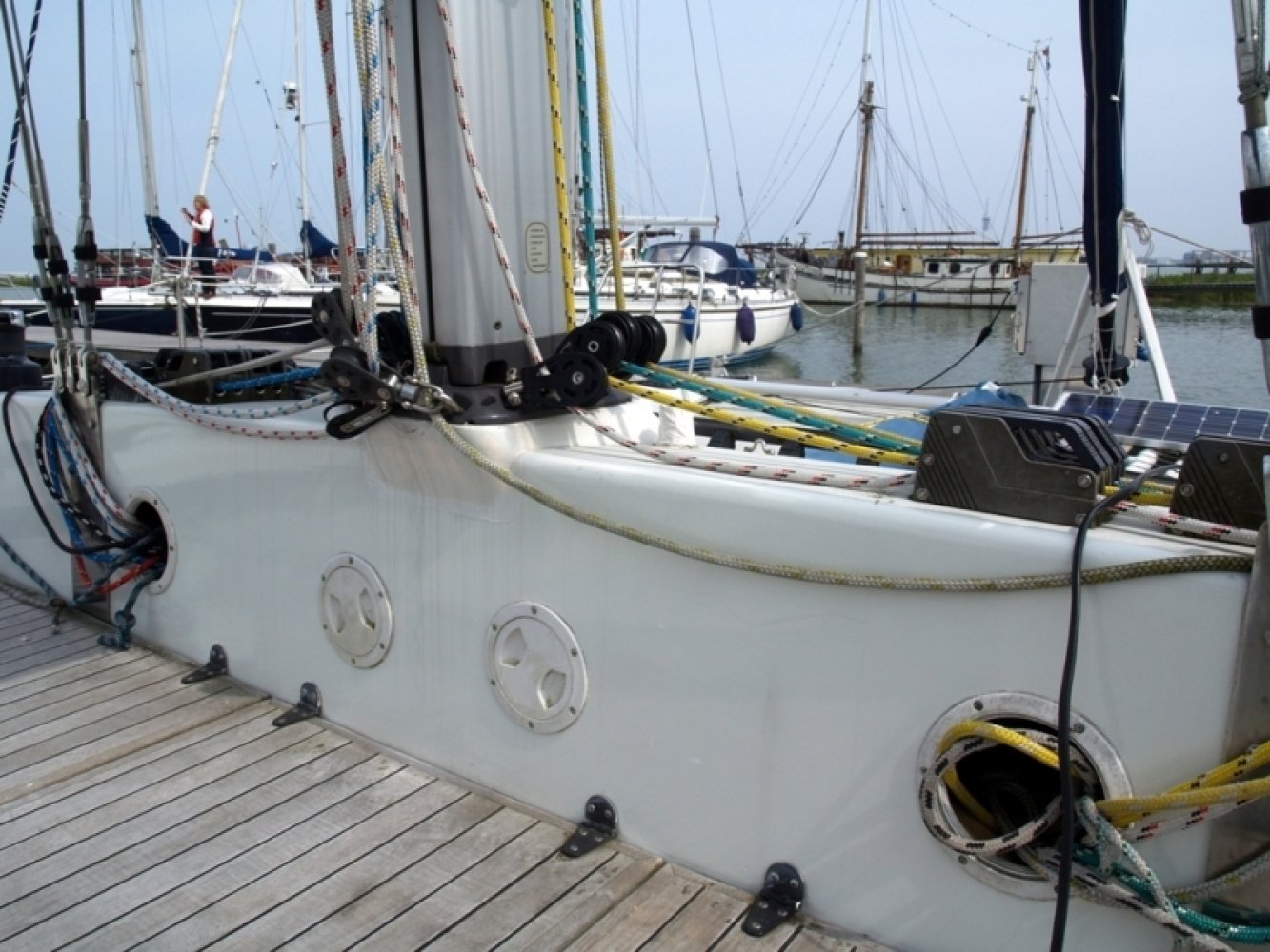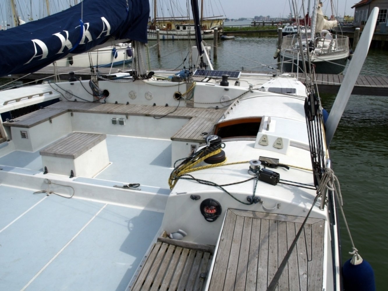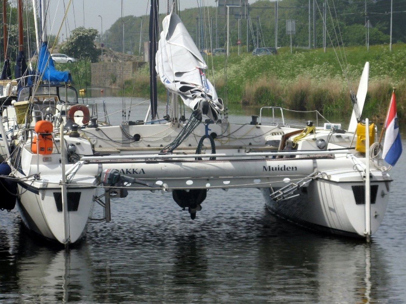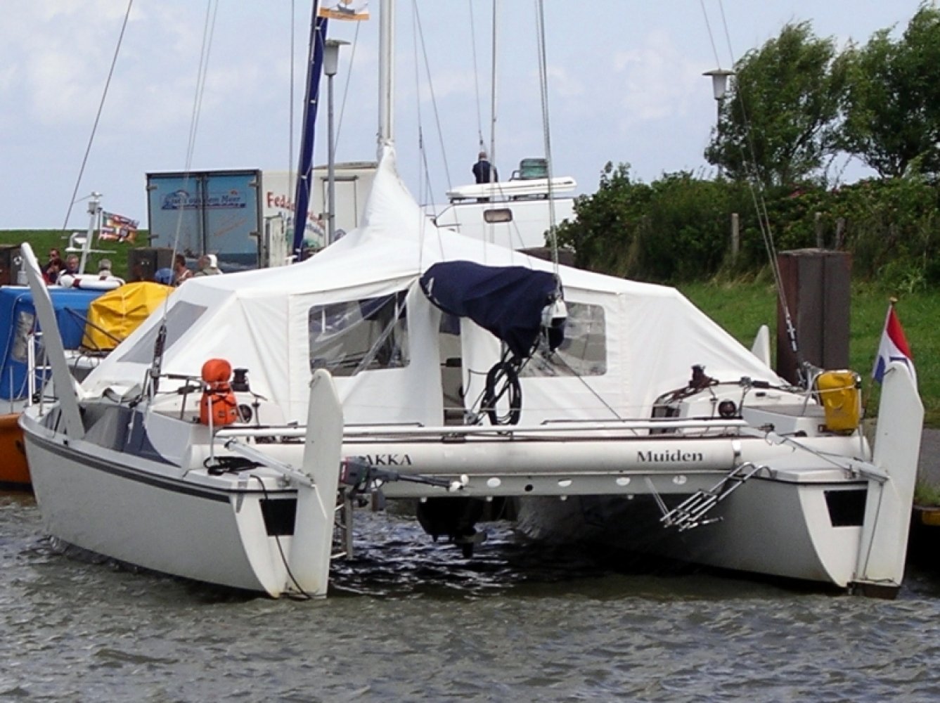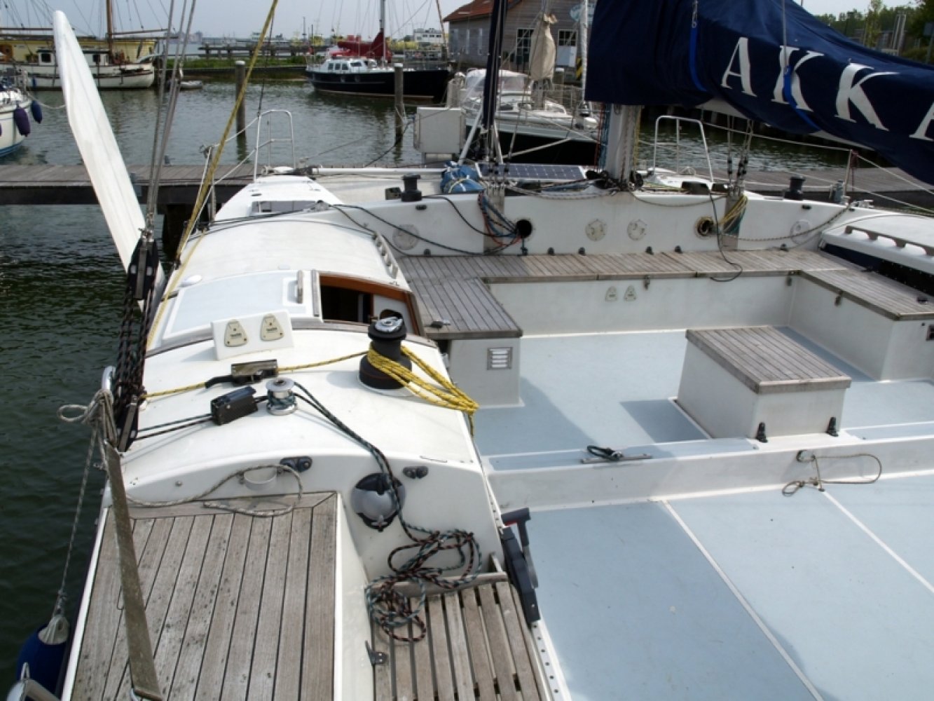 Deze door Lars Oudrup ontworpen Havkat 31 is bij Rhebergen in Amsterdam gebouwd als demo en de boot die wij u aanbieden is dus bouwnummer “1”. De gehele boot is gemaakt van sandwich polyester met schuim. Ondanks haar leeftijd verkeert ze in prima staat, zeker ook omdat de eigenaar kosten noch moeite heeft gespaard om haar in vorm te houden. Zo is de tuigage in 2007 geheel vernieuwd en is er een uitgebreide zeilgardarobe van kwaliteitszeilen. De 31 Havkat heeft een hoge fractionele tuigage met bak en checkstagen. Ze is bedoeld om te varen met grootzeil en zelfkerende fok maar er is ook een normale genua. Zij is heel gemakkelijk te hanteren door slechts 2 ervaren zeilers. Er is een asymmetrische spinnaker en er zijn twee grotere symmetrische spinnakers. De laatste twee worden gevaren op een normale spinnakerboom, voor de eerste is er een carbon telescopische boom die ingenieus onder de trampoline inschuift. De, zo goed als nieuwe, motor is midden tussen de drijvers in een motorkist geplaatst. De motor start elektrisch en levert meer dan genoeg vermogen om ook met veel wind goed vooruit te komen en te manoeuvreren. Het belangrijkste kenmerk van de Havkat 31 is haar grote center cockpit, en deze kan ook nog eens grotendeels worden overdekt met een tent waardoor er erg veel leefruimte ontstaat. Bij normale Havkat’s bestaat het achterste gedeelte uit trampoline, maar bij deze boot is hier een harde vloer zodat er erg veel leefruimte is. De accommodatie in de rompen bestaat uit een dubbel bed bakboord achter, en twee enkelle bedden in de stuurboord romp. In de bakboord romp zijn de navigatiehoek en de badkamer. Het toilet is zelfs voorzien van een vuilwatertank. De kombuis is midden in de stuurboord romp. De Havkat 31 is een snelle cruiser catamaran voor de ervaren zeiler. Onder catamaran zeilers is de Havkat al een begrip. Ook voor ervaren monohull zeilers is deze boot interessant, al zal men zich wel moeten verdiepen in het varen met dit soort boten. Deze moeite wordt zeker beloond want het varen met de Havkat is een ware sensatie, elke keer weer! Heeft u nog vragen, of wilt u een afspraak maken, neem dan zeker contact met ons op. Uw jachtmakelaar is Robert de Vries, tel. 06-50201336.