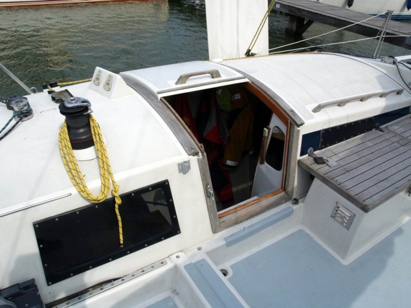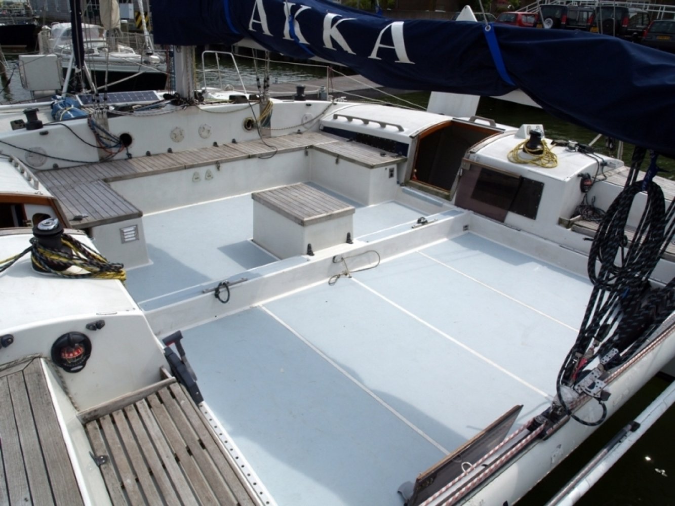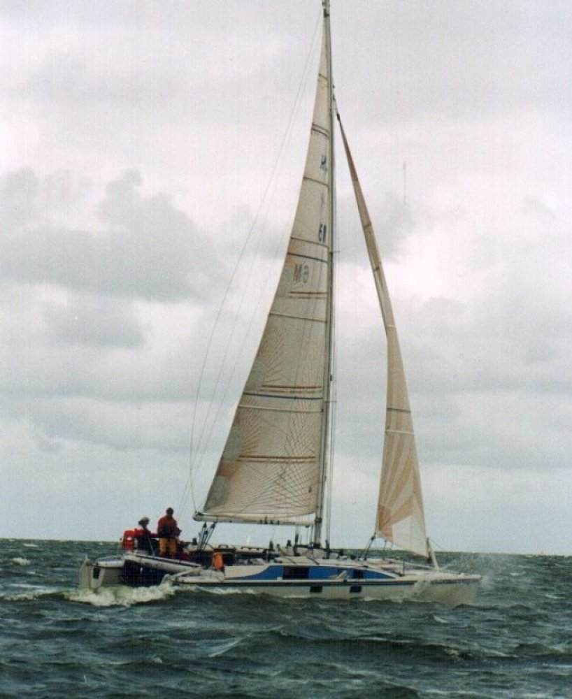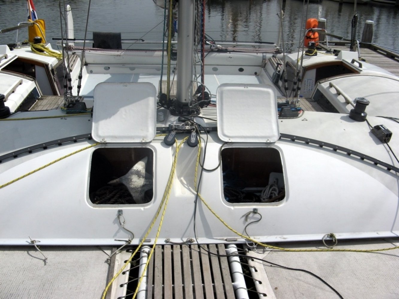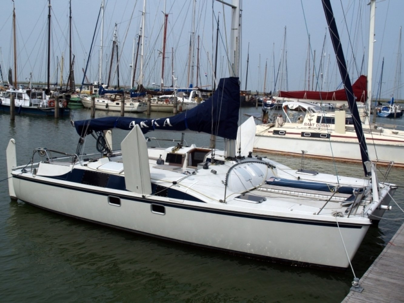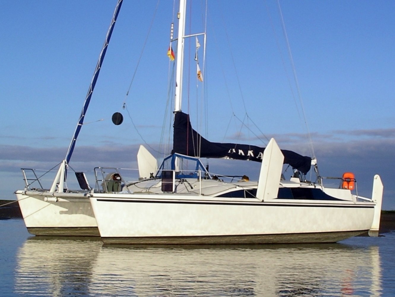 Deze door Lars Oudrup ontworpen Havkat 31 is bij Rhebergen in Amsterdam gebouwd als demo en de boot die wij u aanbieden is dus bouwnummer “1”. De gehele boot is gemaakt van sandwich polyester met schuim. Ondanks haar leeftijd verkeert ze in prima staat, zeker ook omdat de eigenaar kosten noch moeite heeft gespaard om haar in vorm te houden. Zo is de tuigage in 2007 geheel vernieuwd en is er een uitgebreide zeilgardarobe van kwaliteitszeilen. De 31 Havkat heeft een hoge fractionele tuigage met bak en checkstagen. Ze is bedoeld om te varen met grootzeil en zelfkerende fok maar er is ook een normale genua. Zij is heel gemakkelijk te hanteren door slechts 2 ervaren zeilers. Er is een asymmetrische spinnaker en er zijn twee grotere symmetrische spinnakers. De laatste twee worden gevaren op een normale spinnakerboom, voor de eerste is er een carbon telescopische boom die ingenieus onder de trampoline inschuift. De, zo goed als nieuwe, motor is midden tussen de drijvers in een motorkist geplaatst. De motor start elektrisch en levert meer dan genoeg vermogen om ook met veel wind goed vooruit te komen en te manoeuvreren. Het belangrijkste kenmerk van de Havkat 31 is haar grote center cockpit, en deze kan ook nog eens grotendeels worden overdekt met een tent waardoor er erg veel leefruimte ontstaat. Bij normale Havkat’s bestaat het achterste gedeelte uit trampoline, maar bij deze boot is hier een harde vloer zodat er erg veel leefruimte is. De accommodatie in de rompen bestaat uit een dubbel bed bakboord achter, en twee enkelle bedden in de stuurboord romp. In de bakboord romp zijn de navigatiehoek en de badkamer. Het toilet is zelfs voorzien van een vuilwatertank. De kombuis is midden in de stuurboord romp. De Havkat 31 is een snelle cruiser catamaran voor de ervaren zeiler. Onder catamaran zeilers is de Havkat al een begrip. Ook voor ervaren monohull zeilers is deze boot interessant, al zal men zich wel moeten verdiepen in het varen met dit soort boten. Deze moeite wordt zeker beloond want het varen met de Havkat is een ware sensatie, elke keer weer! Heeft u nog vragen, of wilt u een afspraak maken, neem dan zeker contact met ons op. Uw jachtmakelaar is Robert de Vries, tel. 06-50201336.