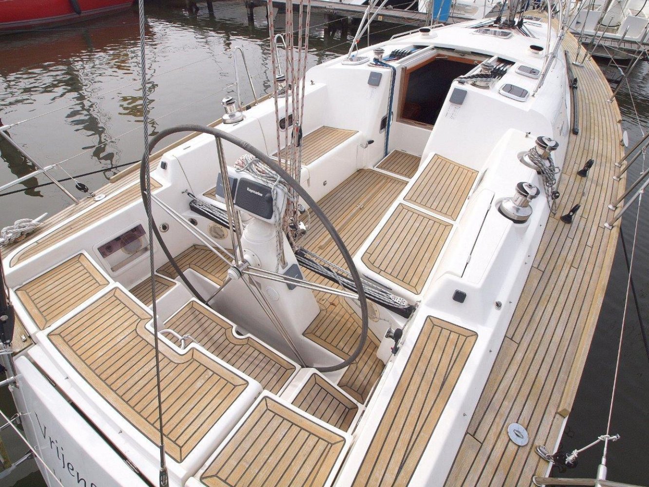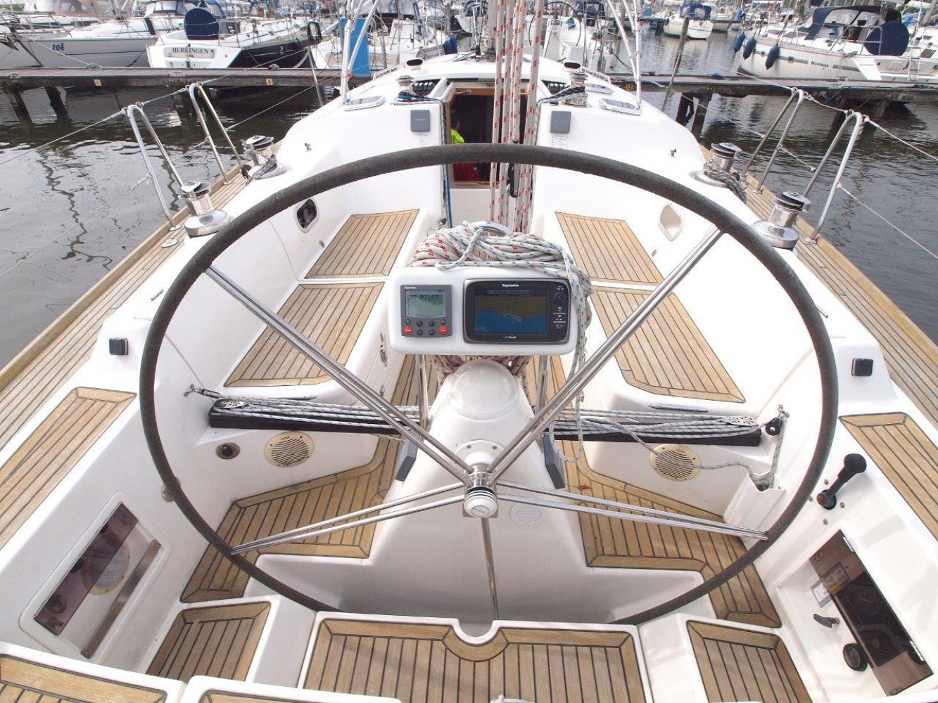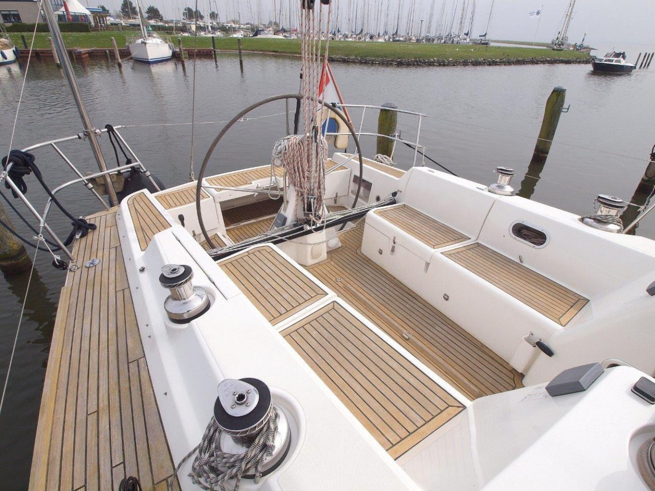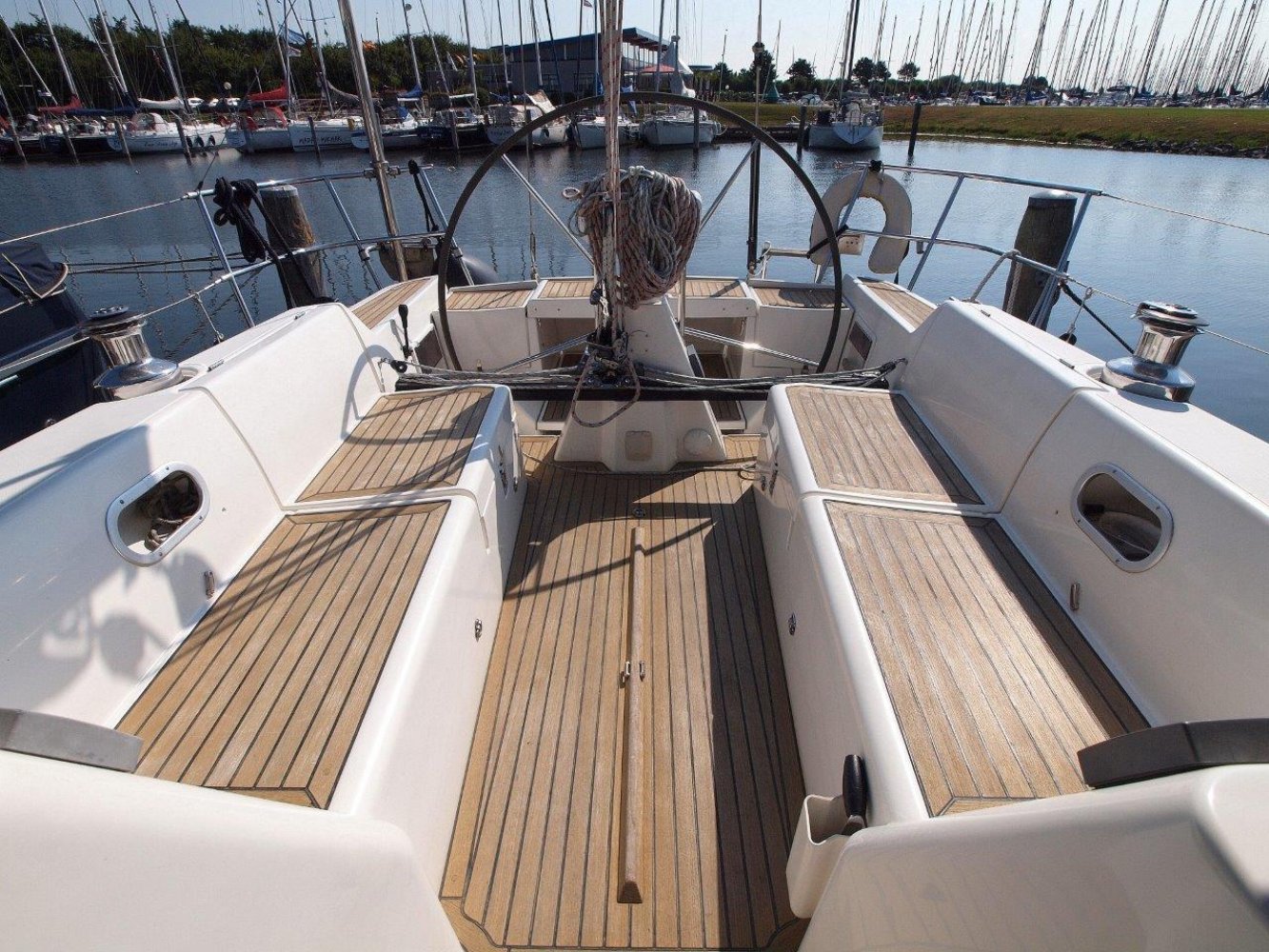 Zodra u aan boord stapt wordt meteen duidelijk dat dit een serieuze zeilboot is. Alles voelt degelijk en solide aan en de deklayout is doordacht. Het schip is gemakkelijk te varen vanuit de kuip en voor extra comfort is ze voorzien van elektrische lieren. De kuip is ruim met voldoende bewegingsvrijheid en vanachter de stuurstand heeft u een perfect overzicht op het schip en de omgeving. En over de stuurstand gesproken, het stuurwiel deze voelt lekker direct aan en ze is met twee vingers te varen.