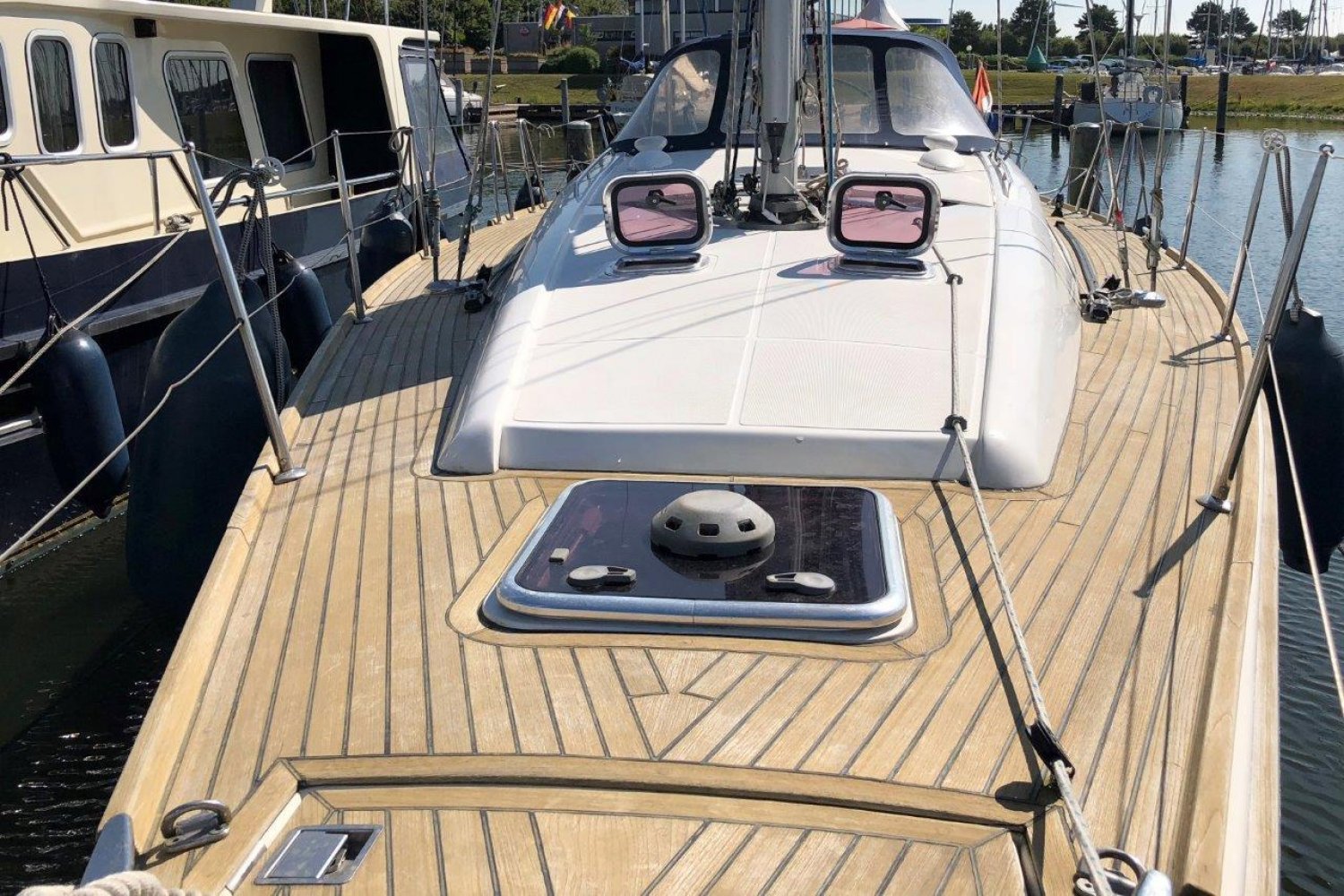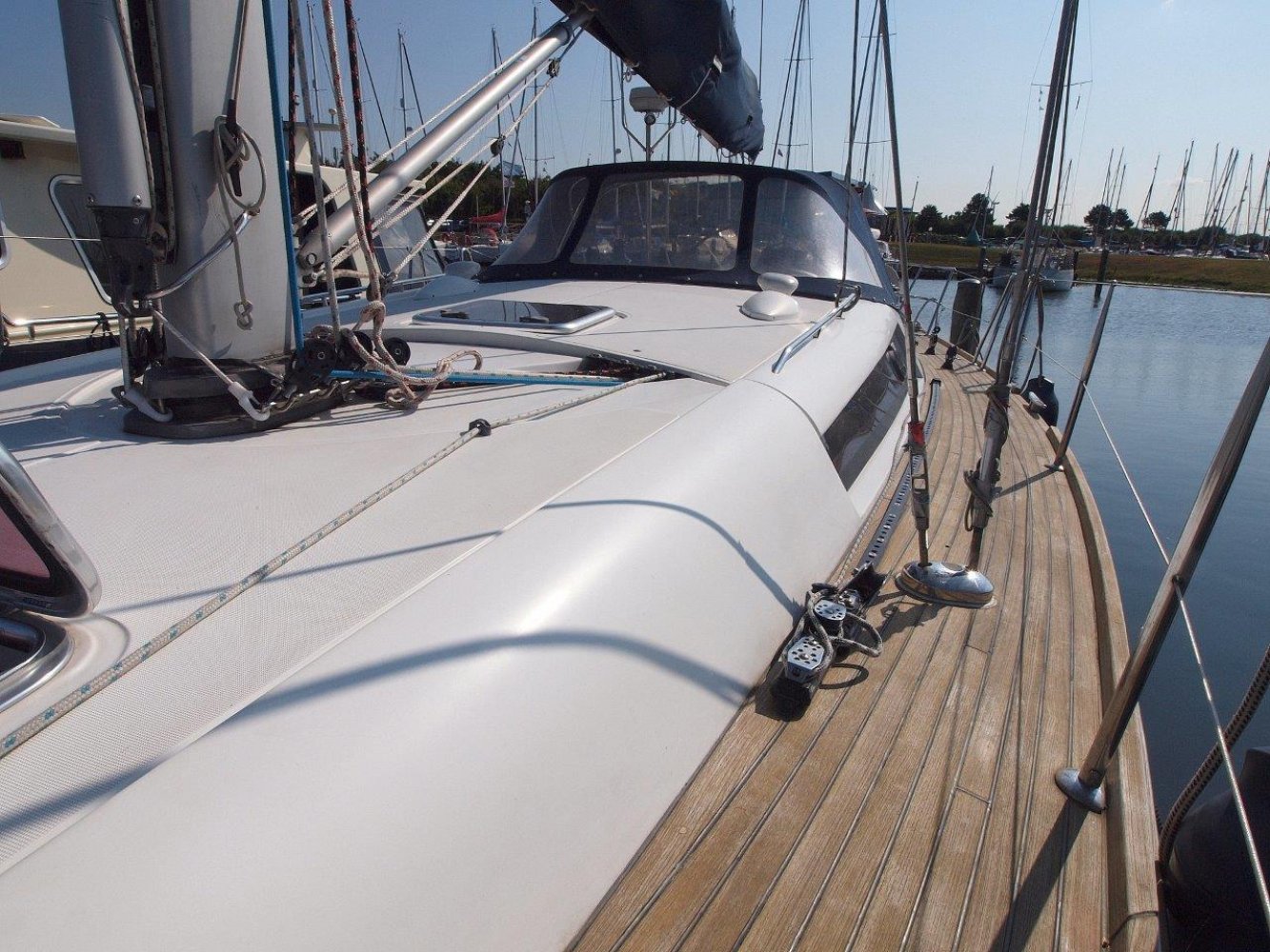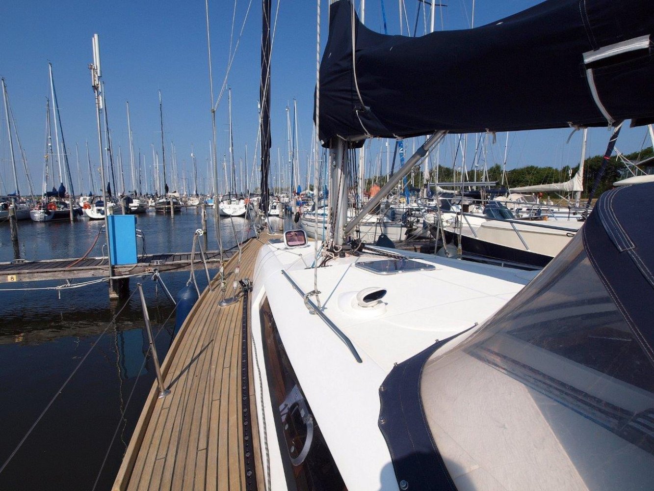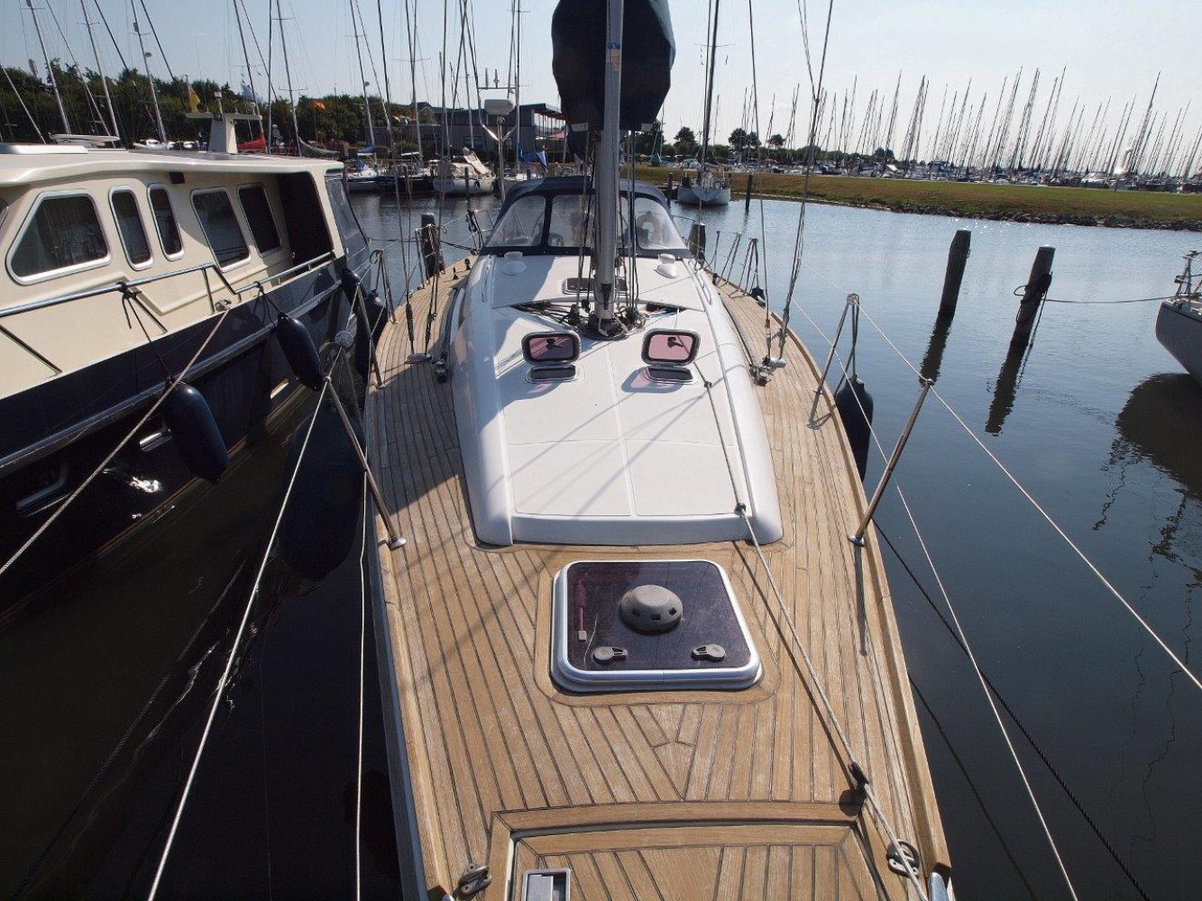 Zodra u aan boord stapt wordt meteen duidelijk dat dit een serieuze zeilboot is. Alles voelt degelijk en solide aan en de deklayout is doordacht. Het schip is gemakkelijk te varen vanuit de kuip en voor extra comfort is ze voorzien van elektrische lieren. De kuip is ruim met voldoende bewegingsvrijheid en vanachter de stuurstand heeft u een perfect overzicht op het schip en de omgeving. En over de stuurstand gesproken, het stuurwiel deze voelt lekker direct aan en ze is met twee vingers te varen.
