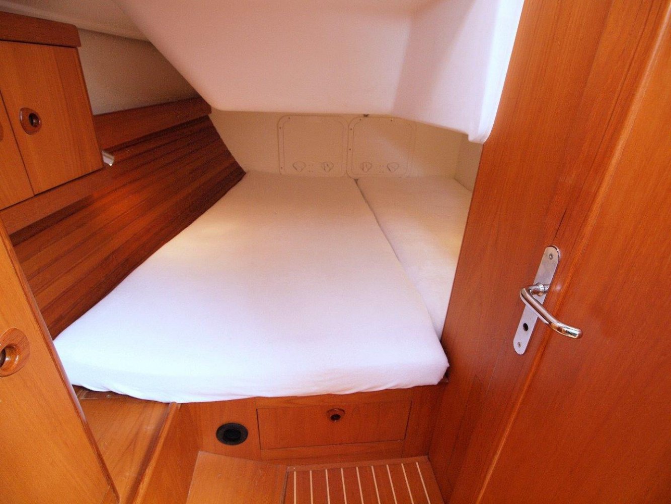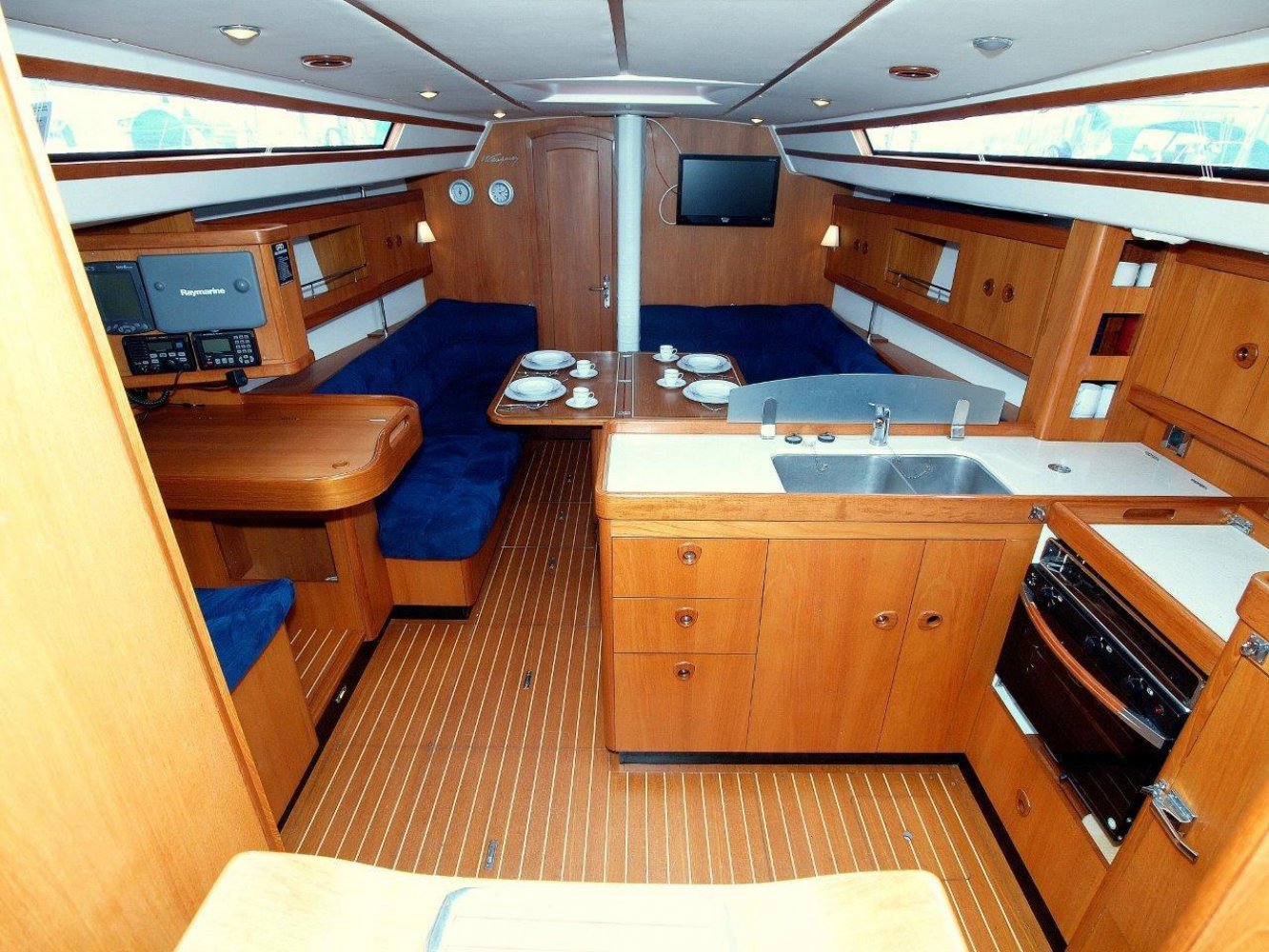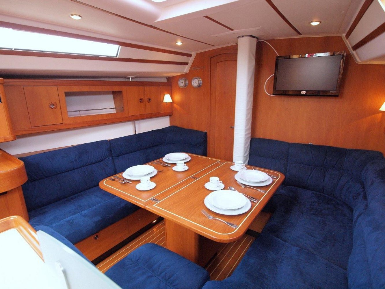 Daar tegenover, is aan stuurboord een ruim kombuis met uiteraard warm en koud stromend water, een gasfornuis met oven, compressorkoeling, etc. Kortom alles wat u mag verwachten op een dergelijk schip. Midscheeps is de ruime salon met aan beiden kanten comfortabele banken een een fraai afgewerkte tafel in het midden. In de voorpiek is de eerste van twee hutten. Deze is ruim en voorzien van de nodige opbergruimte. In het achterschip is aan stuurboord de tweede hut. Ook deze is voorzien van een tweepersoonbed en opbergruimte net als de voorhut. Aan bakboord in het achterschip is een enorme bakskist te vinden welke toeganklijk is vanuit de kuip.