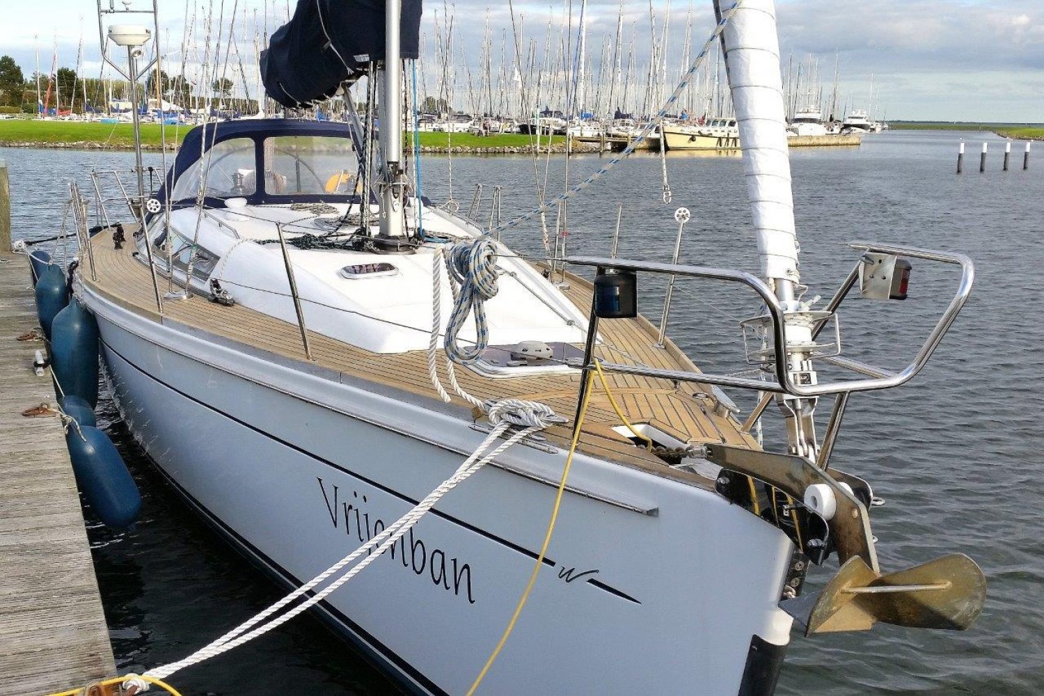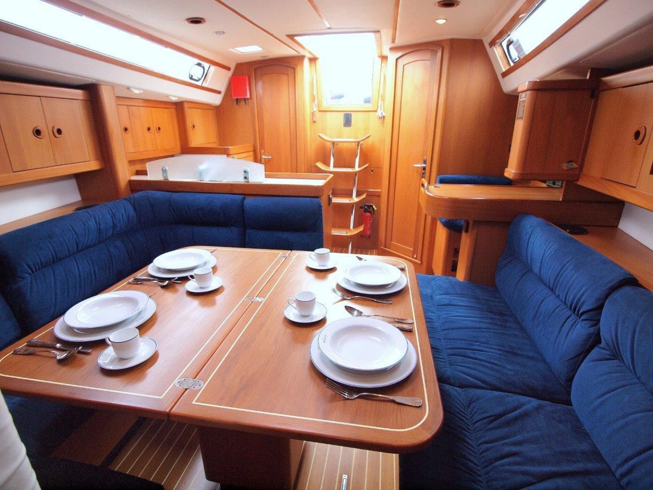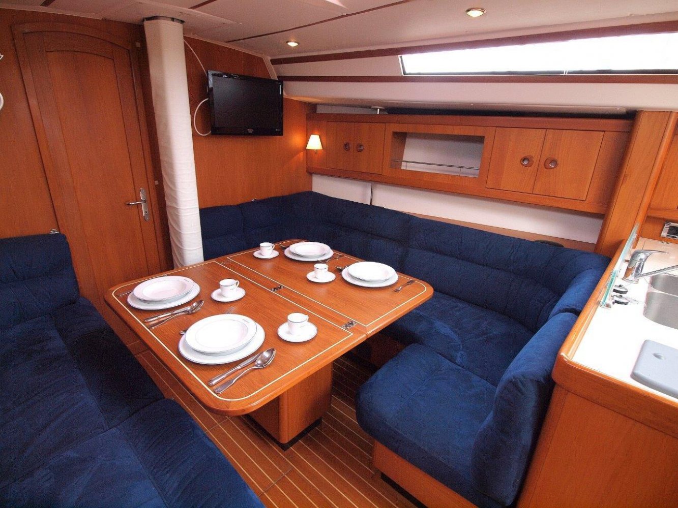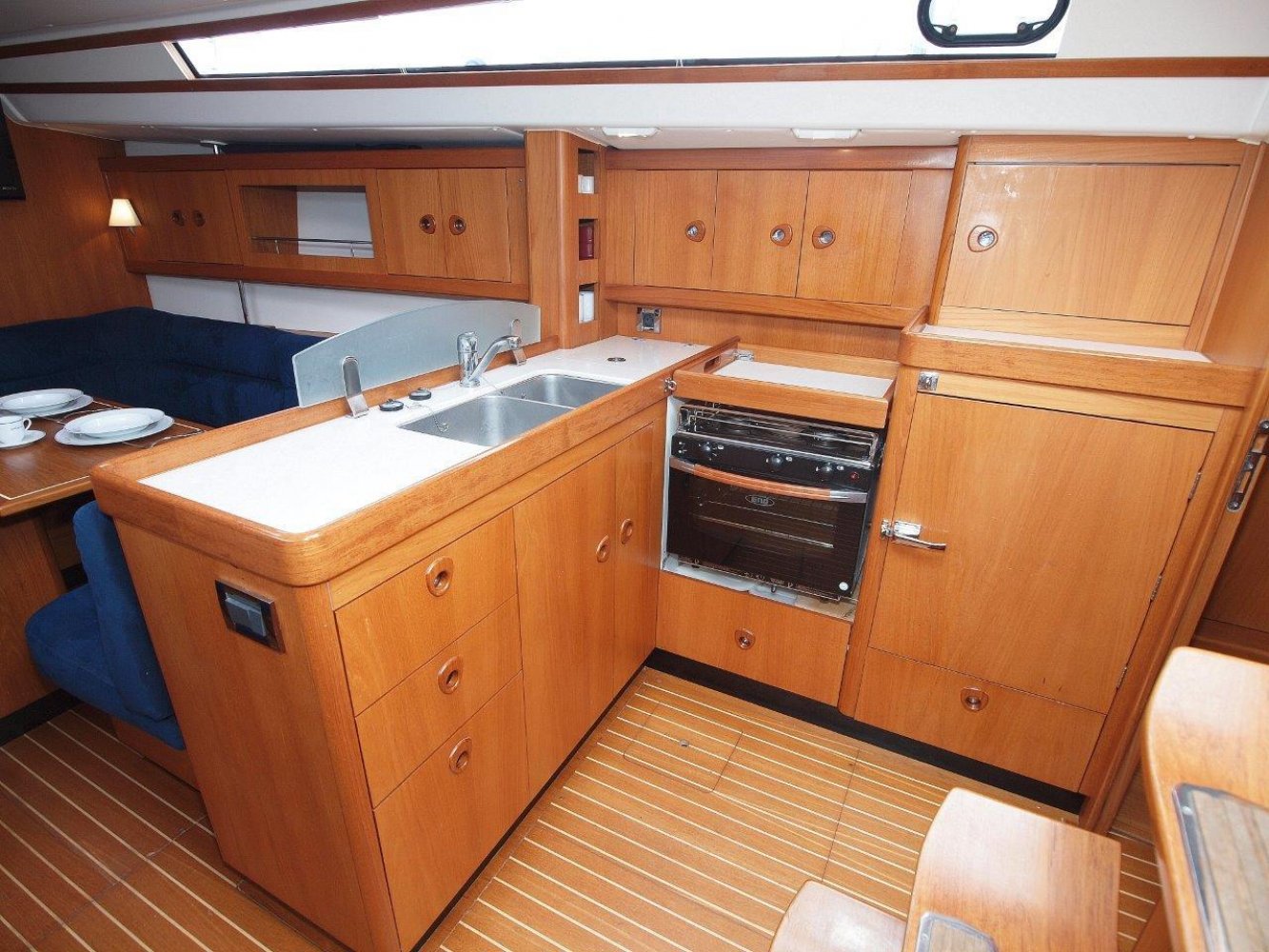Daar tegenover, is aan stuurboord een ruim kombuis met uiteraard warm en koud stromend water, een gasfornuis met oven, compressorkoeling, etc. Kortom alles wat u mag verwachten op een dergelijk schip. Midscheeps is de ruime salon met aan beiden kanten comfortabele banken een een fraai afgewerkte tafel in het midden. In de voorpiek is de eerste van twee hutten. Deze is ruim en voorzien van de nodige opbergruimte. In het achterschip is aan stuurboord de tweede hut. Ook deze is voorzien van een tweepersoonbed en opbergruimte net als de voorhut. Aan bakboord in het achterschip is een enorme bakskist te vinden welke toeganklijk is vanuit de kuip.