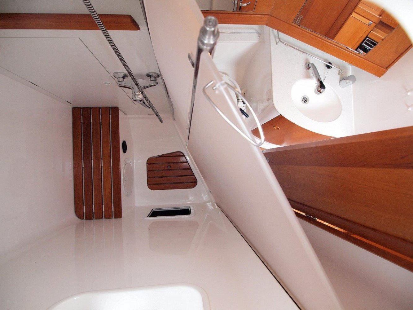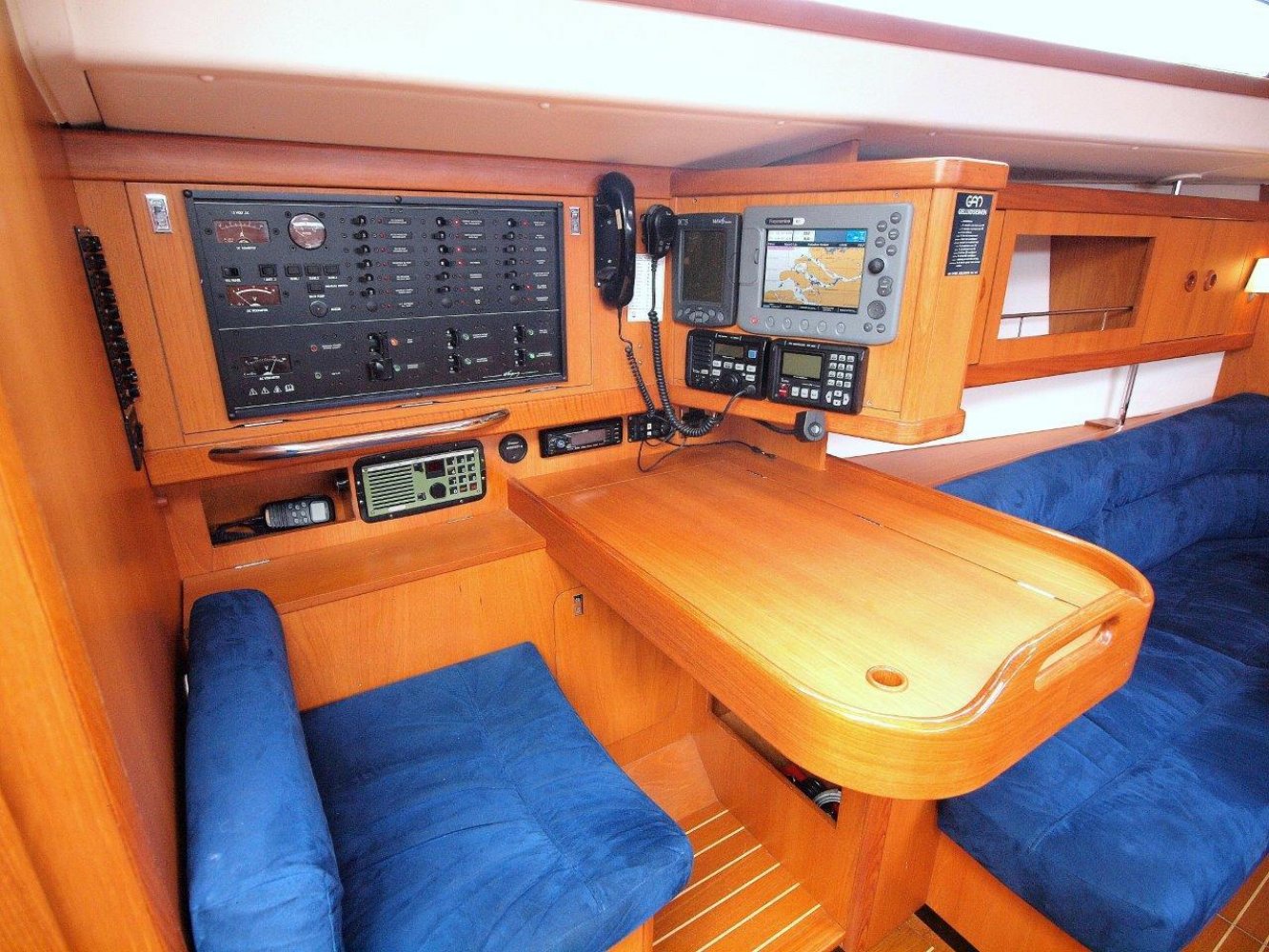 Binnen in het schip wordt u ontvangen in een warm en nautisch interieur. De afwerking is van een hoog niveau en de indeling doordacht. Bij binnenkomst treft u aan bakboord de toegang tot de natte cel aan. Deze is ruim opgezet en voorzien van een seperate doucheruimte. Aan die zelfde kant is ook de kaartentafel met de nodige apparatuur en het schakelpaneel van de boordsystemen.