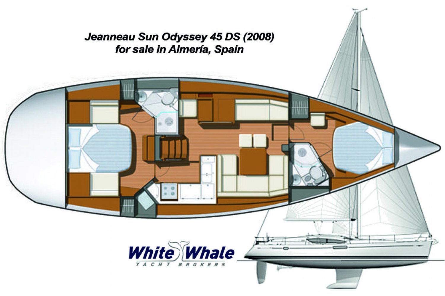 Hardly used Jeanneau Sun Odyssey 45 DS (2008) in good state of maintainance, equipped for ocean cruising. Located in Almería, Spain. Yanmar 4JH4 75Hp engine with only 340 engine hours. No charter, only 2 owners. This succesfull design by Jeanneau France features easy and comfortable sailing for a short-handed crew. Nice, modern and spacious inside due to 2 double-cabin version.