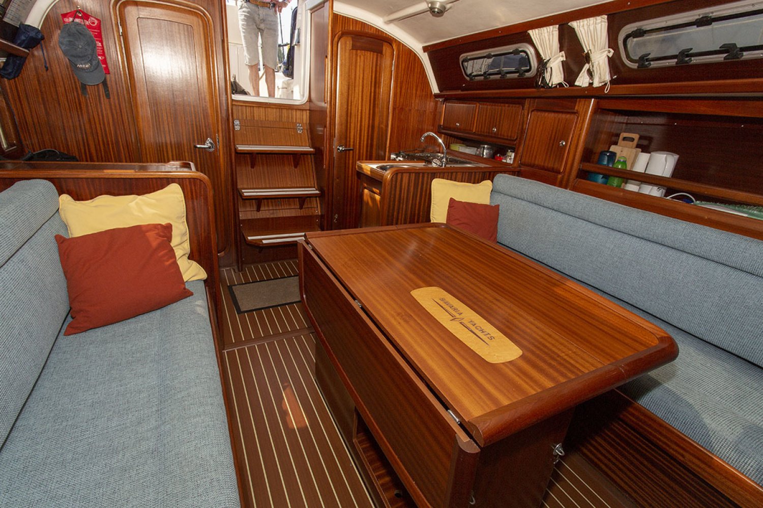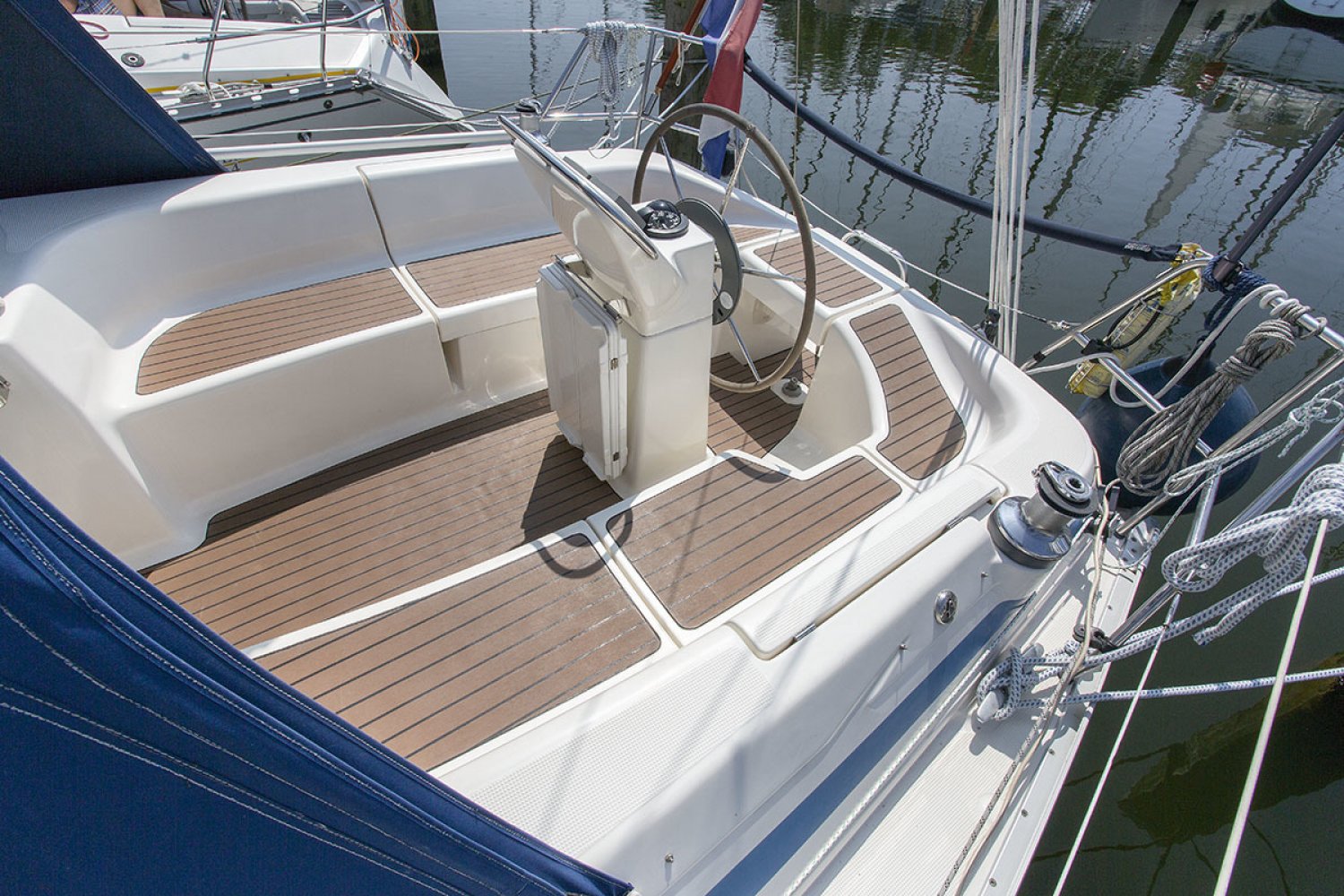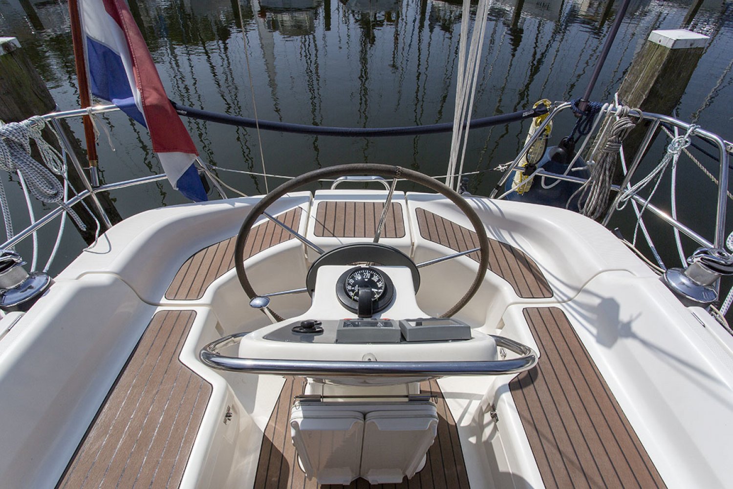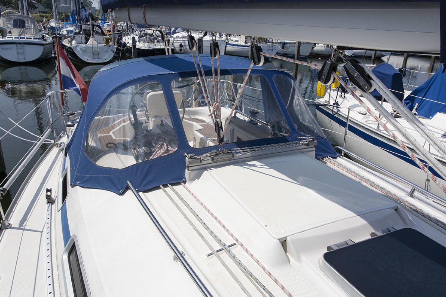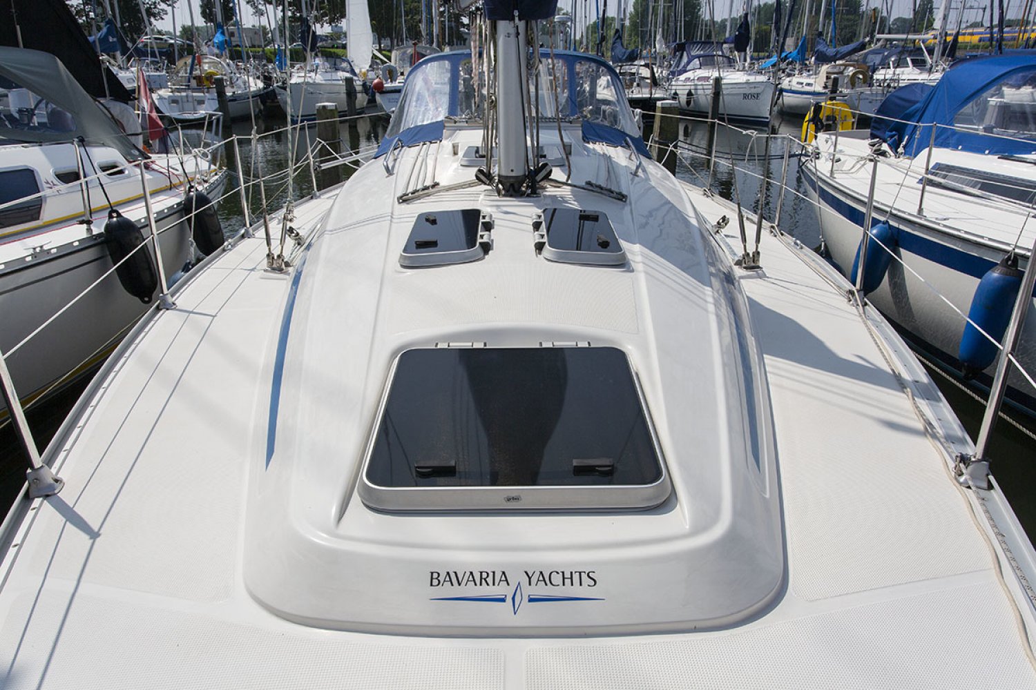 Deze Bavaria 34 in 2 cabine-indeling is een ideale familie cruiser. De boot is van eerste eigenaar en werd steeds professioneel onderhouden sinds tewaterlating in het voorjaar van 2000. De boot is  redelijk onderhouds arm onder andere omdat de kuip is voorzien van kunststof teak op de banken. Aan stuurboord treft u een diepe bakskist met daarin voldoende ruimte voor grote dingen zoals vouwfietsen. Aan bakboord is een ondieper bakskist. De boot is makkelijk te varen, en vanaf het roer heeft men goed overzicht en controle over de boot. Op de stuurstand zijn de navigatie-instrumenten en de autopilot bedieningspaneel.   Het interieur is ruim en praktisch ingericht met een uitstekende afwerking van het houtwerk en veel kastruimte. De kussens zijn recent vernieuwd.  De L-vormige keuken is ruim en modern ingericht en uitgerust met fornuis, oven, koelbox en gootsteen. Aan stuurboord is de kaartentafel met schakelbord en VHF radio. Er zijn vier vaste slaapplaatsen in twee dubbele hutten. De voorkajuit heeft een groot bed in V-vorm. Rechts van de kajuitingang is de toiletruimte met veel bergruimte, onder andere voor zeilkleding. De motorruimte is  goed bereikbaar via de scharnieren de trap.