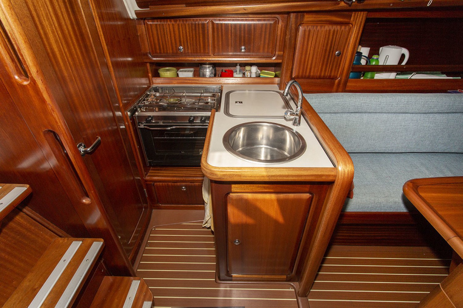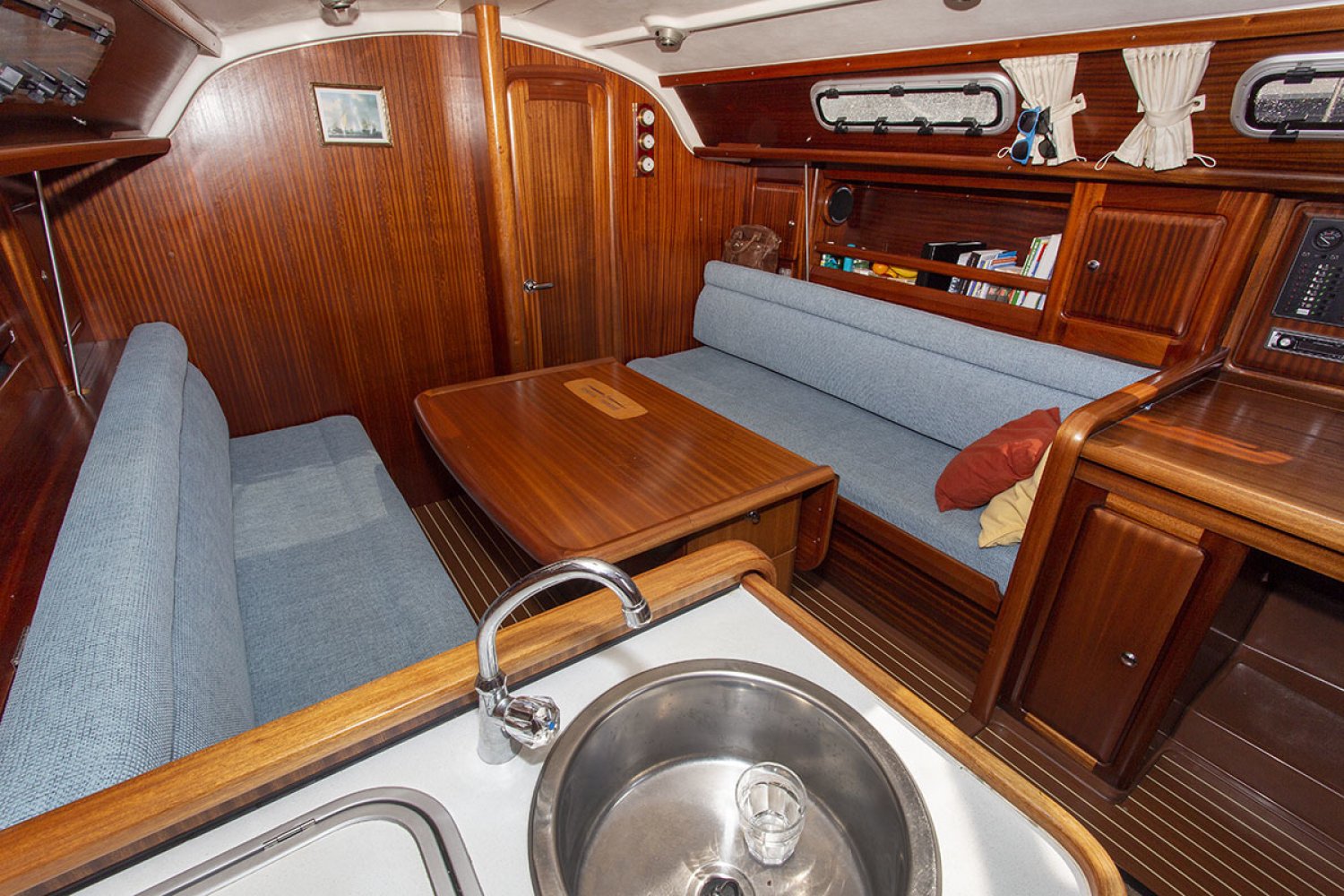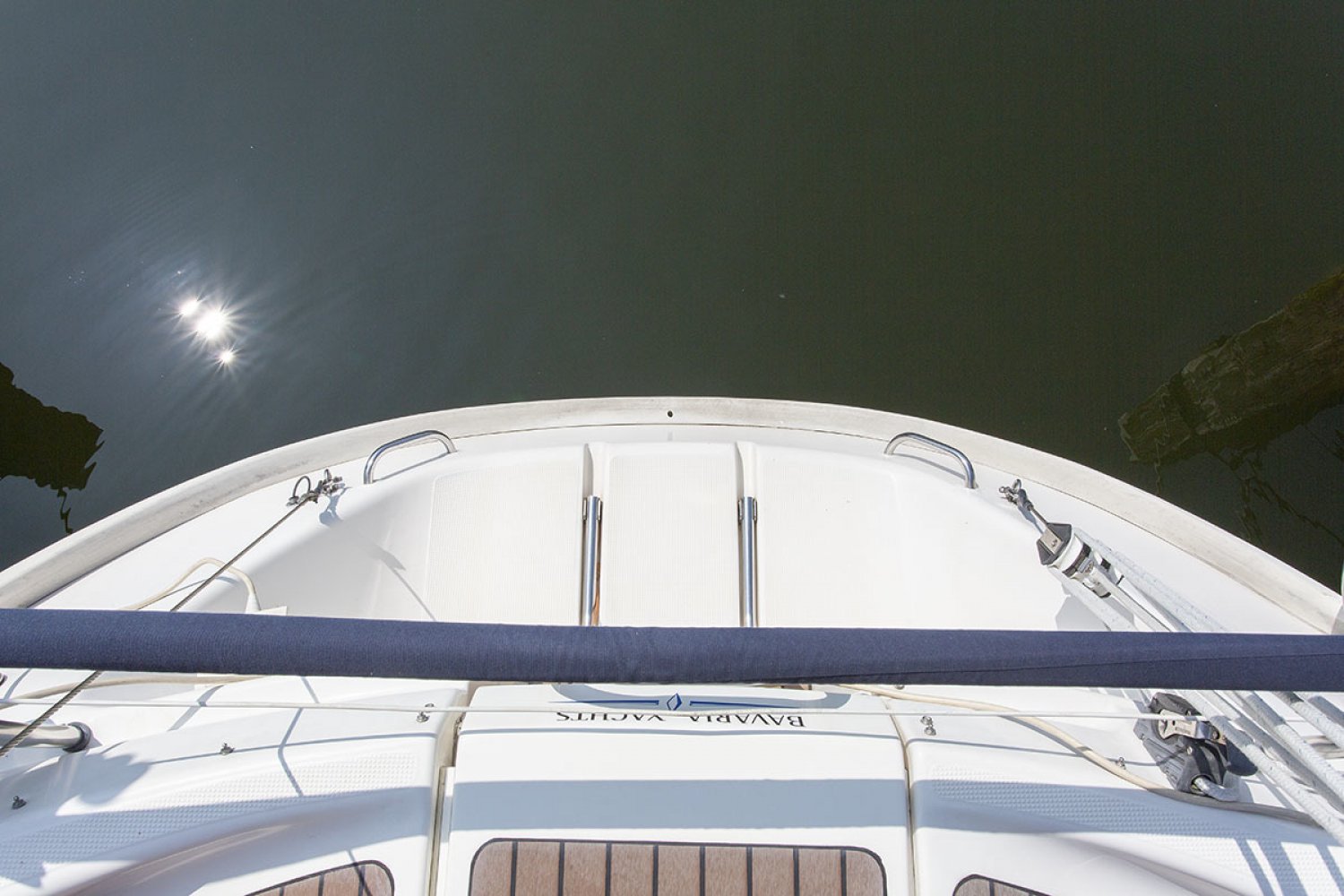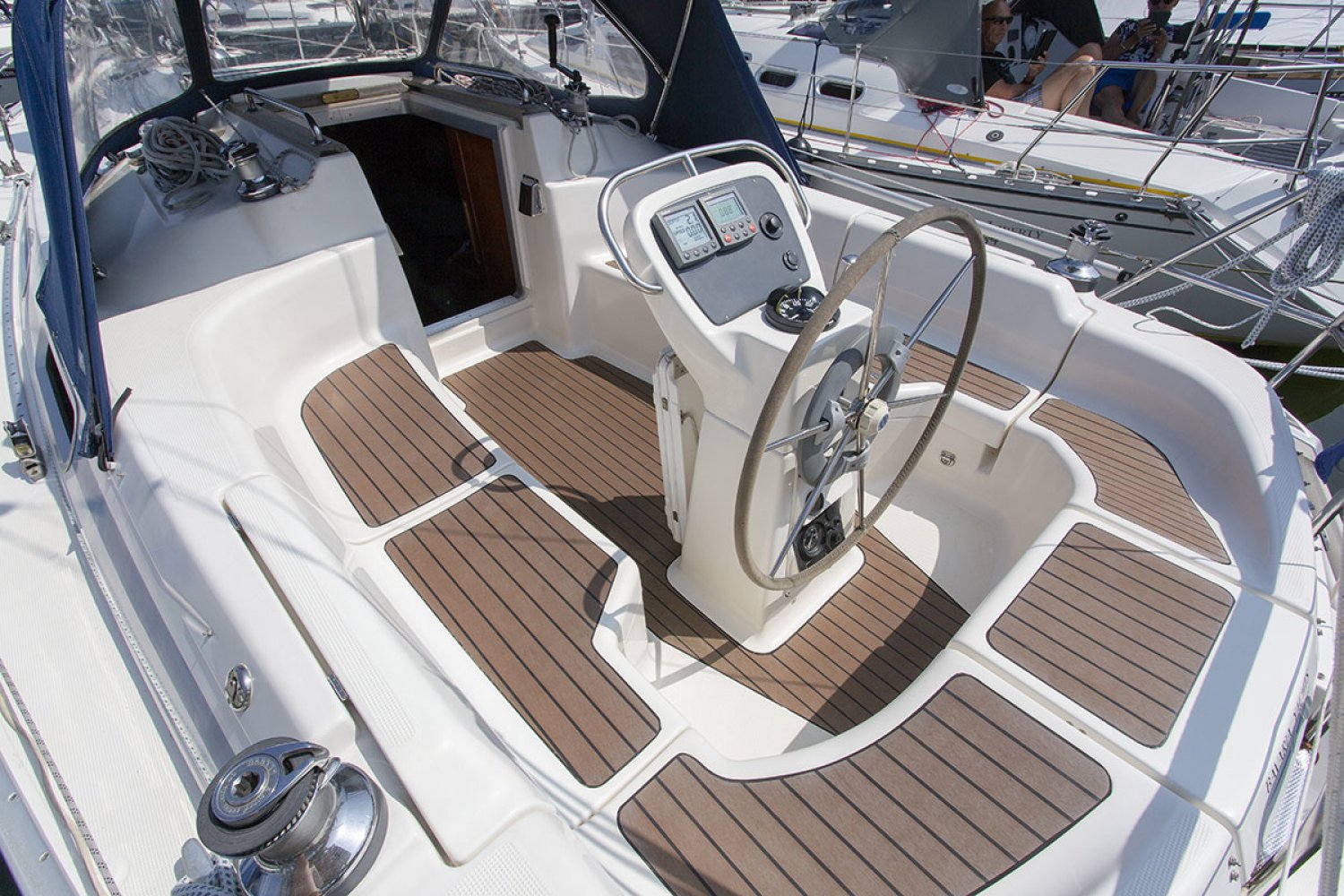 Deze Bavaria 34 in 2 cabine-indeling is een ideale familie cruiser. De boot is van eerste eigenaar en werd steeds professioneel onderhouden sinds tewaterlating in het voorjaar van 2000. De boot is  redelijk onderhouds arm onder andere omdat de kuip is voorzien van kunststof teak op de banken. Aan stuurboord treft u een diepe bakskist met daarin voldoende ruimte voor grote dingen zoals vouwfietsen. Aan bakboord is een ondieper bakskist. De boot is makkelijk te varen, en vanaf het roer heeft men goed overzicht en controle over de boot. Op de stuurstand zijn de navigatie-instrumenten en de autopilot bedieningspaneel.   Het interieur is ruim en praktisch ingericht met een uitstekende afwerking van het houtwerk en veel kastruimte. De kussens zijn recent vernieuwd.  De L-vormige keuken is ruim en modern ingericht en uitgerust met fornuis, oven, koelbox en gootsteen. Aan stuurboord is de kaartentafel met schakelbord en VHF radio. Er zijn vier vaste slaapplaatsen in twee dubbele hutten. De voorkajuit heeft een groot bed in V-vorm. Rechts van de kajuitingang is de toiletruimte met veel bergruimte, onder andere voor zeilkleding. De motorruimte is  goed bereikbaar via de scharnieren de trap.