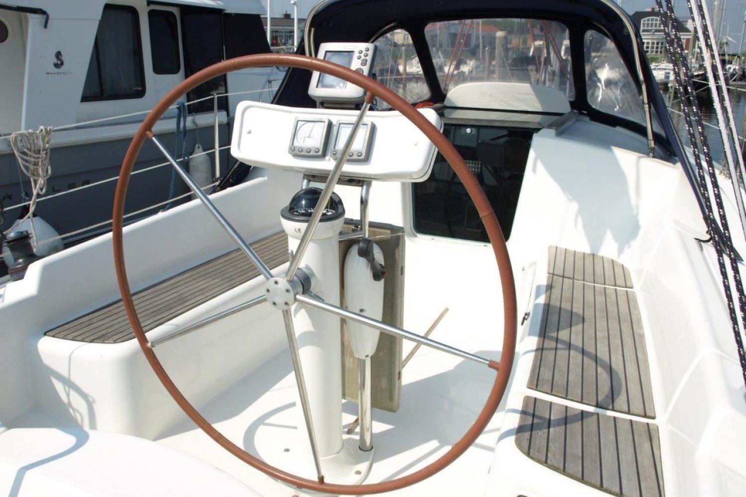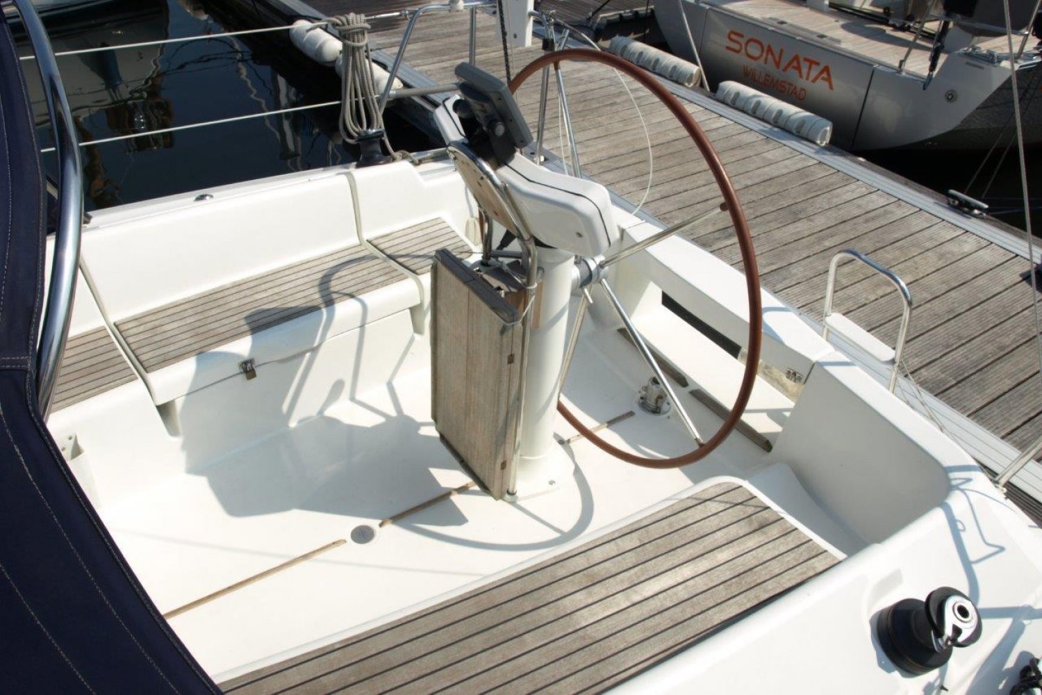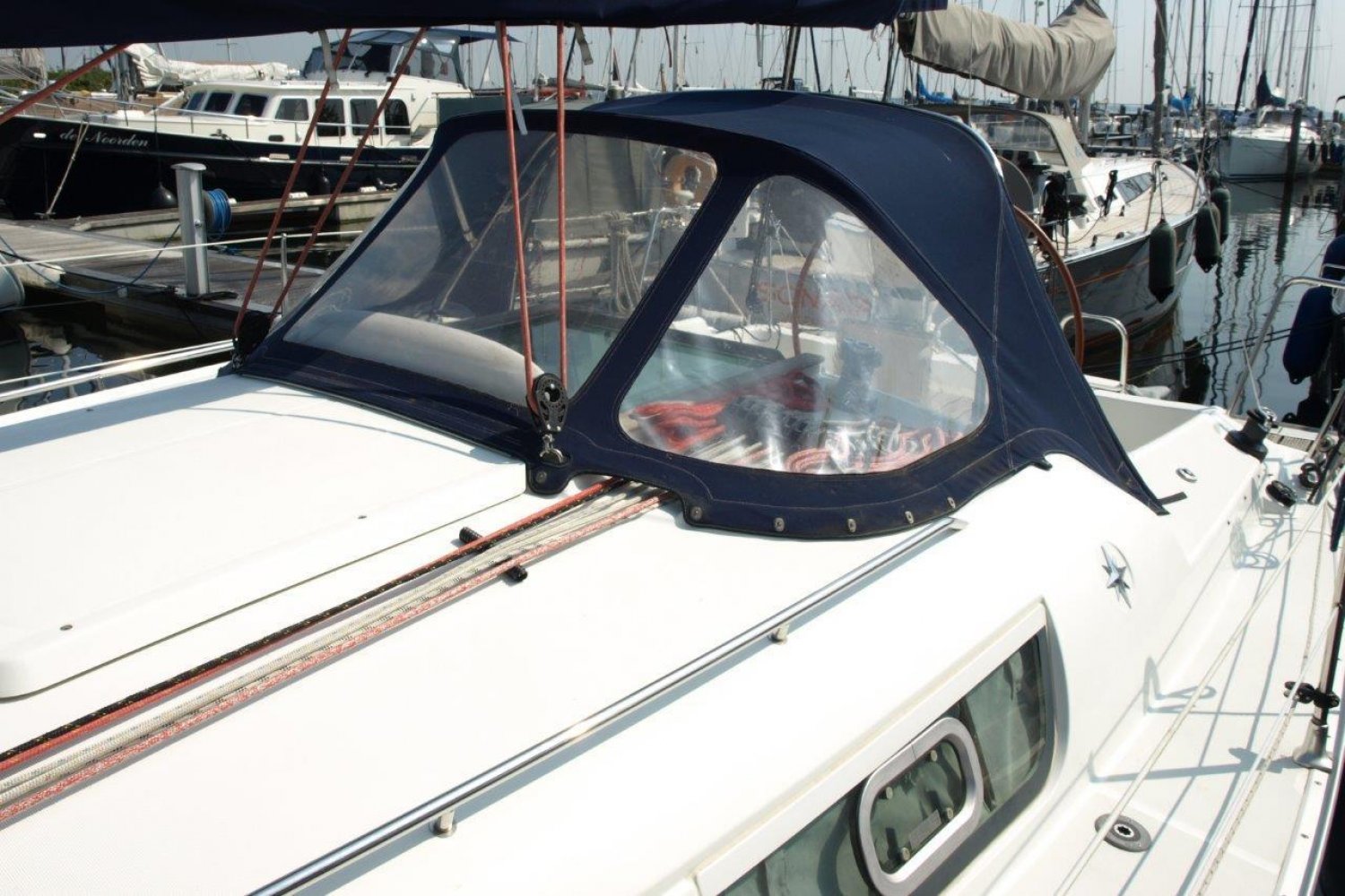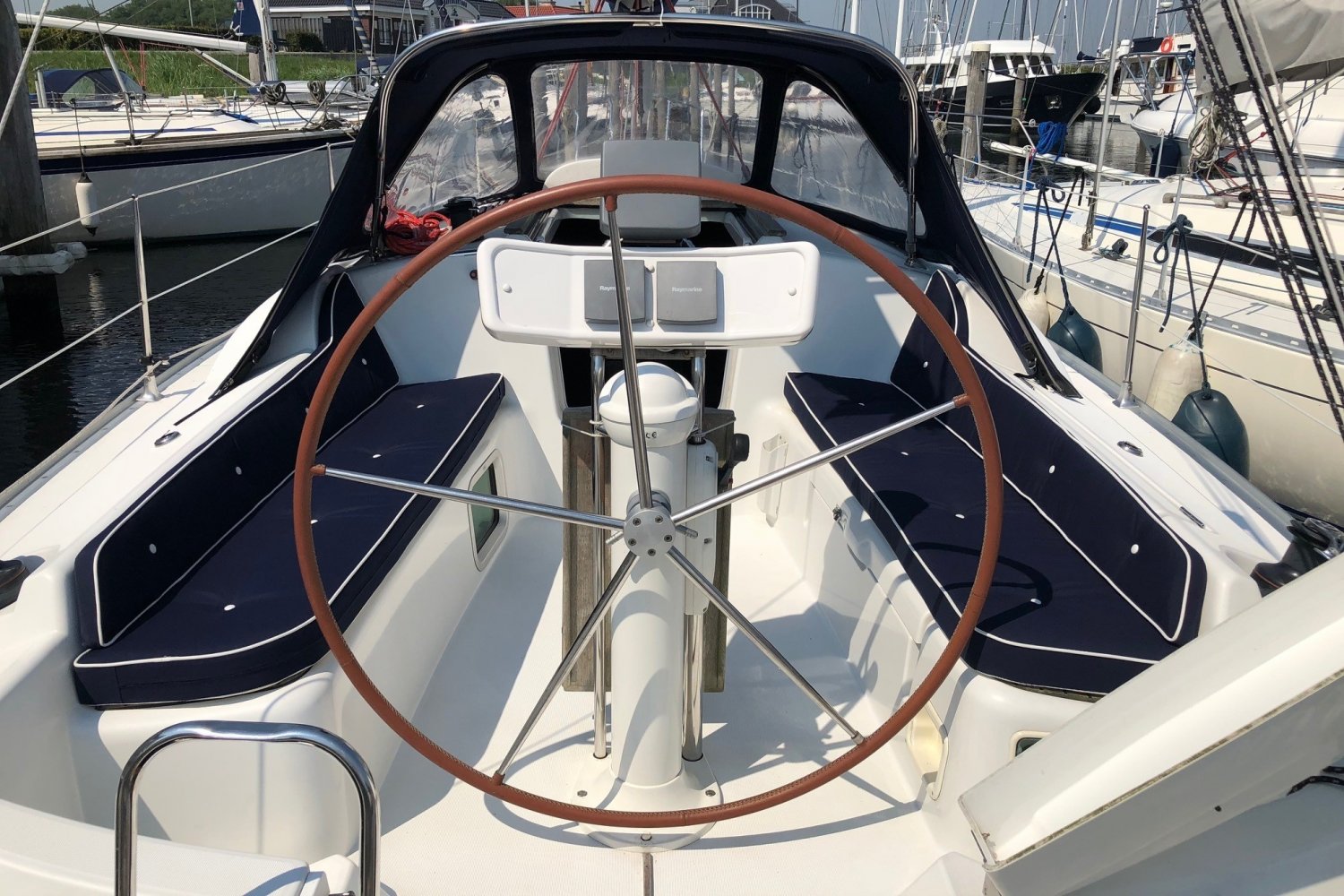 Eenmaal aan boord van dit schip valt direct op hoe ruim de kuip daadwerkelijk is, de doorgang van het zwemplatform naar de kuip is erg gemakkelijk. Van achter het stuurwiel heeft u een perfect uitzicht over het schip en de omgeving. De buiskap + volledige kuiptent bieden veel bescherming en vergroten de bruikbare leefruimte aanzienlijk.