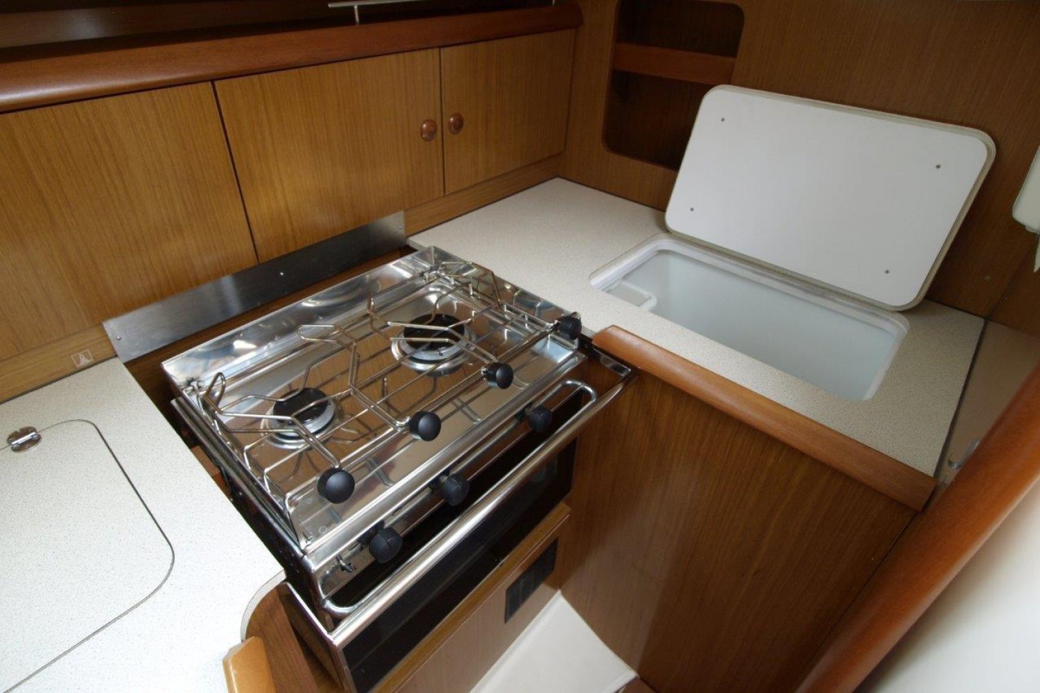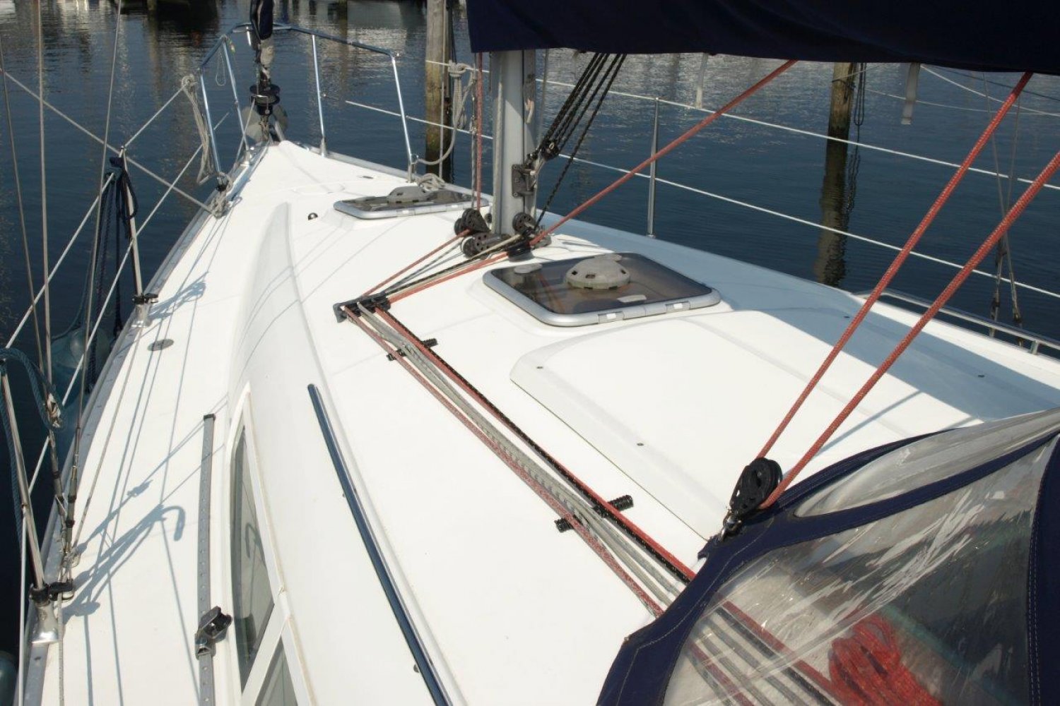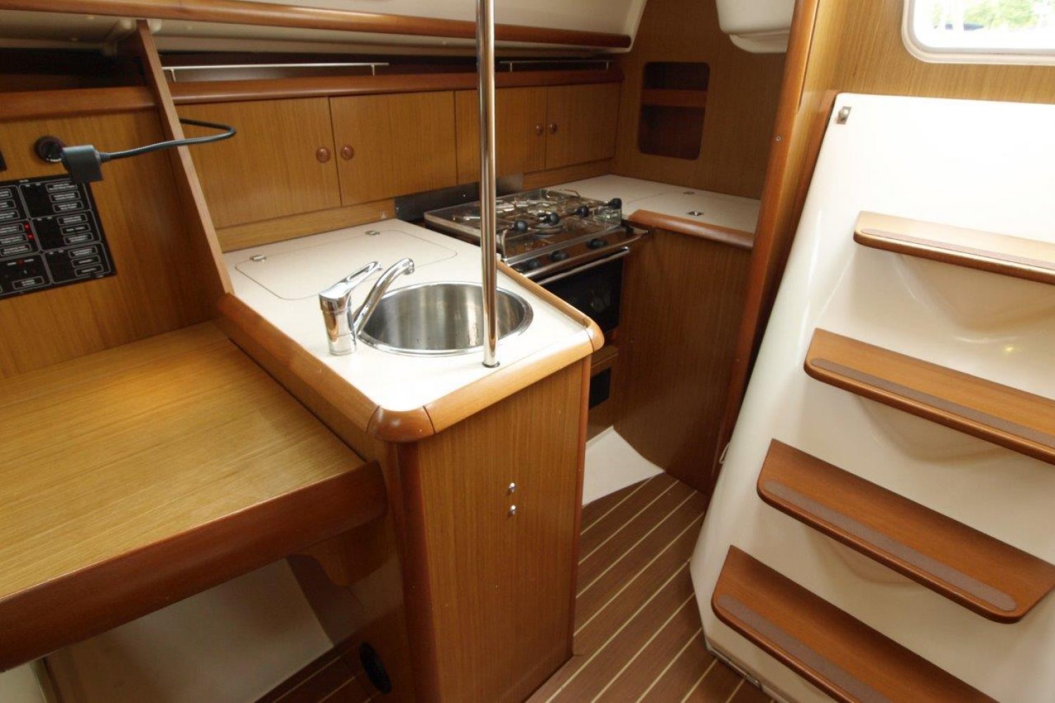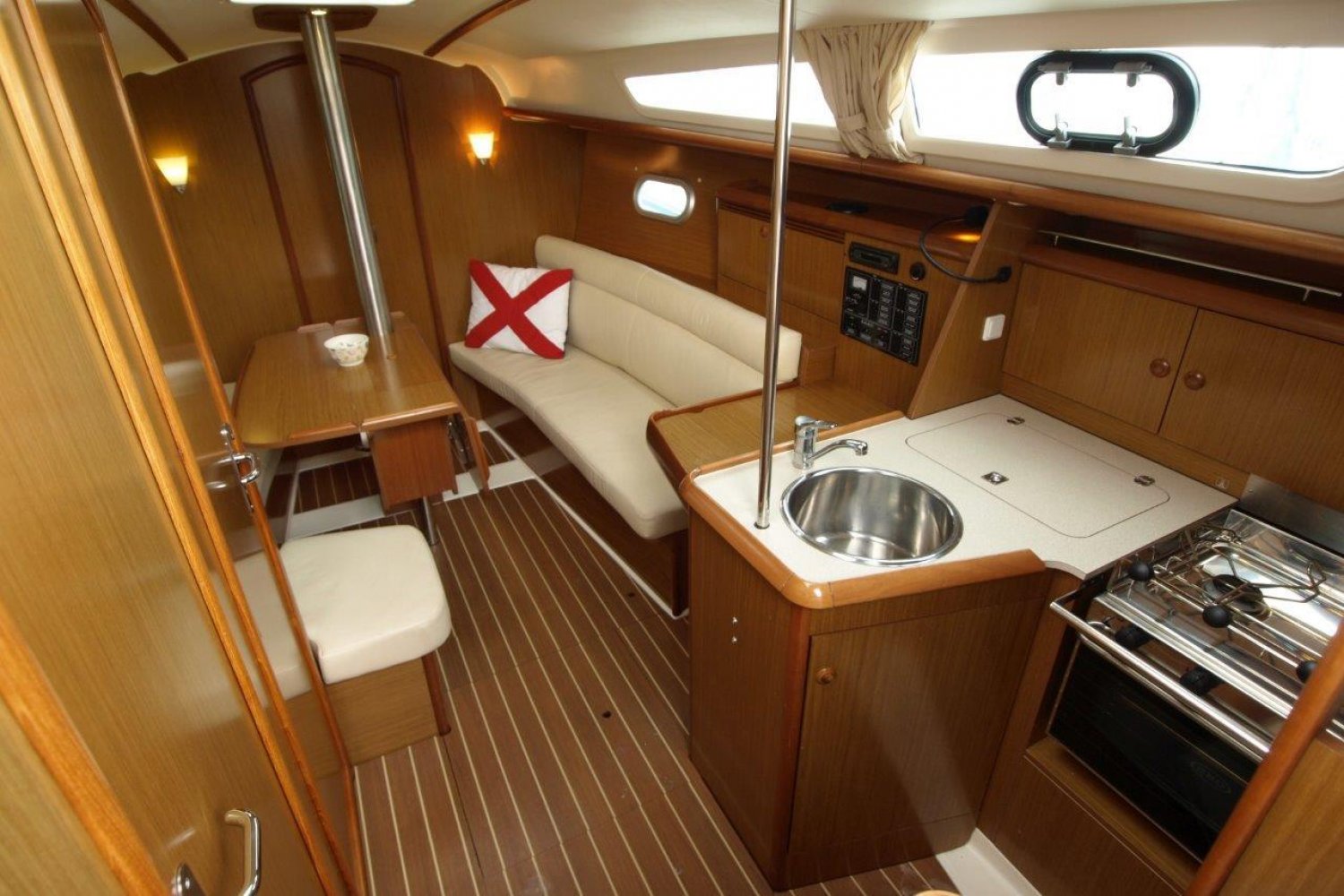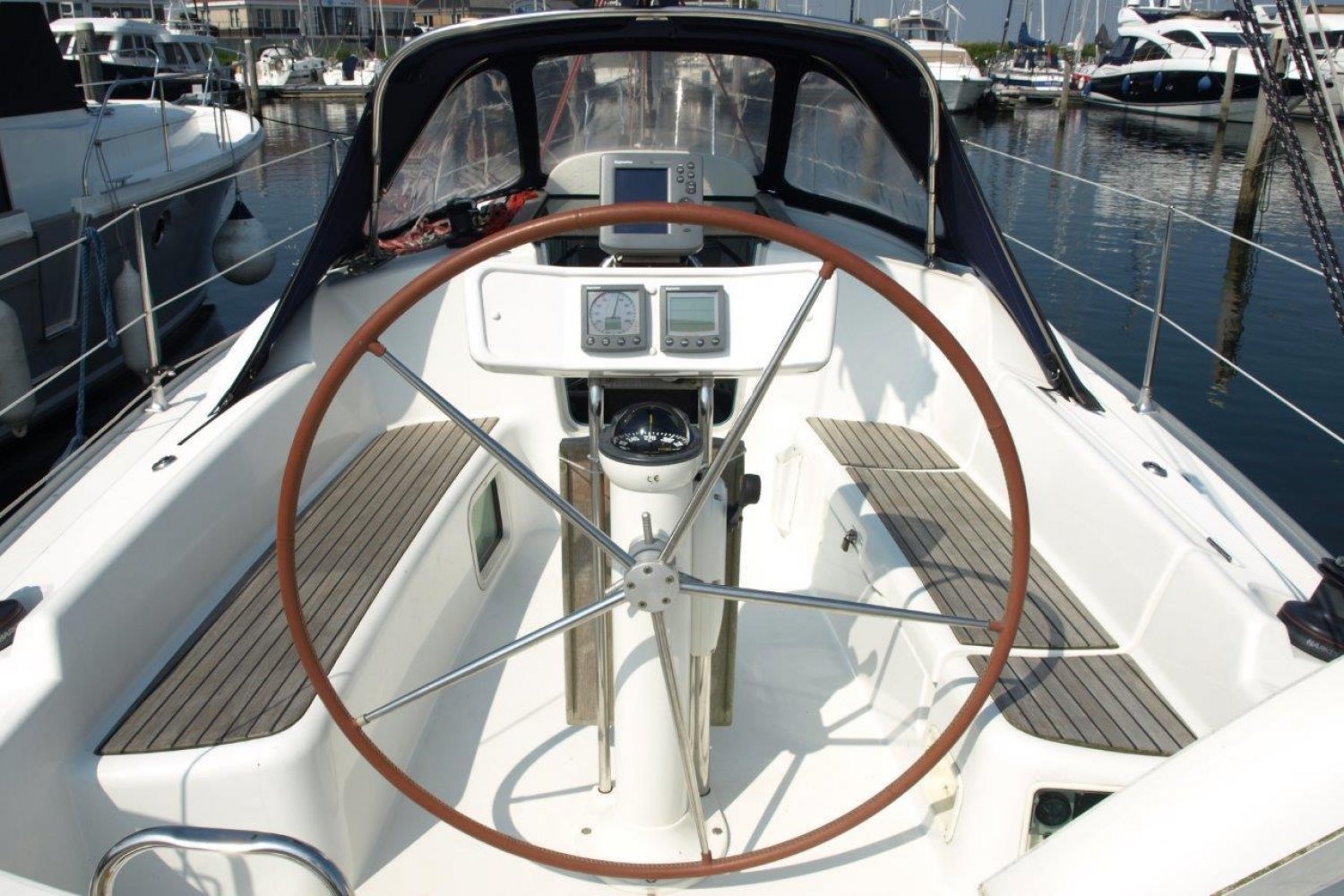Eenmaal aan boord van dit schip valt direct op hoe ruim de kuip daadwerkelijk is, de doorgang van het zwemplatform naar de kuip is erg gemakkelijk. Van achter het stuurwiel heeft u een perfect uitzicht over het schip en de omgeving. De buiskap + volledige kuiptent bieden veel bescherming en vergroten de bruikbare leefruimte aanzienlijk.