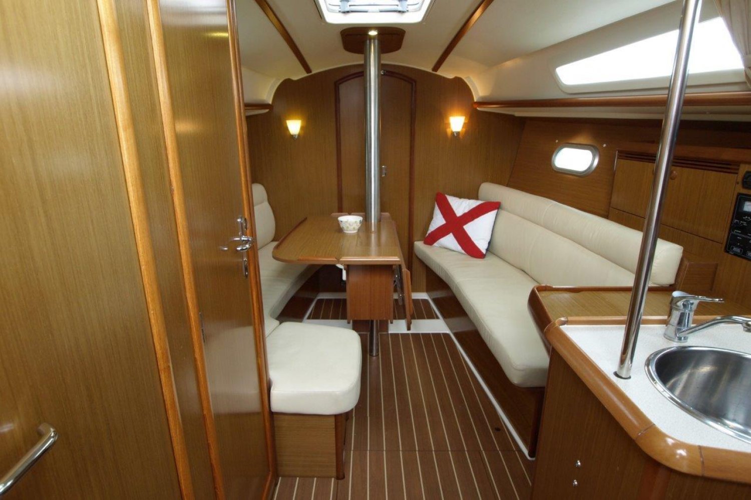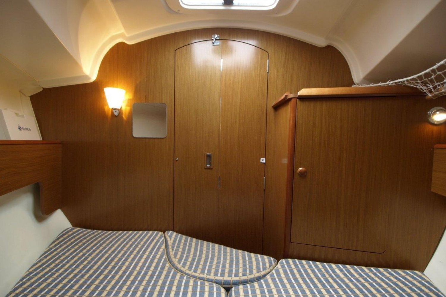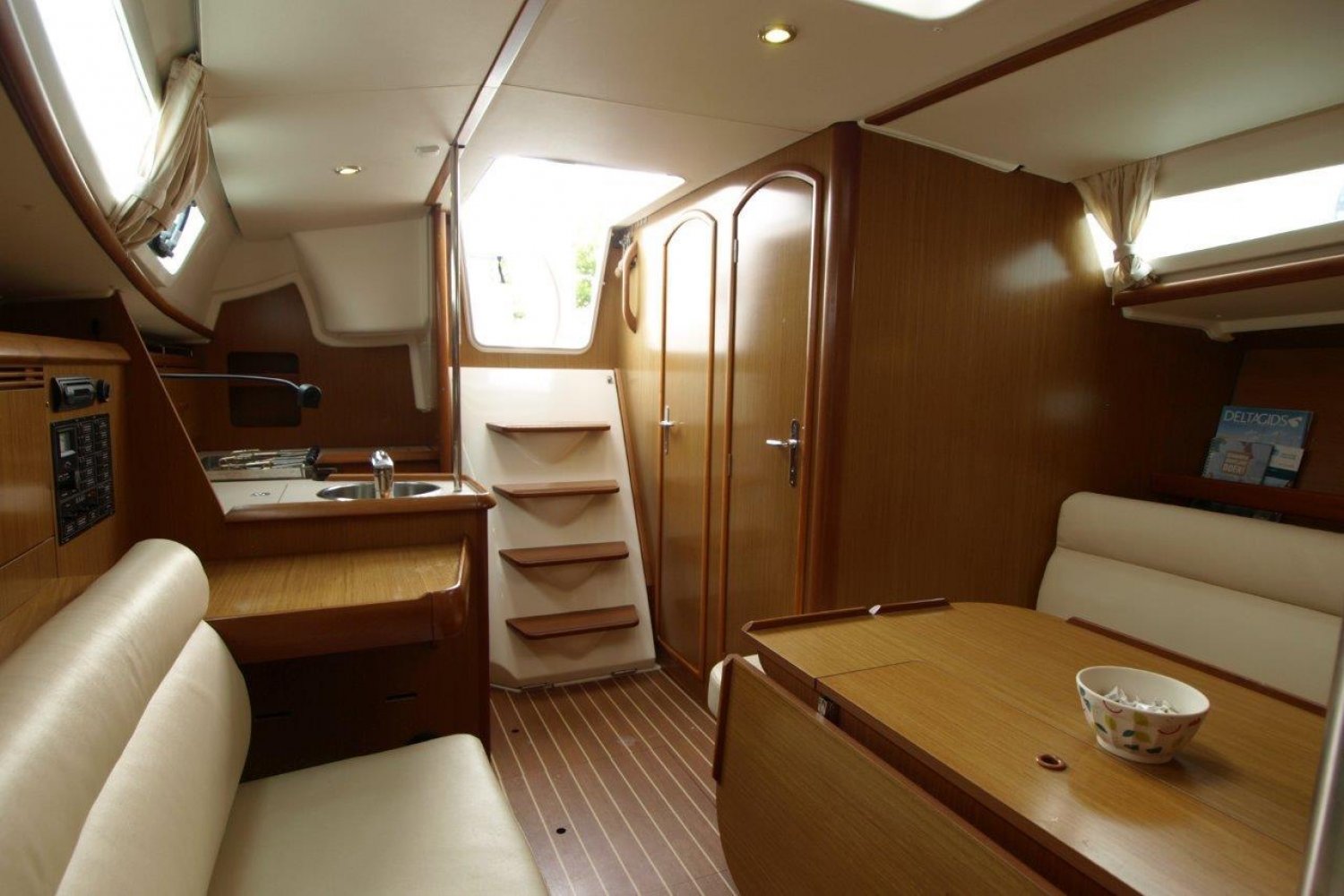 Binnen in het schip treft u een gezellig, licht en ruim interieur aan. Achter in het schip treft u de eerste dubbele hut, met een bijzonder ruim bed en voldoende opbergmogelijkheden. In de piek van het schip is de tweede dubbele hut. Verder is dit schip uiteraard voorzien van een natte cel en een praktische kombuis.