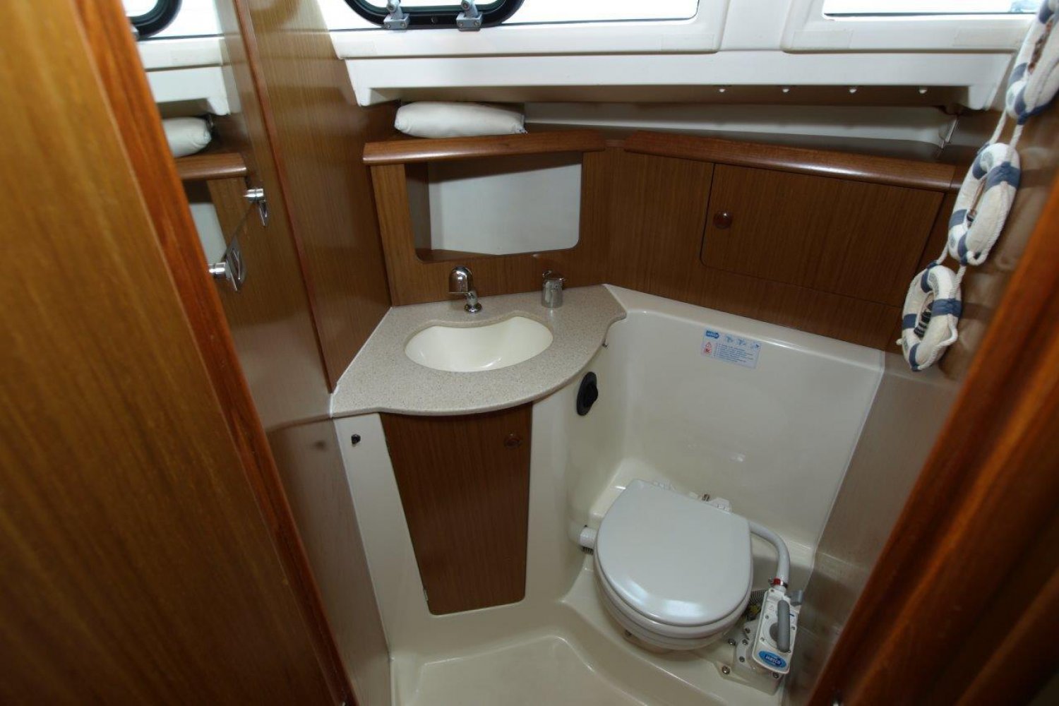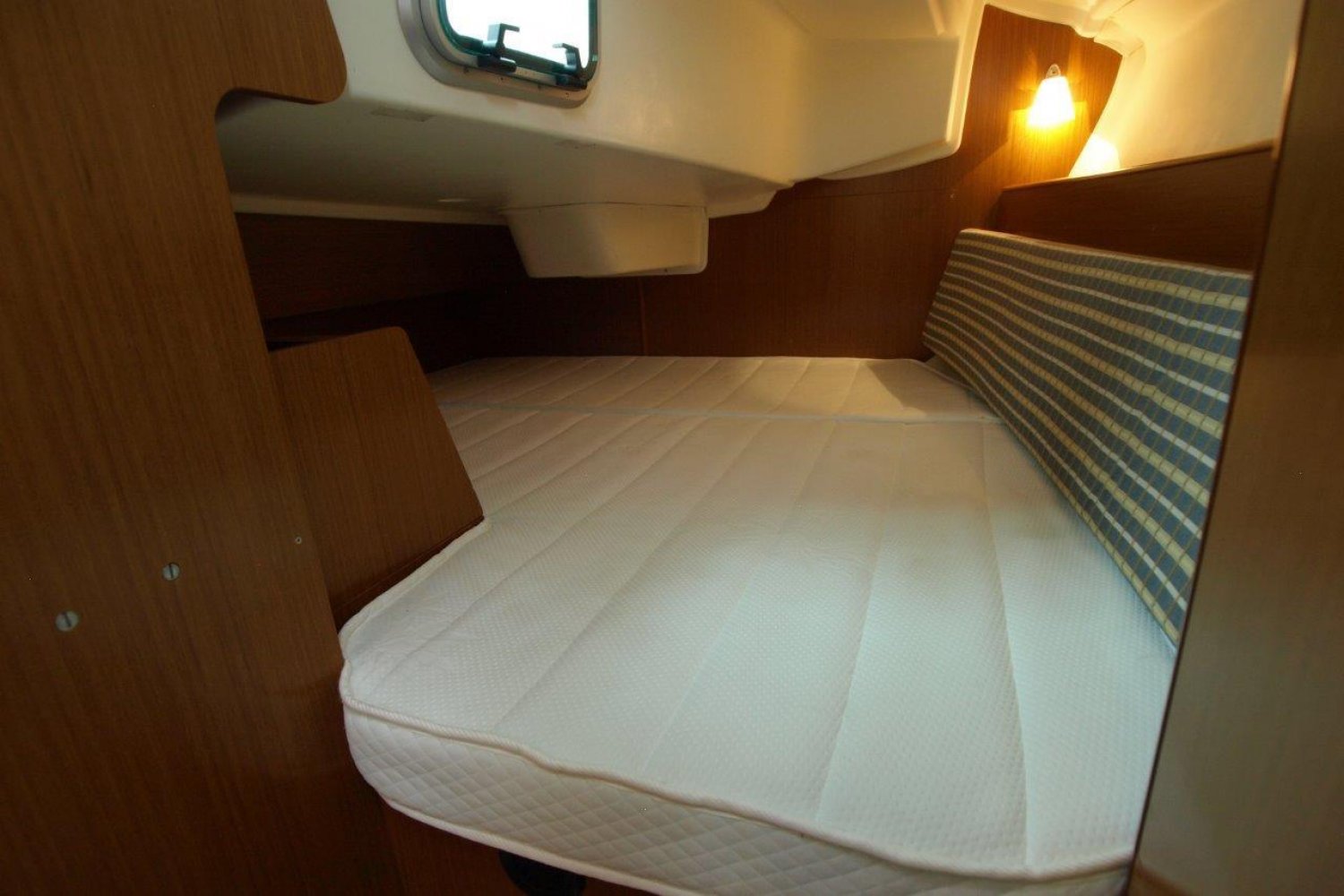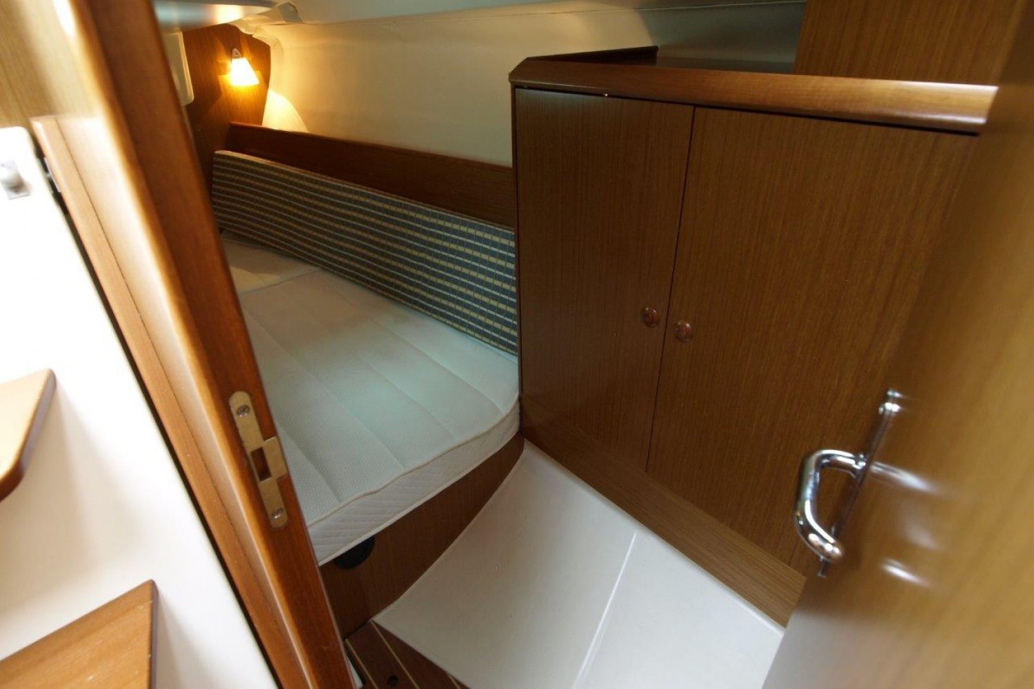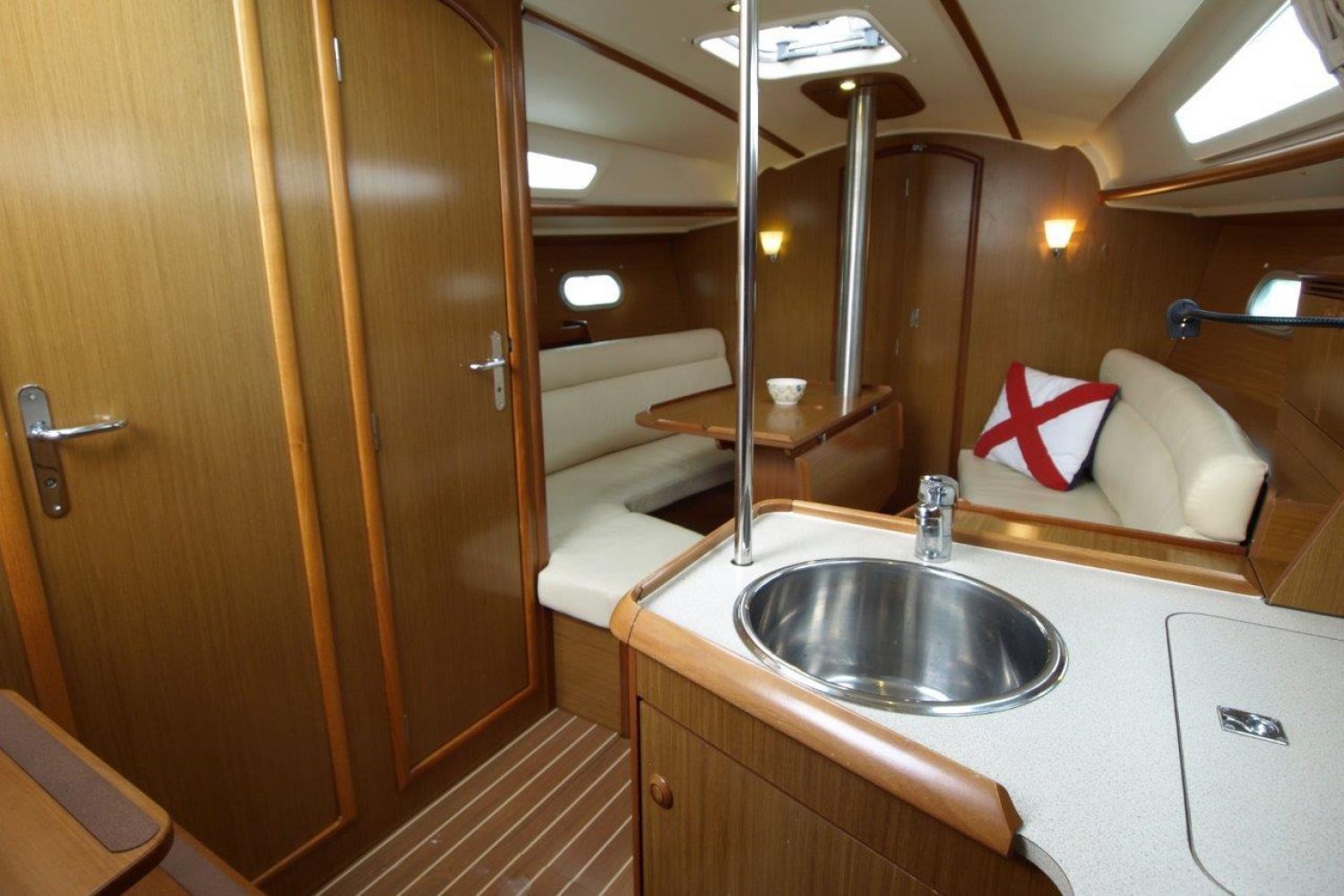 Binnen in het schip treft u een gezellig, licht en ruim interieur aan. Achter in het schip treft u de eerste dubbele hut, met een bijzonder ruim bed en voldoende opbergmogelijkheden. In de piek van het schip is de tweede dubbele hut. Verder is dit schip uiteraard voorzien van een natte cel en een praktische kombuis.