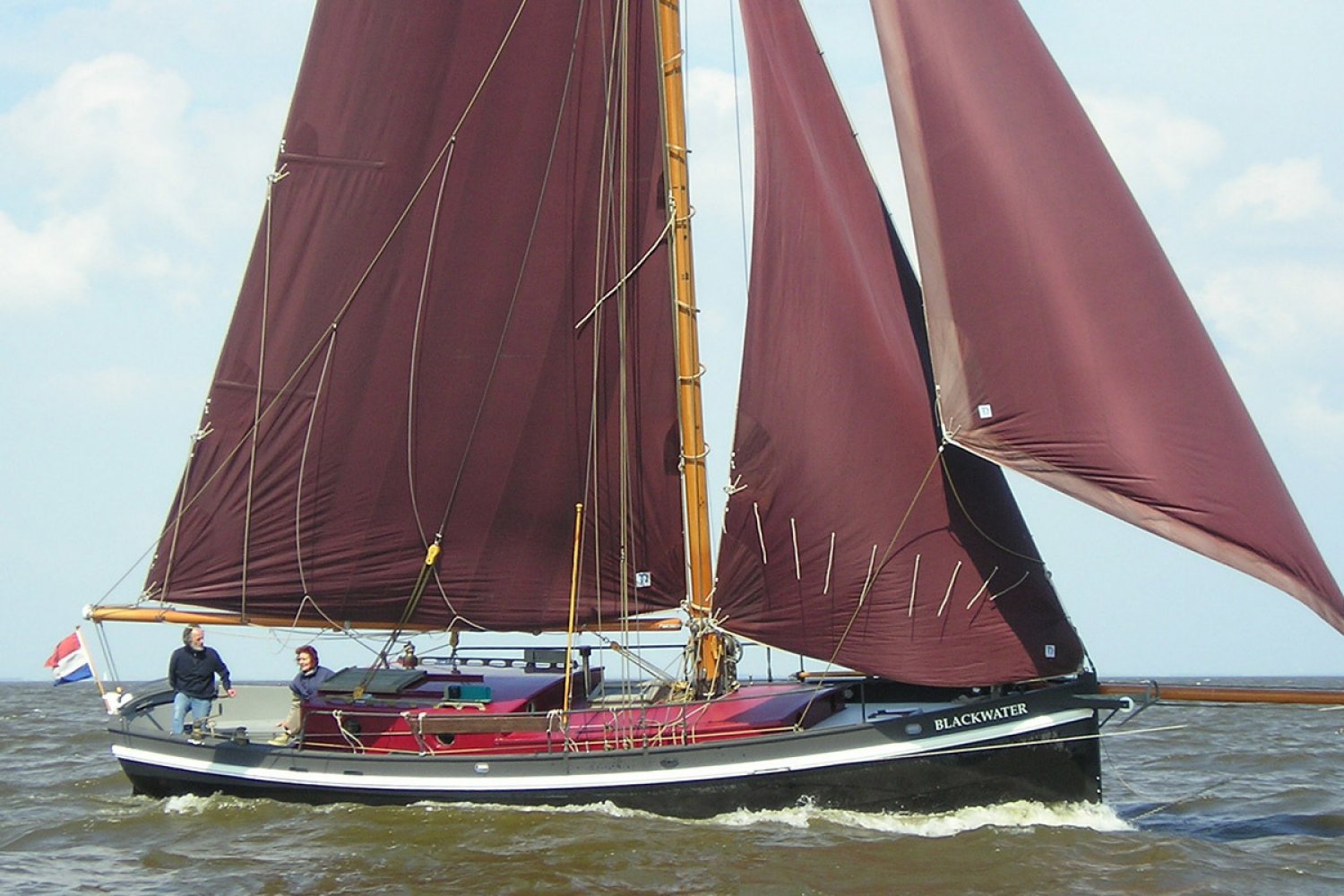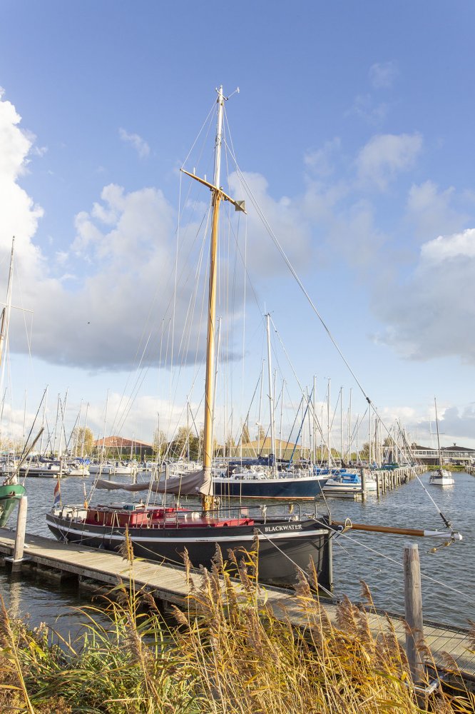 Deze Noordkaper 35 C heeft een diepgang van 120 tot 260 cm en een lengte over alles van 14.50 meter. De Noordkaper 35 C die wij u namens de eerste eigenaar aanbieden is een echte eye-catcher. Met haar zwarte romp en gaffeltuig met vaste boegspriet is zij een opvallende verschijning op het water. Het ontwerp is van Martin Bekebrede en het casco is gebouwd bij Kroes te Leeuwarden (NL). De boot is onder eigen regie gebouwd door de eigenaren "Blackwater" heeft zich inmiddels op vele tochten op zee bewezen als een solide en zeewaardig jacht. Door de geringe diepgang met opgehaald zwaard is zij tevens geschikt voor ondiepe wateren en kan zelfs goed rechtop droogvallen met wadpoten. Deze combinatie maakt haar vrij uniek. De kuip is erg ruim en de dekken breed en goed toegankelijk. Alle beslag is robuust uitgevoerd en praktisch geplaatst zodat de boot met een kleine bemanning goed is te hanteren. Het zwaard wordt binnen bediend met een licht lopende handlier. Binnen heerst een gezellige nautische sfeer. Bij binnenkomst is gelijk rechts de navigatie hoek met de nodige apparatuur. Links van de zwaardkast is de kombuis geplaatst met er voor de zithoek. In het vooronder is een ruime tweepersoons hut. Voor gasten is slaapplaats op de banken. In het achterschip is een toiletruimte. Er is een grote potkachel midden in de salon. De voortstuwing komt van de 50 pk Nanni scheepsdiesel.