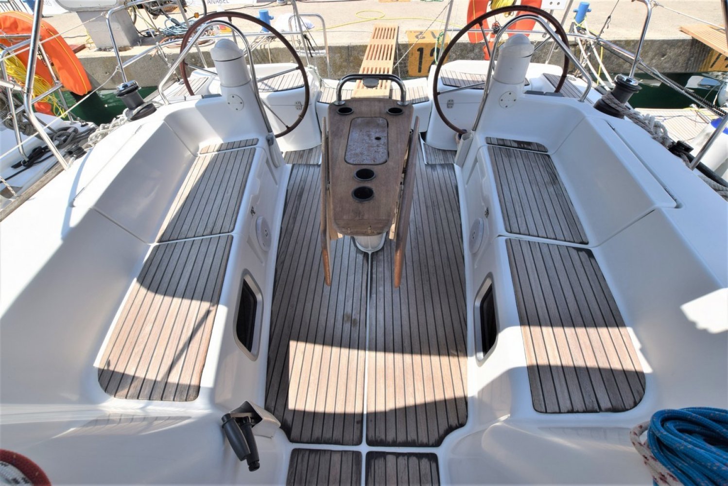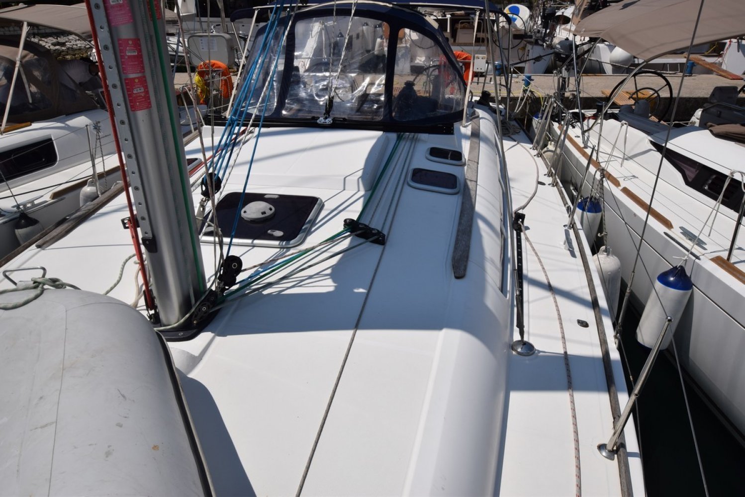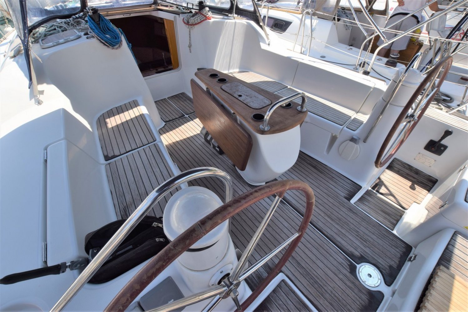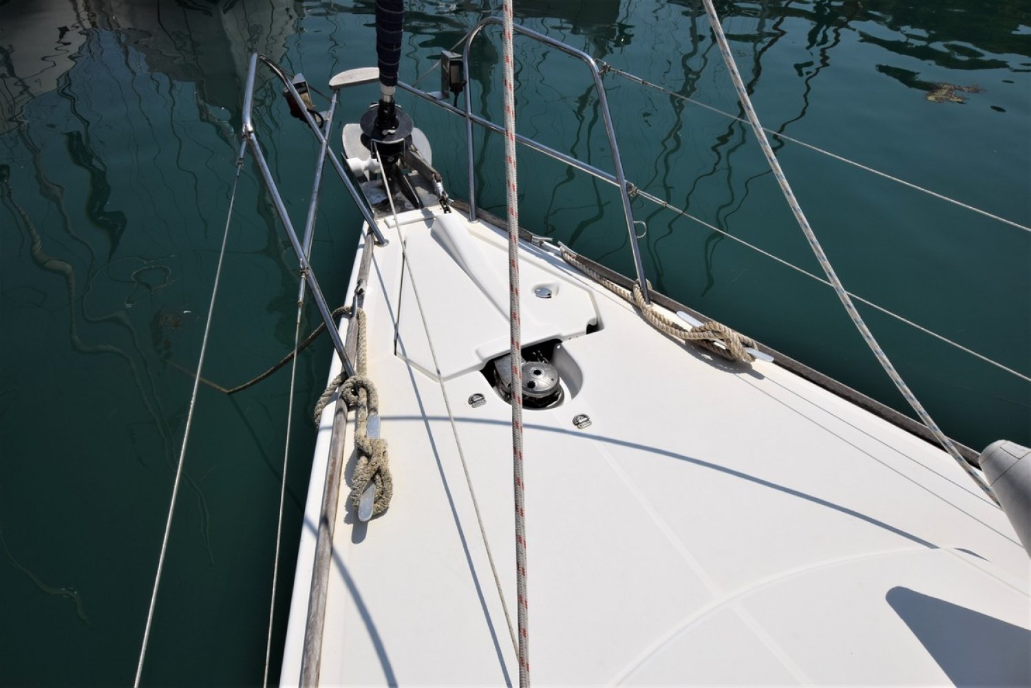 Equipment Furling genoa Lazy Jacks Lazy bag Bimini Sprayhood Cockpit table Teak in cockpit Bow thruster Autopilot Tri data (depth, speed, wind) Life raft Battery charger Radio/CD player Double berth compelement to saloon Electric windlass Anchoring kit Mooring kit Stern cockpit shower Shore power Heating